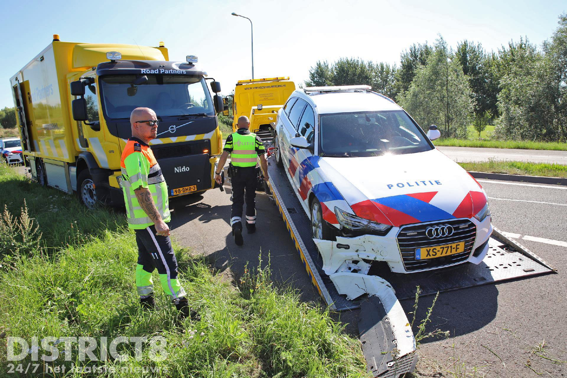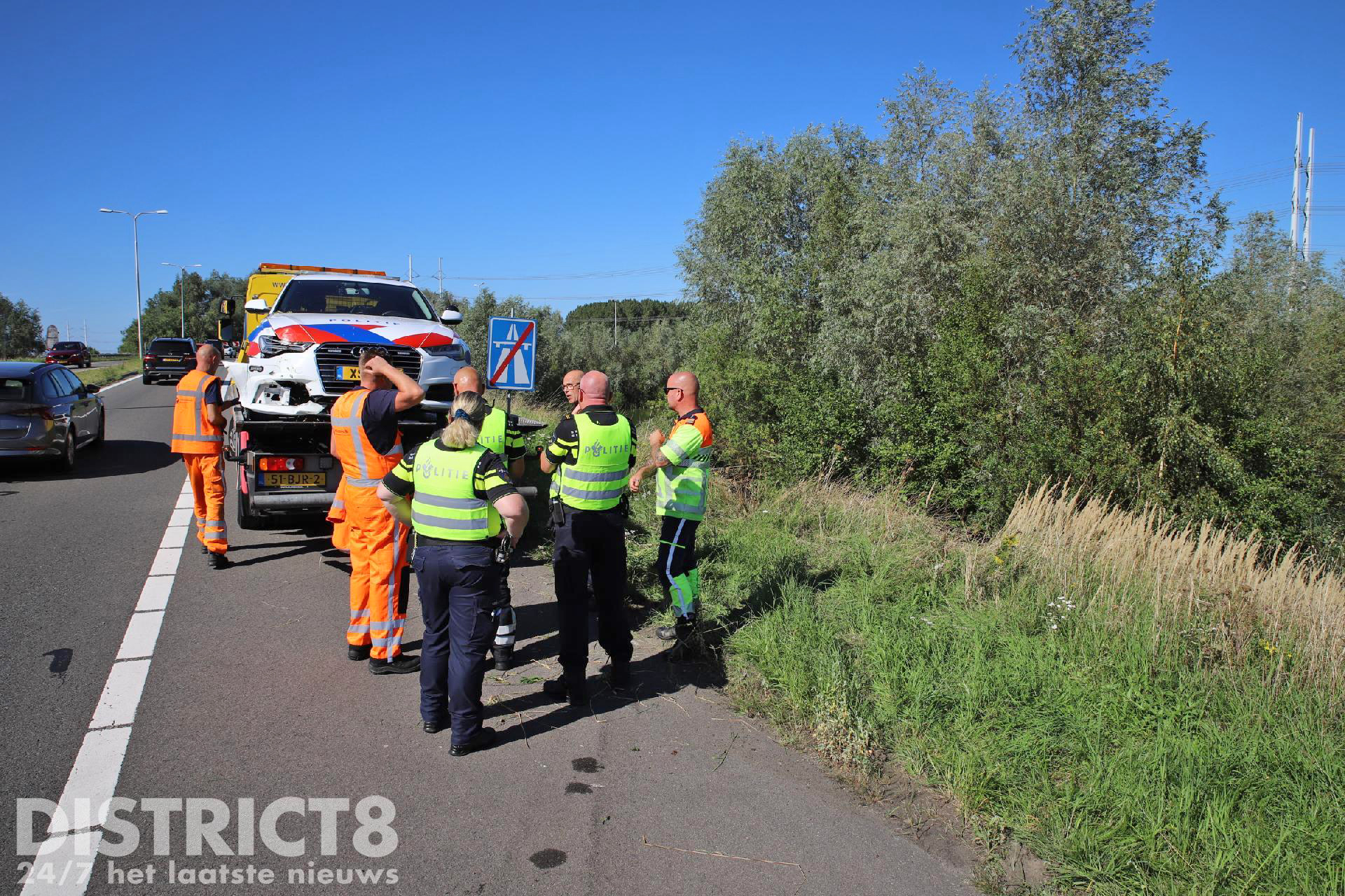 De wagen kwam onderaan het talud vast te zitten in de bosschages. De agenten die in de wagen zaten konden gelukkig zelfstandig uit de auto stappen en raakten volgens een woordvoerster van de politie niet gewond. Na het ongeval zijn collega’s van de agenten en Rijkswaterstaat ter plaatse gekomen.