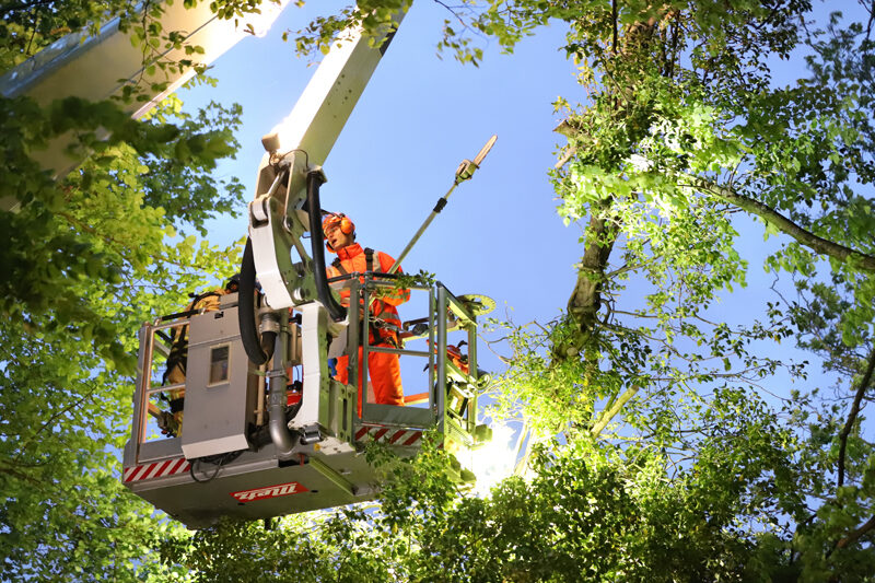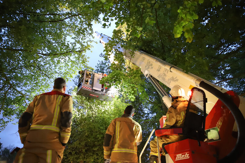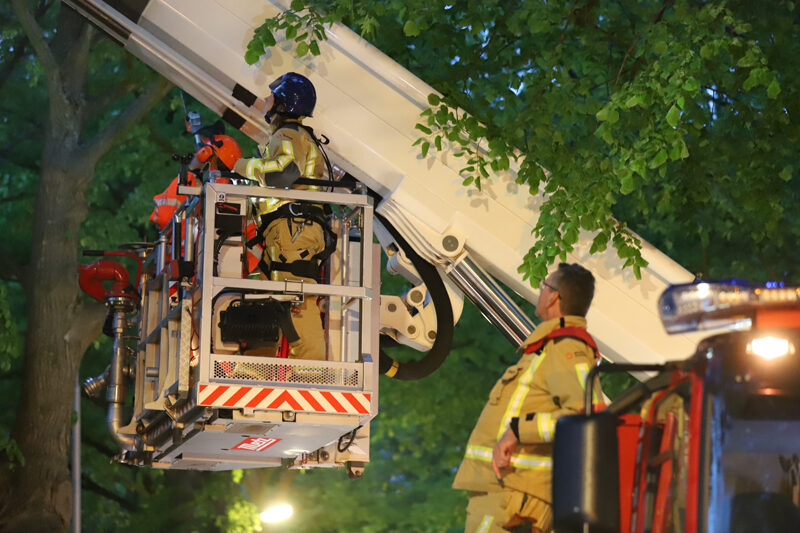 De hoogwerker kwam ter plaatse. Door precies zaagwerk door de bemanning van de hoogwerker kon de tak veilig worden verwijderd en bleef de geparkeerde auto bespaard.