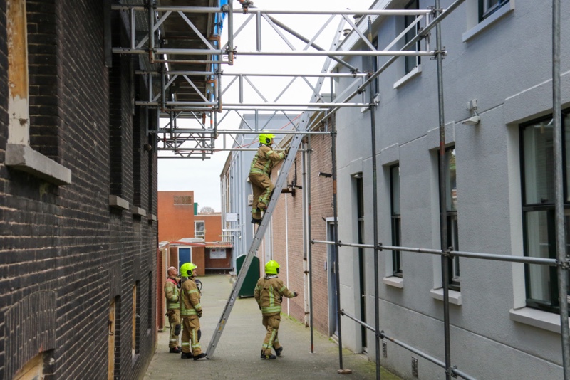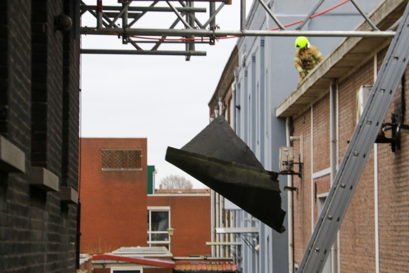 Het stuk van 25 x 4 meter ongeveer moest door de brandweerlieden in stukken gesneden worden om naar beneden gegooid te kunnen worden.