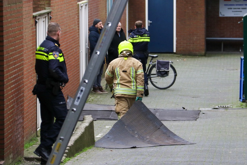 Het hele deel was losgerukt door de storm. De politie probeerde in contact te komen met de eigenaren omdat zodra het zou gaan regenen er een enorme lekkage zou ontstaan in het pand.
