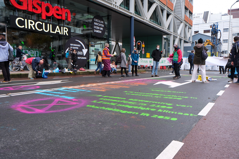Het stukje Theresiastraat tussen de beide zijden van de Prins Clauslaan hebben zij volledig geblokkeerd met tientallen actievoerders die spandoeken vasthouden. Daarnaast zijn met graffiti teksten op het wegdek gespoten.