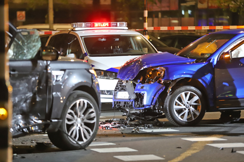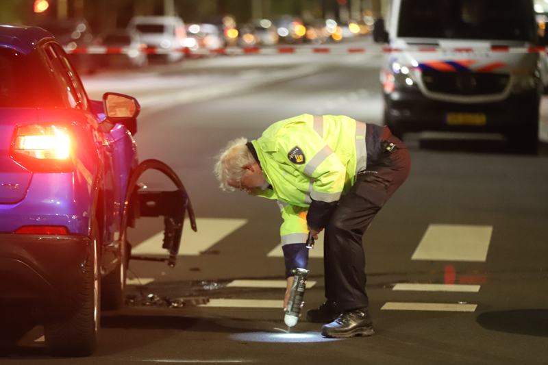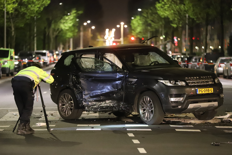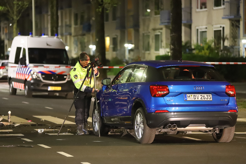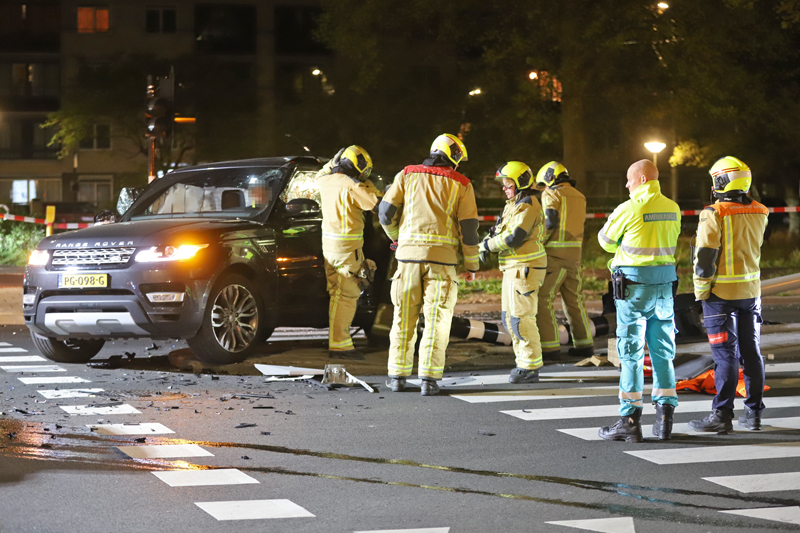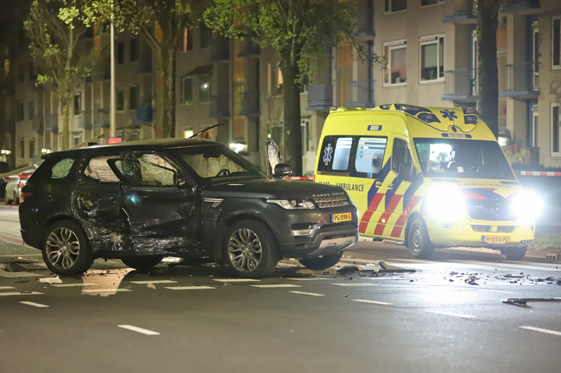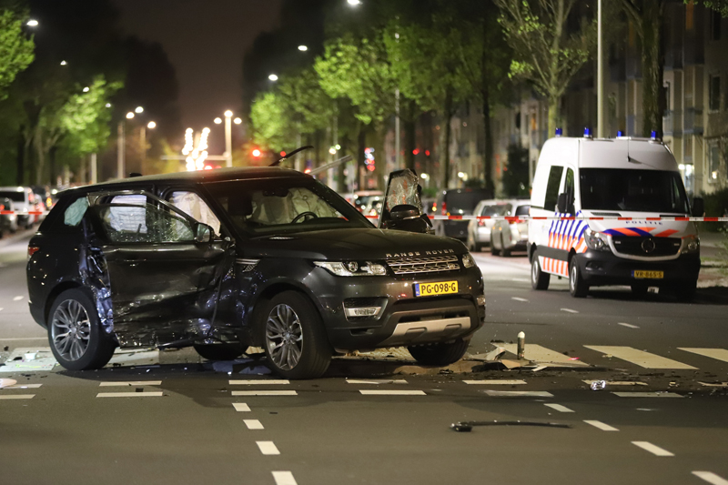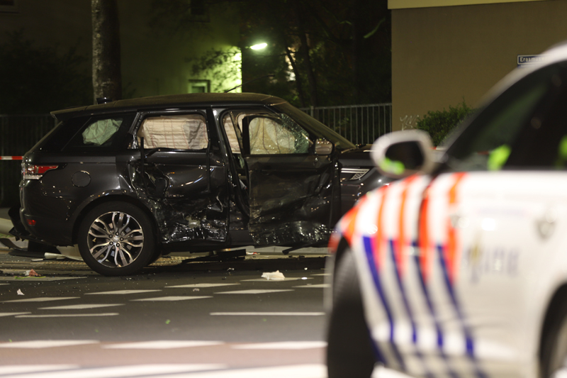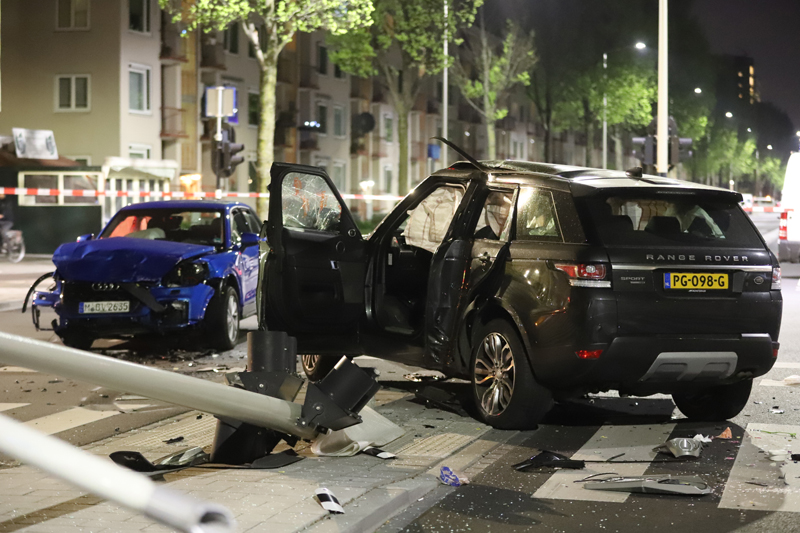 Het achtervolgde voertuig -een blauwe huur auto met een Duits kenteken- knalde op de kruising met de Betje Wolffstraat op de zwarte Range Rover. De bestuurder van deze zwarte Range Rover kwam door de klap vast te zitten.