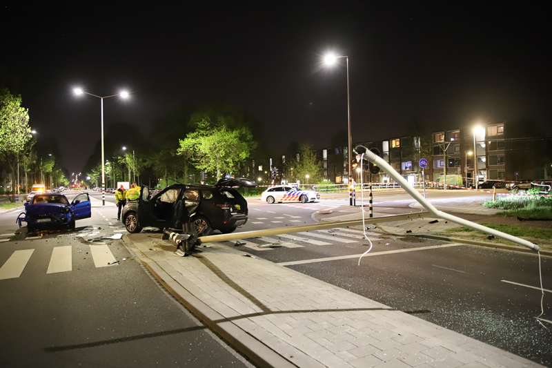 De aangehouden verdachte is door de politie overgebracht naar het politiebureau. De ravage op het kruispunt is enorm, naast de twee beschadigde voertuigen is ook een lantaarnpaal geraakt.