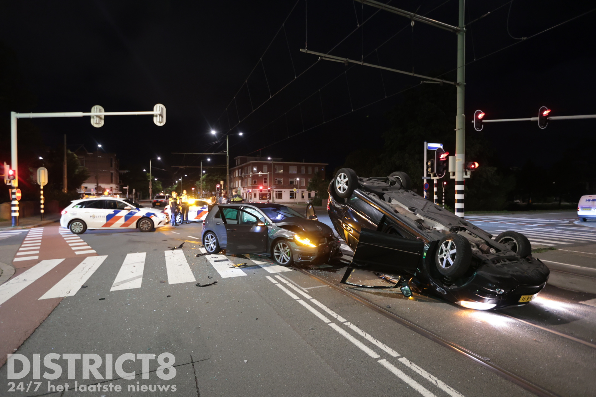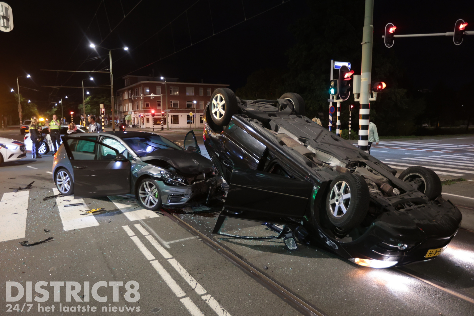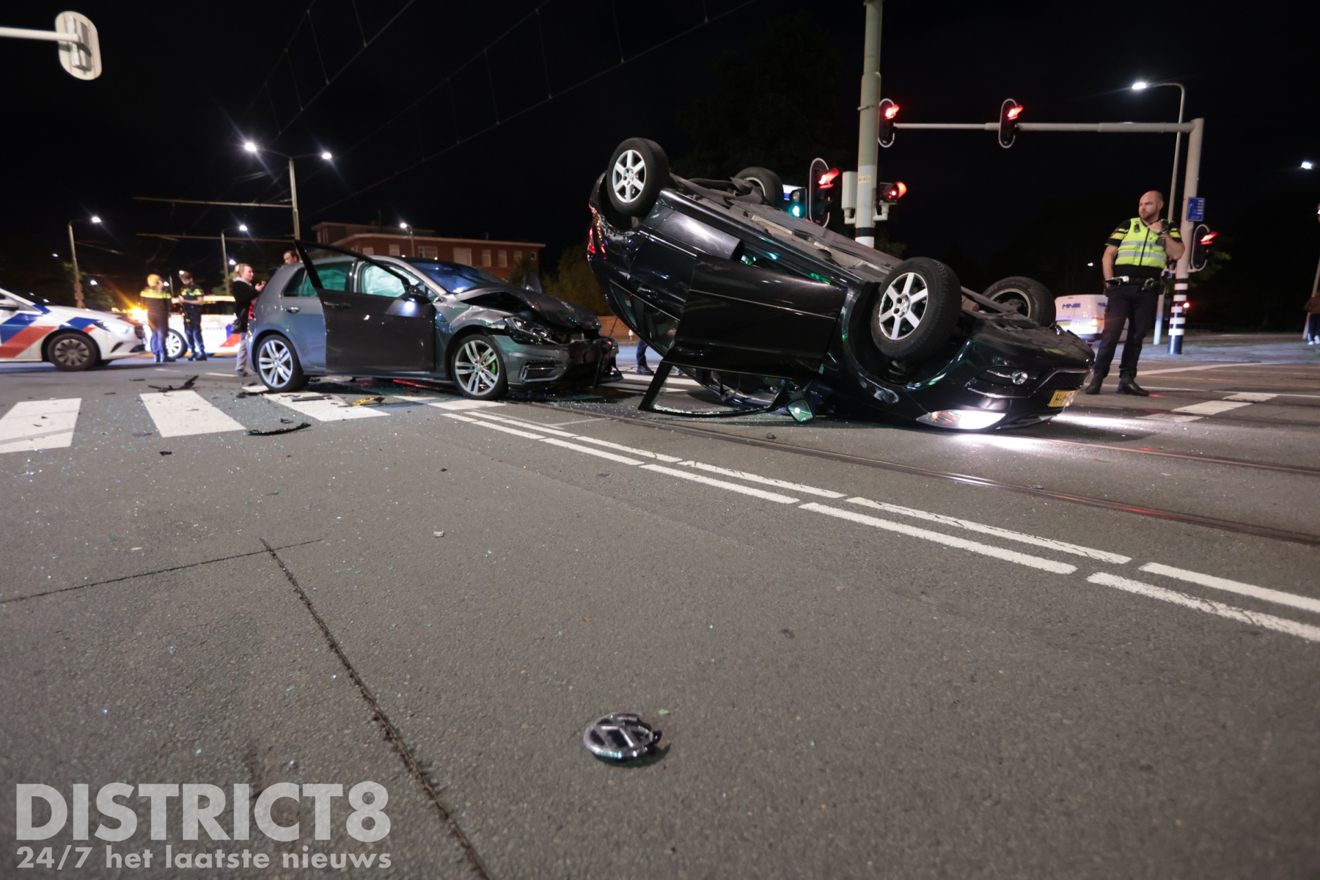Den Haag – In de nacht van maandag 16 september om dinsdag 17 september is er een personenauto op zijn kop belandt na in botsing te zijn gekomen met een andere personenauto op de Laan van Nieuw Oost-Indië kruising Schenkkade in Den Haag.