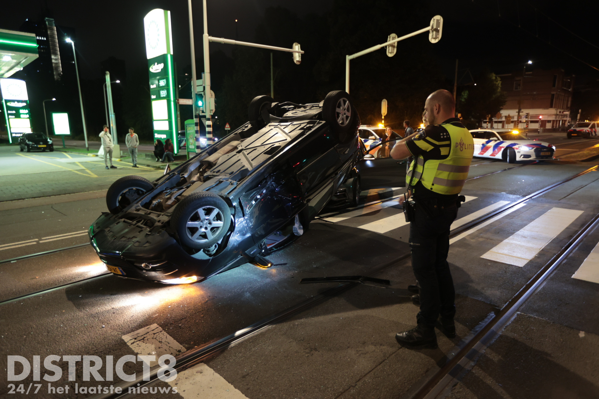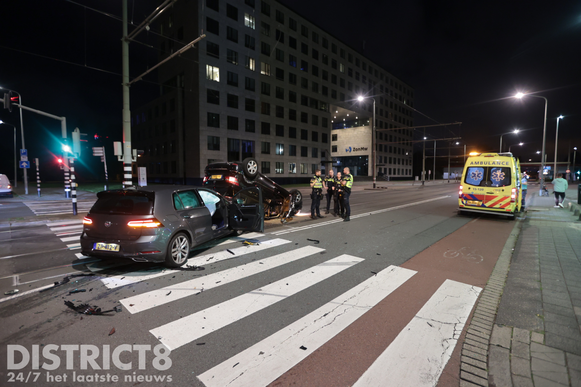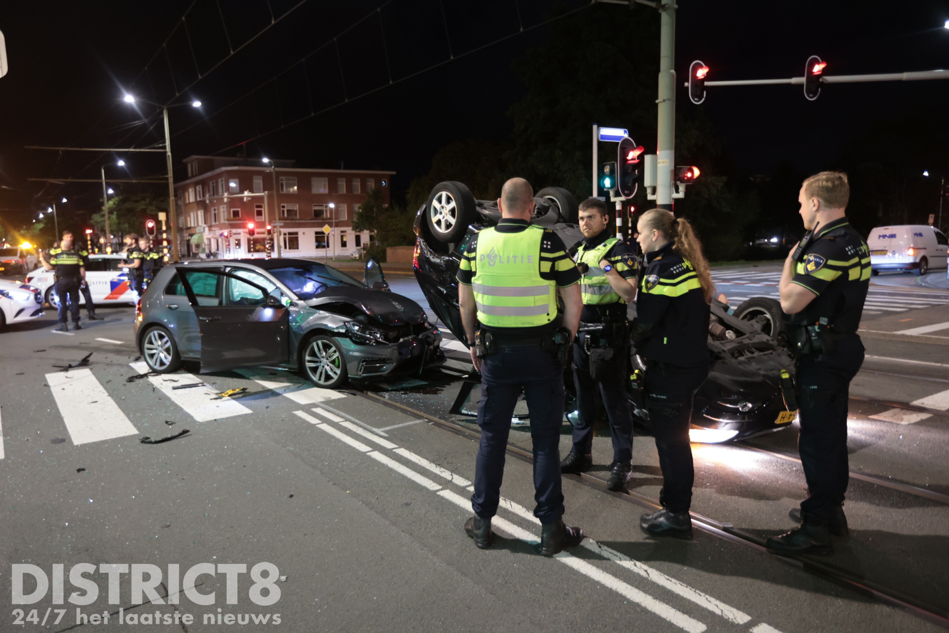 Den Haag – In de nacht van maandag 16 september om dinsdag 17 september is er een personenauto op zijn kop belandt na in botsing te zijn gekomen met een andere personenauto op de Laan van Nieuw Oost-Indië kruising Schenkkade in Den Haag.
