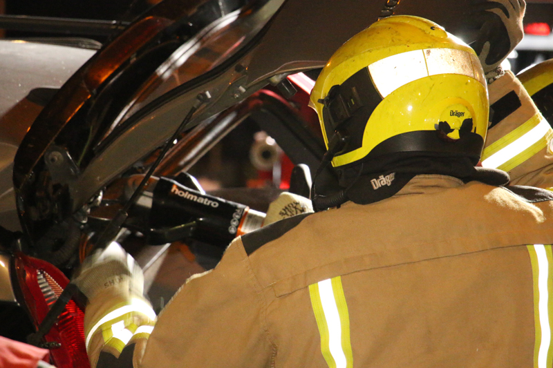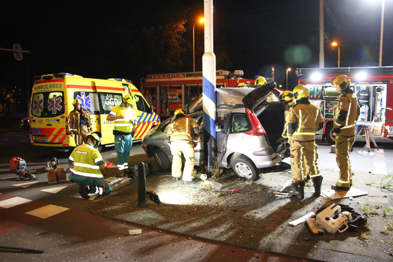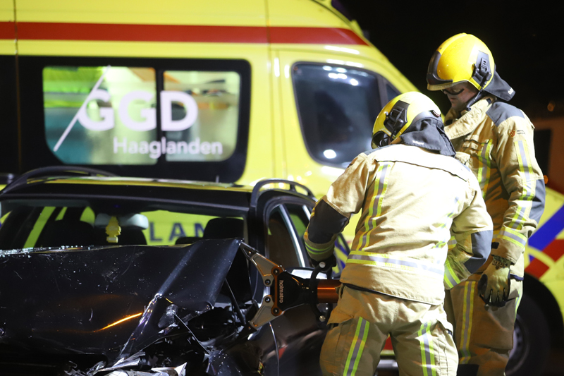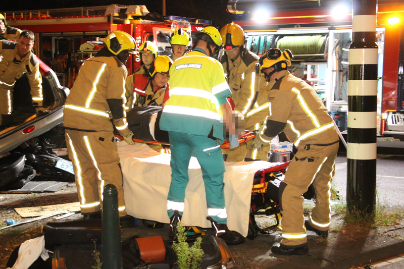 De brandweer is ter plaatse meteen begonnen met het bevrijden van het slachtoffer in de grijze auto, deze zat door de enorme klap vast in de auto.