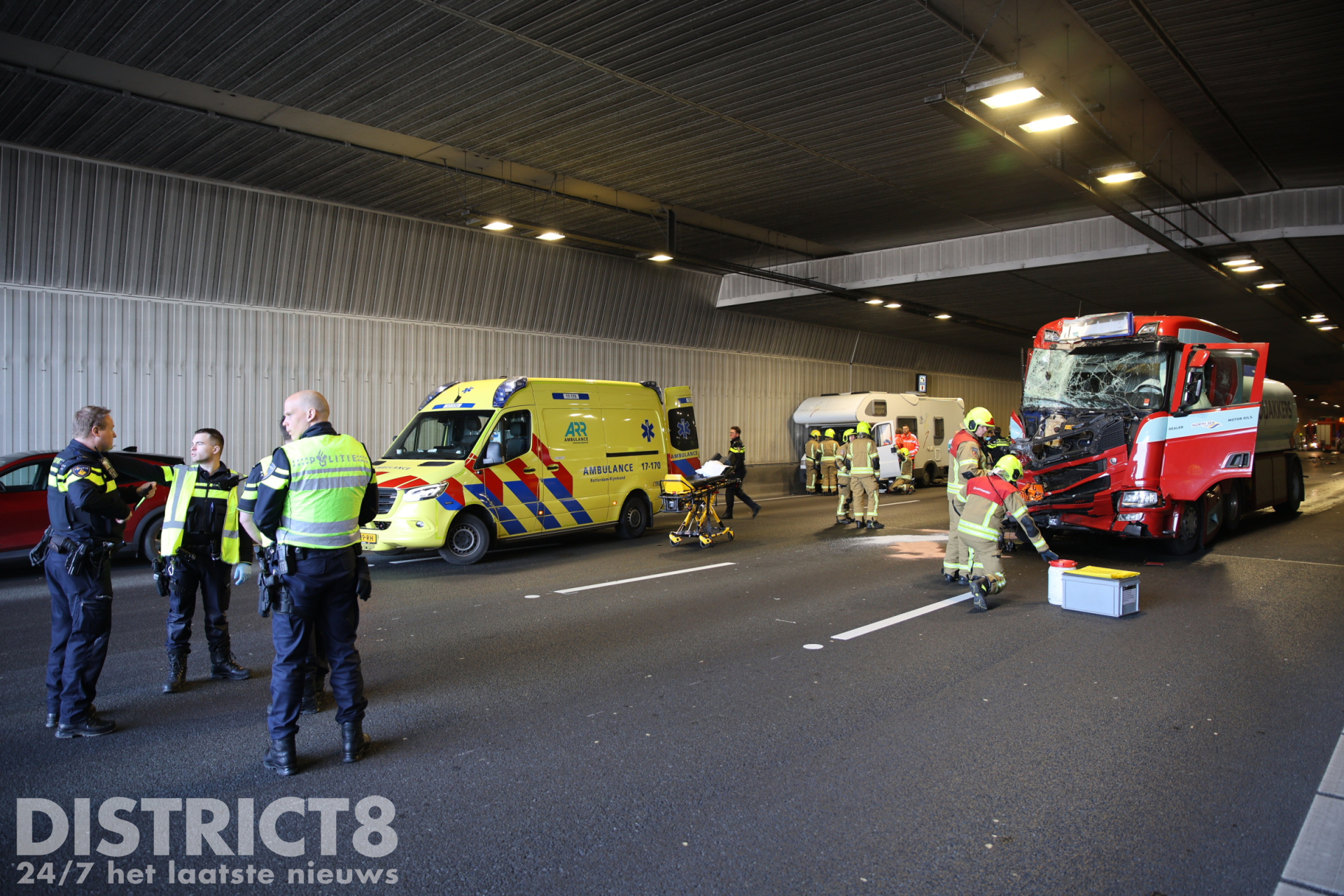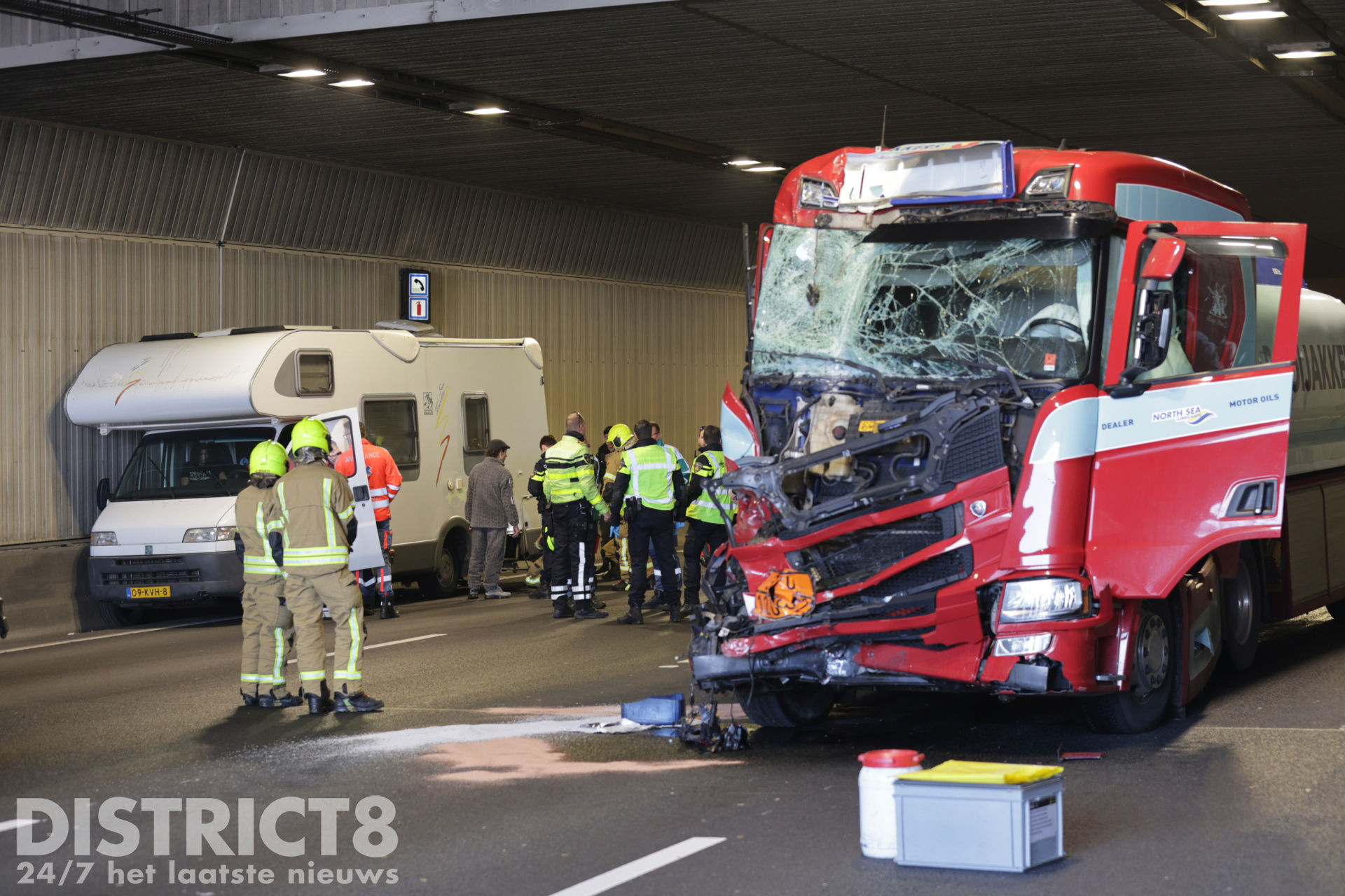 Schipluiden – In de Ketheltunnel op de A4 richting Den Haag, heeft maandagochtend 3 maart een flinke aanrijding plaatsgevonden tussen twee vrachtwagens en een camper.