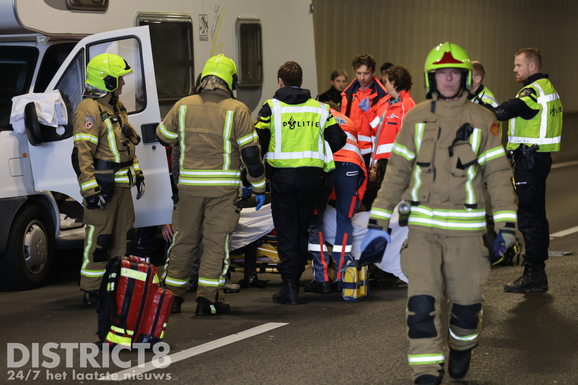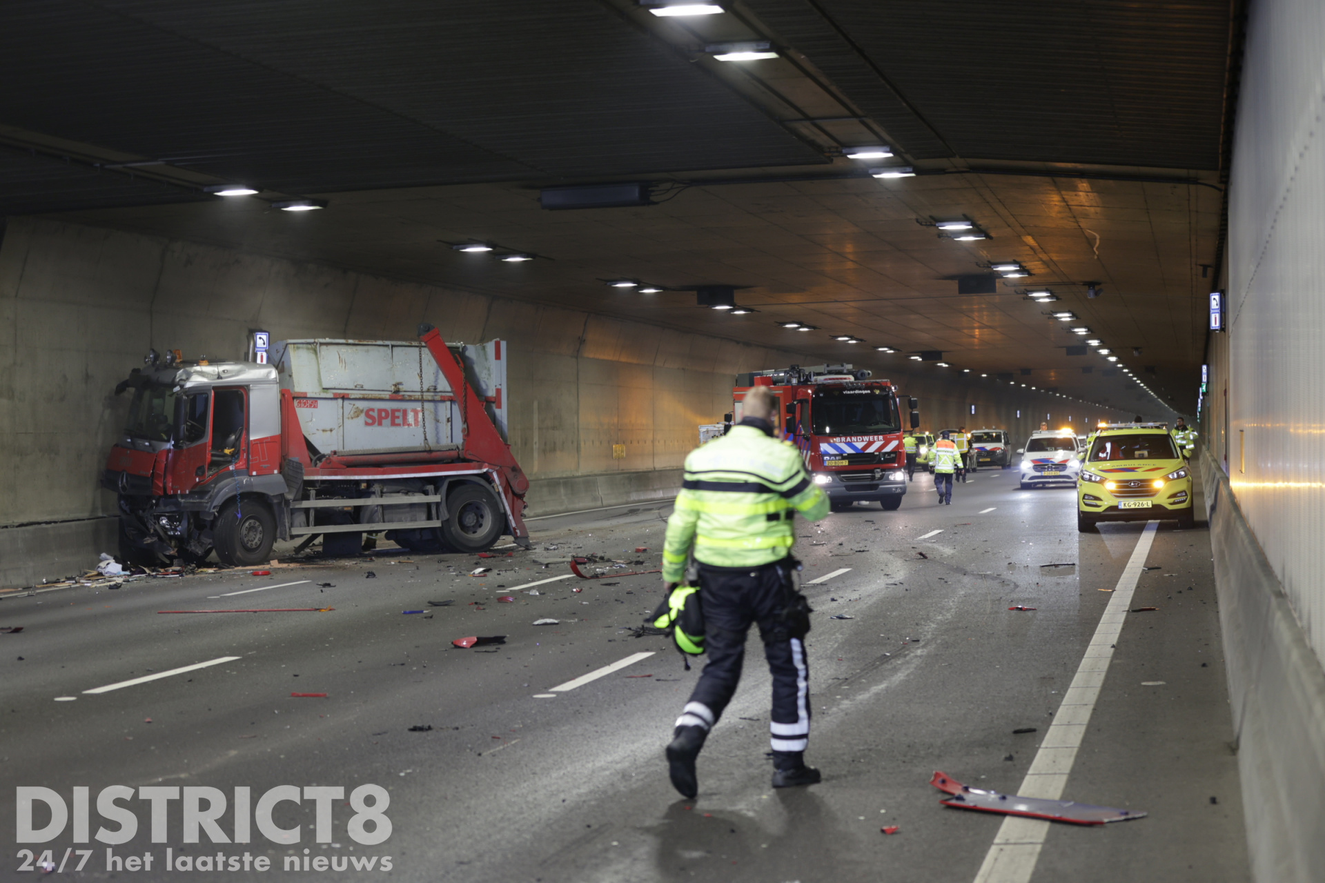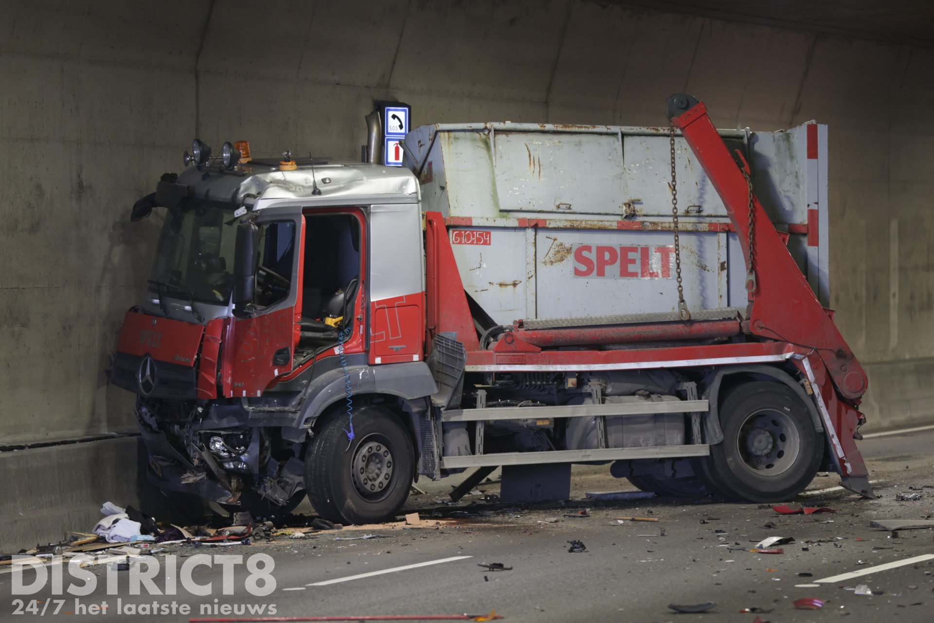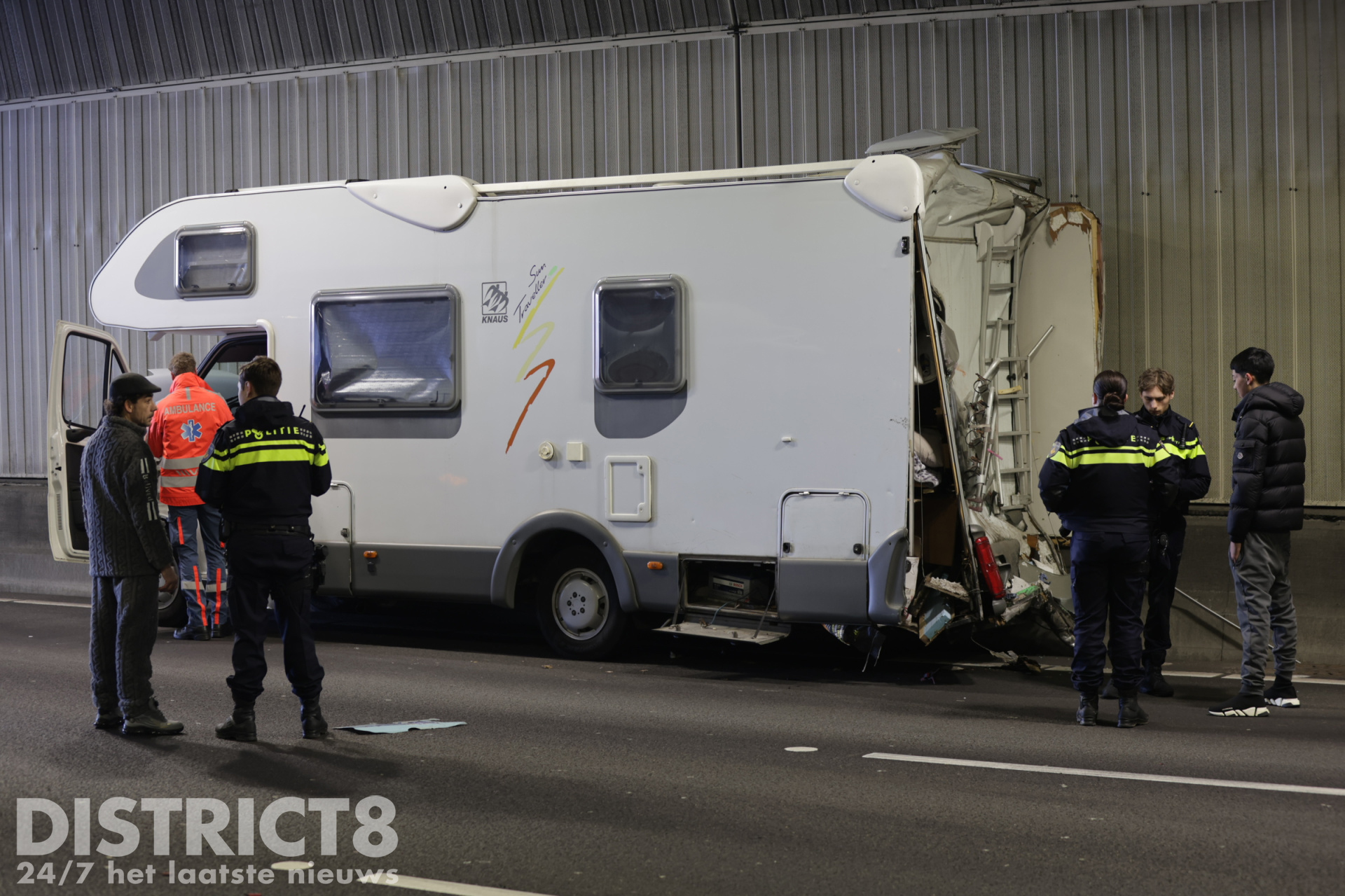 Ravage na aanrijding tussen twee vrachtwagens en een camper in Ketheltunel A4 Schipluiden