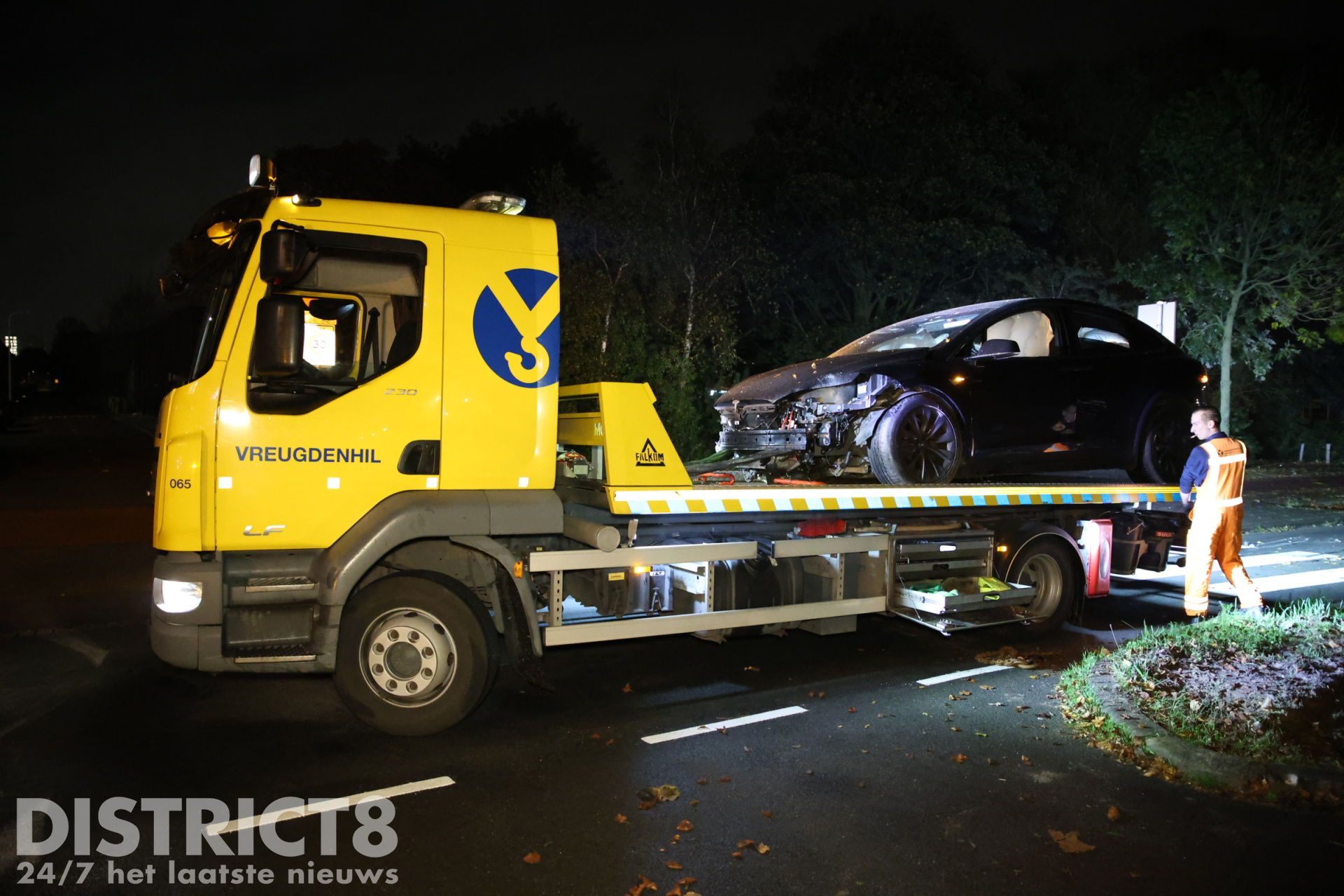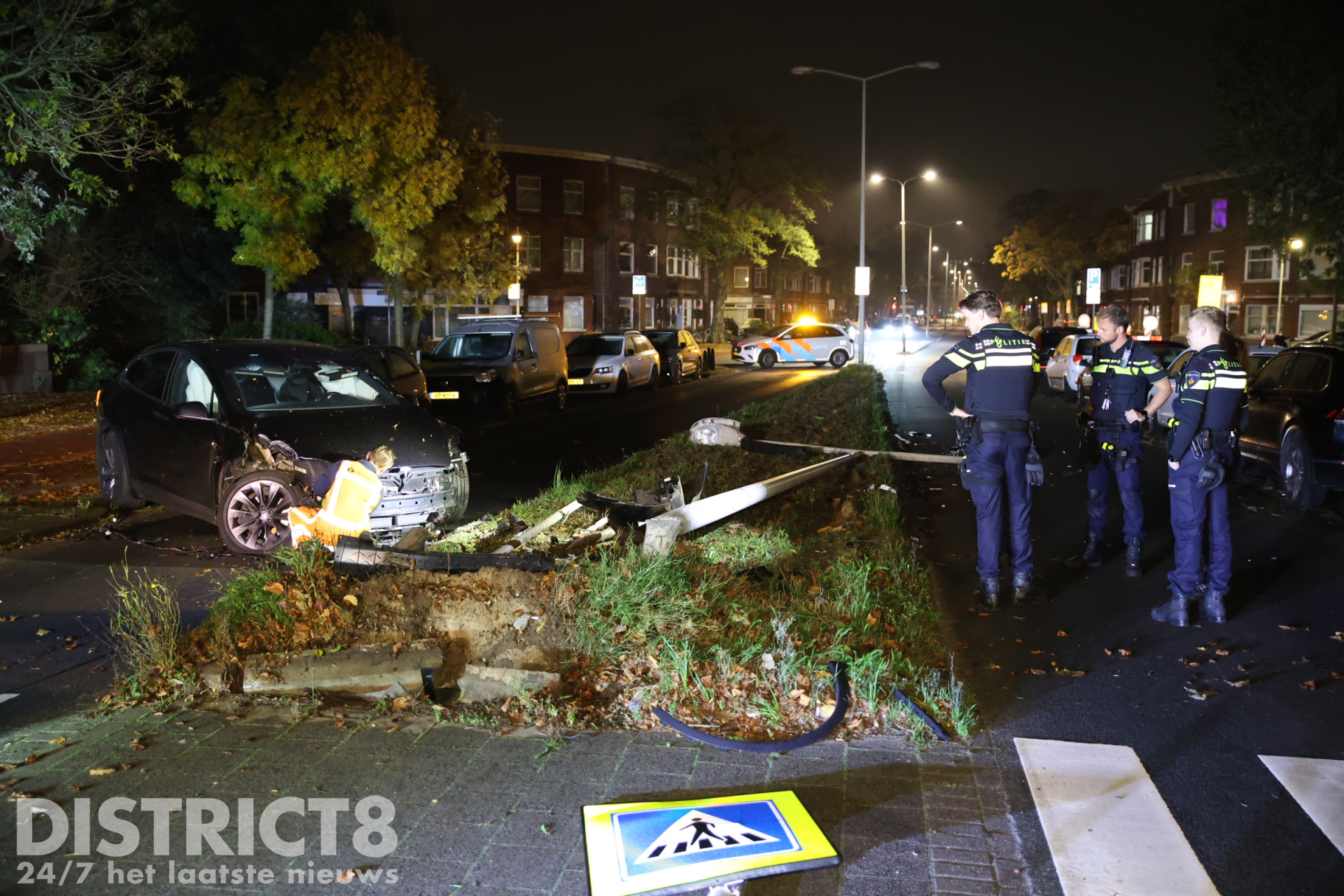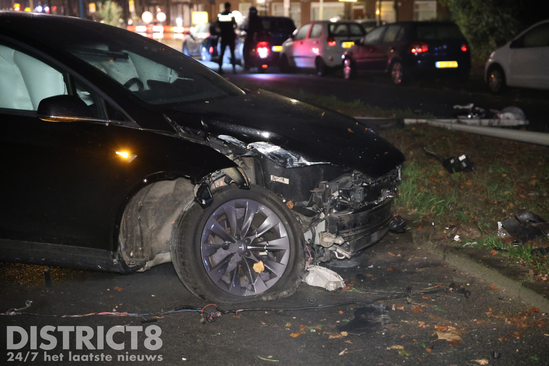 Een Tesla bleek vanaf de Neherkade richting Rijswijk van de weg te zijn geraakt. Nadat de wagen een verkeersbord en een lantaarnpaal ramde kwam deze op de tegenover gelegen rijbaan tot stilstand. De bestuurder stond inmiddels al naast de wagen toen agenten aan kwamen, hij bleek wonder boven wonder geen verwondingen te hebben. Nadat bij de bestuurder een drugs- en alcoholtest was afgenomen is hij aangehouden. Hij is lopend het bureau ingebracht voor nader onderzoek, vermoedelijk was de man tijdens het ongeval onder invloed.