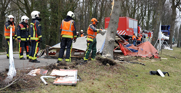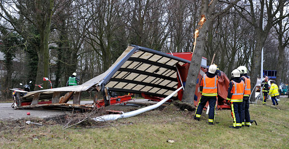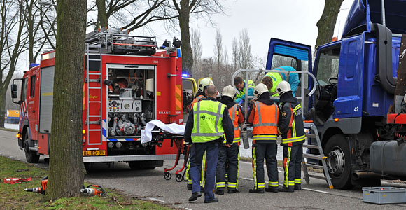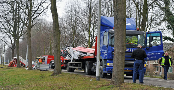 Leiden – Maandagmiddag 27 februari is er een ravage ontstaan op de Kanaalweg in Leiden na een eenzijdig ongeval. Een vrachtwagenchauffeur was mogelijk onwel geworden en kwam met zijn vrachtwagencombinatie in de berm terecht. Hierna ramde de vrachtwagen een lichtmast en een boom. De trailer werd door de klap geheel uit een gereten. De vrachtwagenchauffeur is met onbekend letsel en met spoed vervoerd naar het ziekenhuis. De brandweer heeft de boom moeten zagen om dat er een gevaar was voor omvallen. De gemeente heeft de ravage opgeruimd. De Kanaalweg is geruime tijd afgesloten geweest voor al het verkeer.