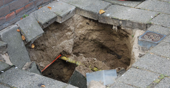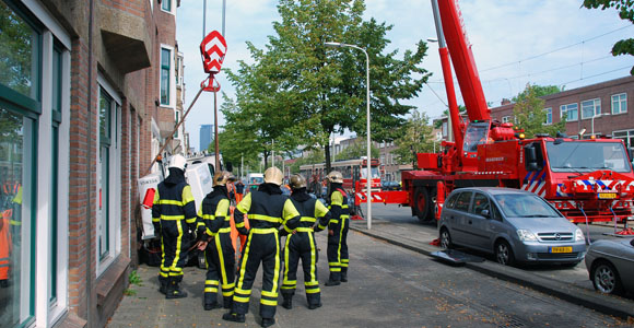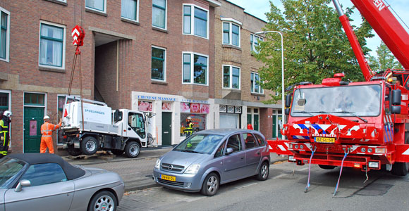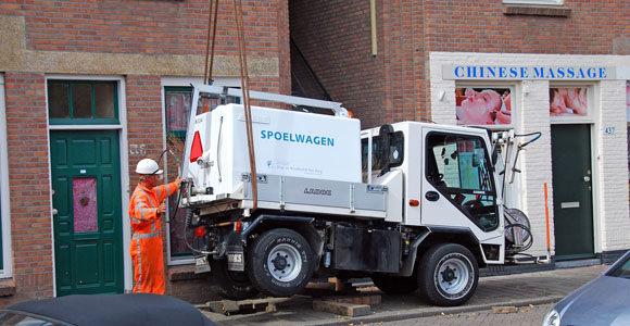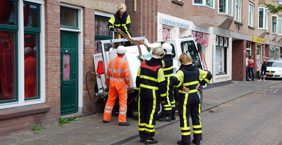 Den Haag – Vrijdagochtend 24 augustus is een spoelwagen van de gemeentereiniging op de Haagse Rijswijkseweg door het trottoir gezakt. Om het voertuig weer op zijn vier wielen te zetten is de hulp van de brandweer ingeroepen. Met behulp van de Grote Kraan is het voertuig opgetild en weer op zijn wielen gezet. Een berger heeft het voertuig afgevoerd. De verzakking is vermoedelijk ontstaan door een gesprongen waterleiding.