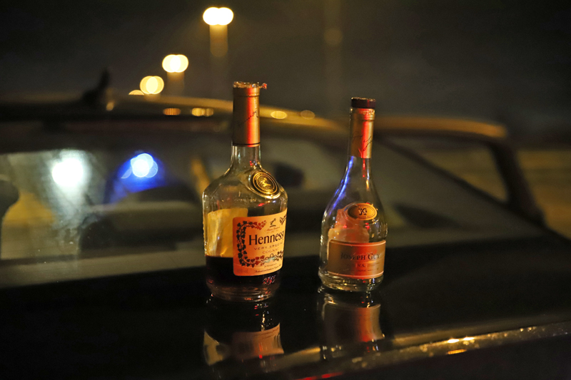 Aan de andere kant van de vangrail werden in de nabijheid van de verdachte twee grote flessen met alcoholhoudende drank gevonden.