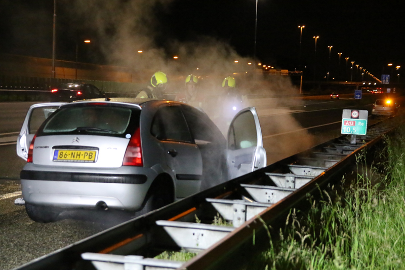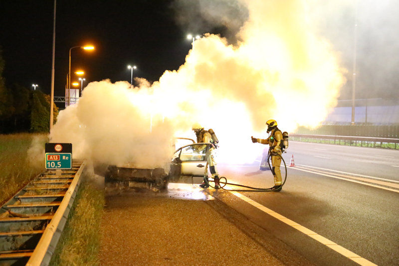 Delft – Op de A13 van Den Haag richting Rotterdam bij afrit Delft-Zuid is in de nacht van vrijdag op zaterdag een auto in vlammen op gegaan.