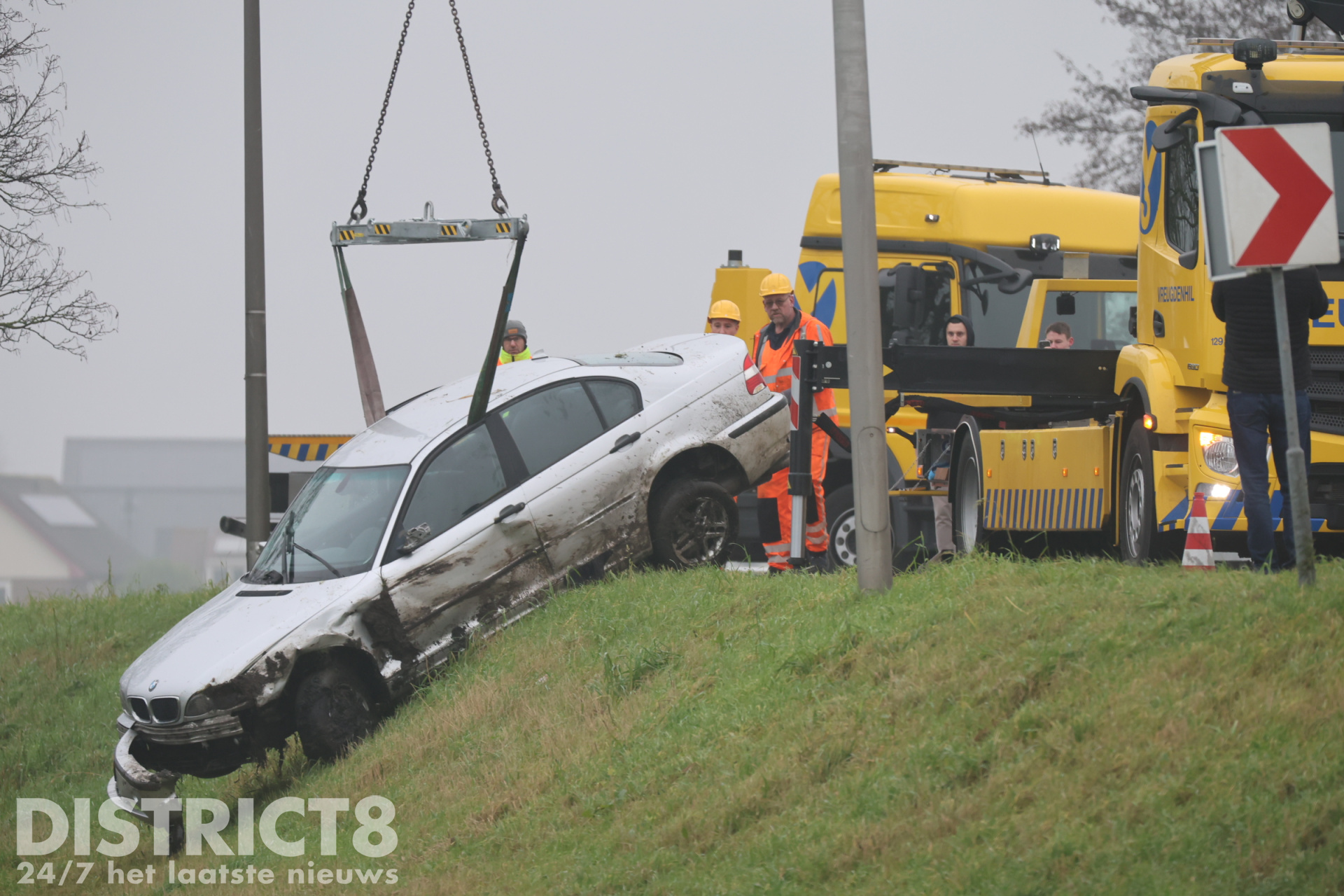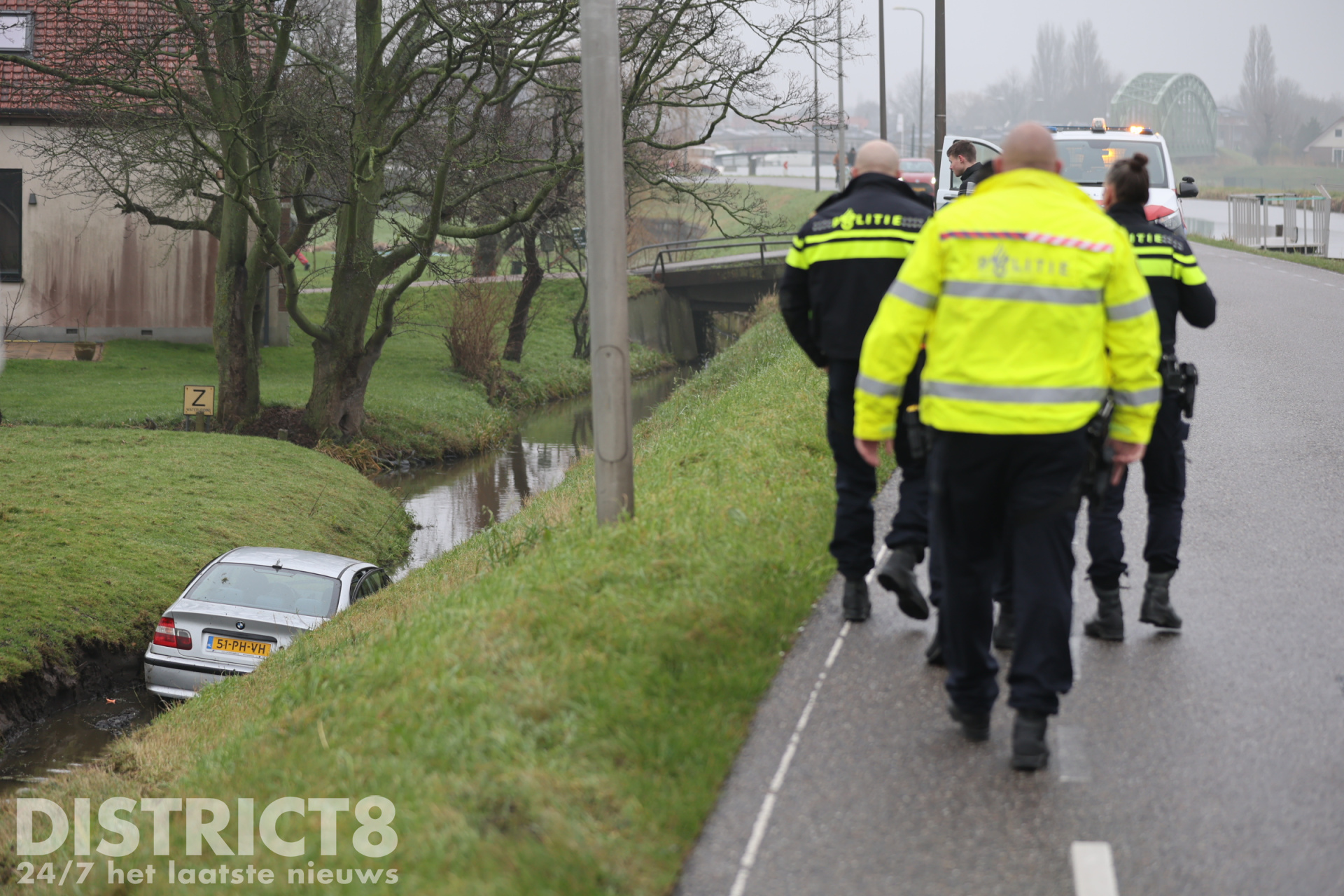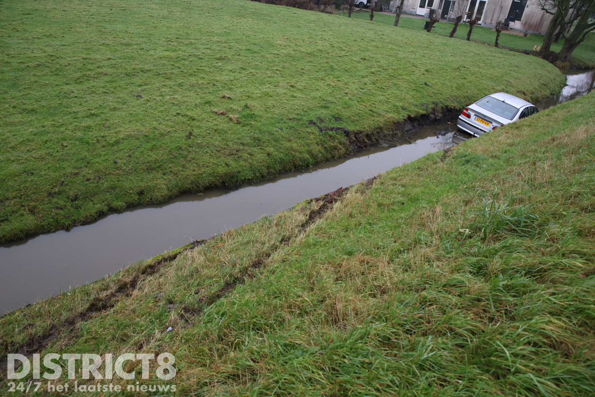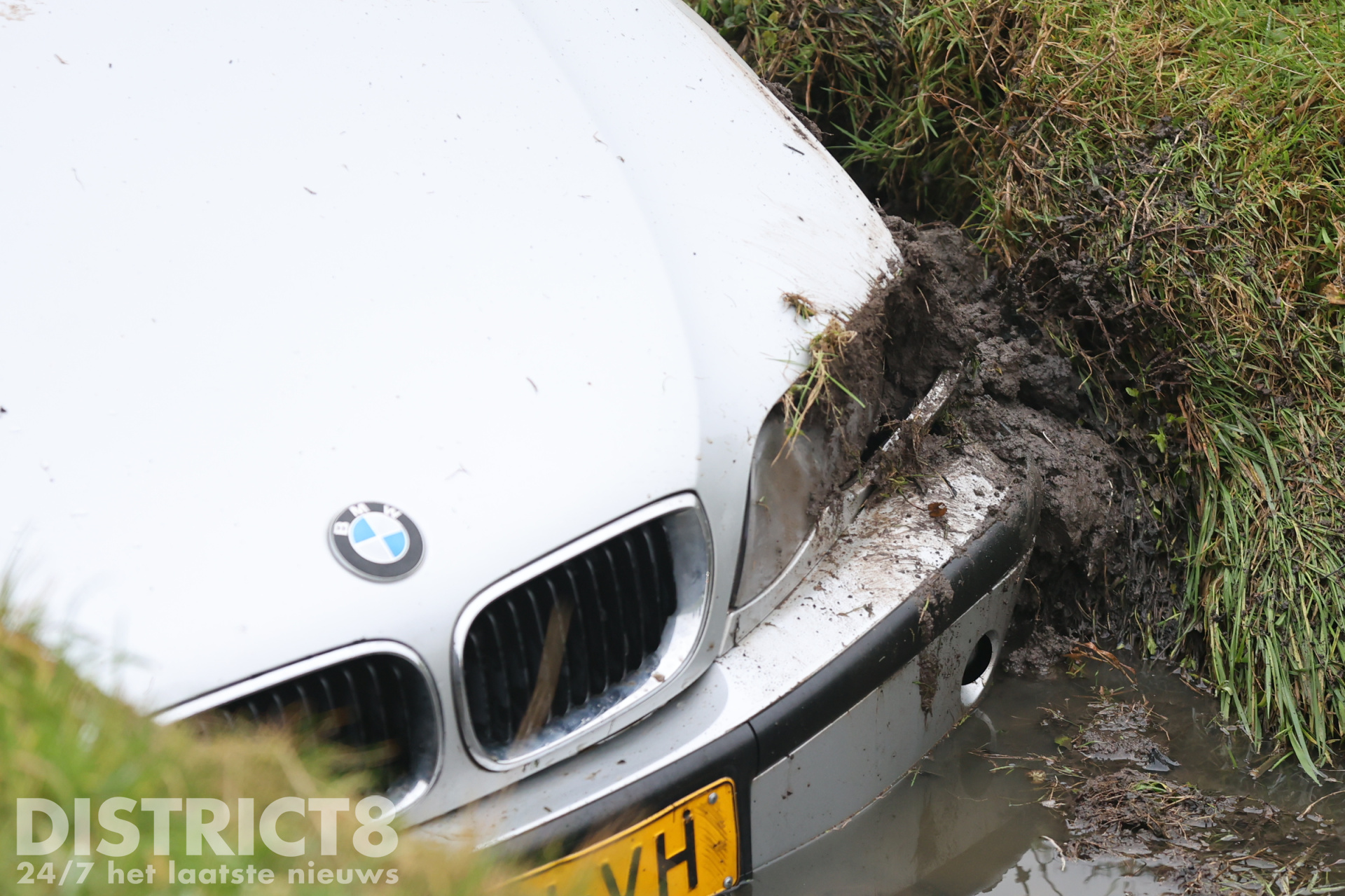 Even voor tien uur ging het mis in een scherpe bocht. De automobilist raakte de macht over het stuur kwijt, schoot uit de bocht en kwam onderaan de dijk in een sloot terecht.