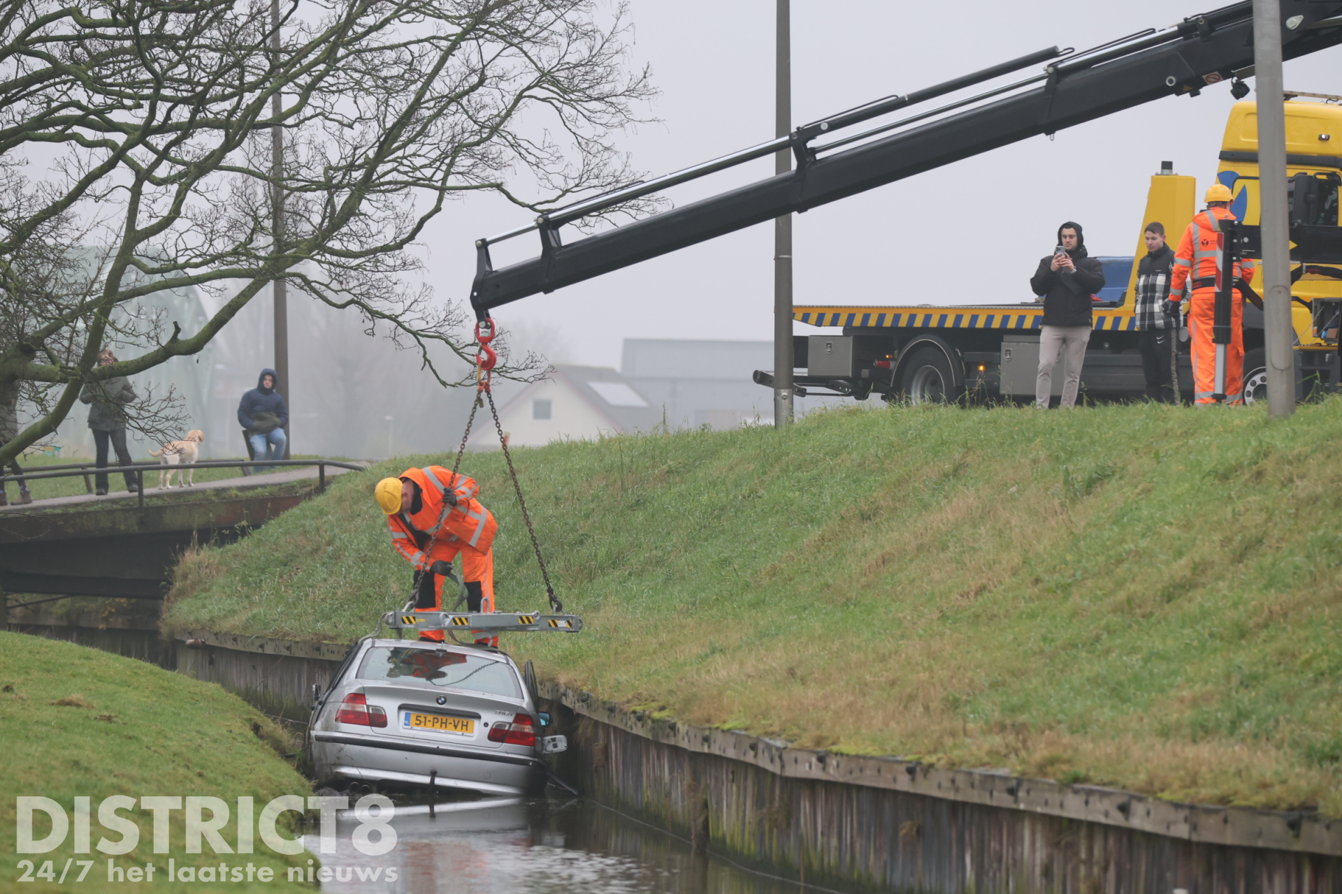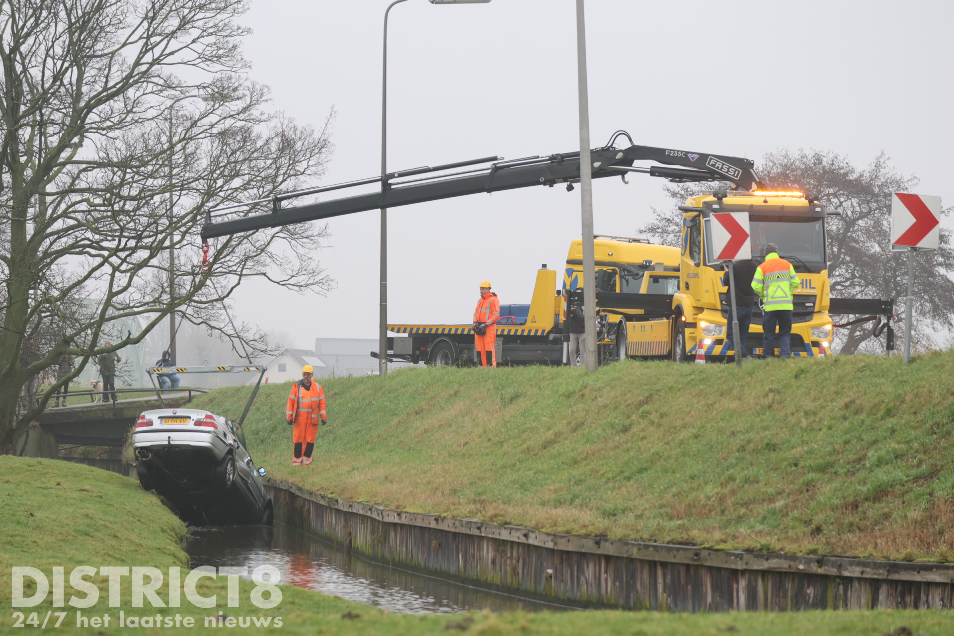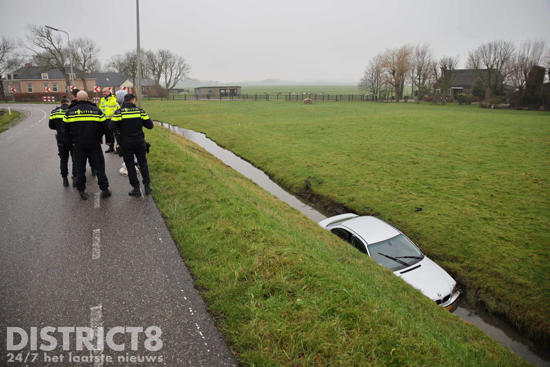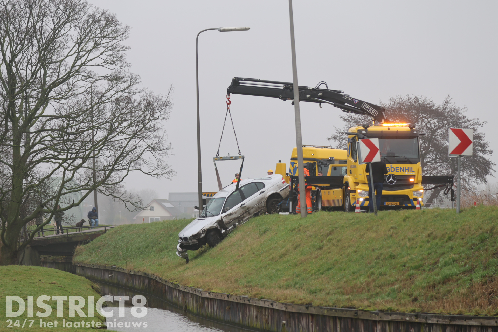 Even voor tien uur ging het mis in een scherpe bocht. De automobilist raakte de macht over het stuur kwijt, schoot uit de bocht en kwam onderaan de dijk in een sloot terecht.