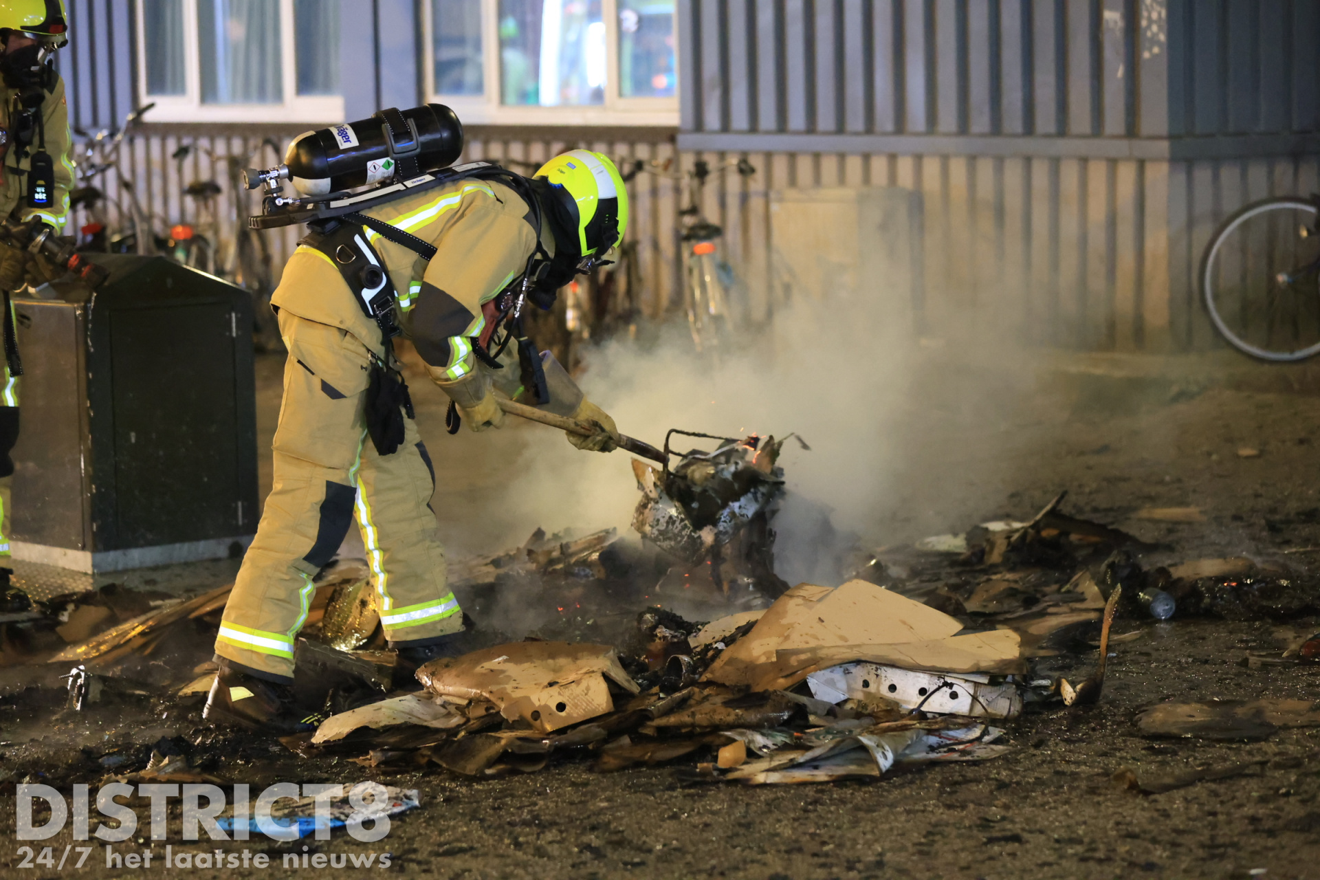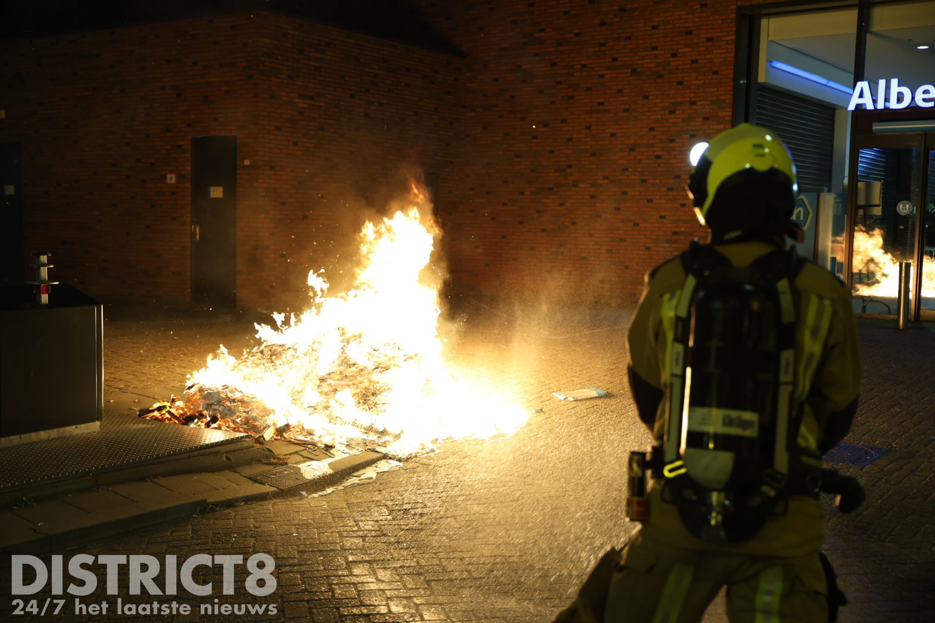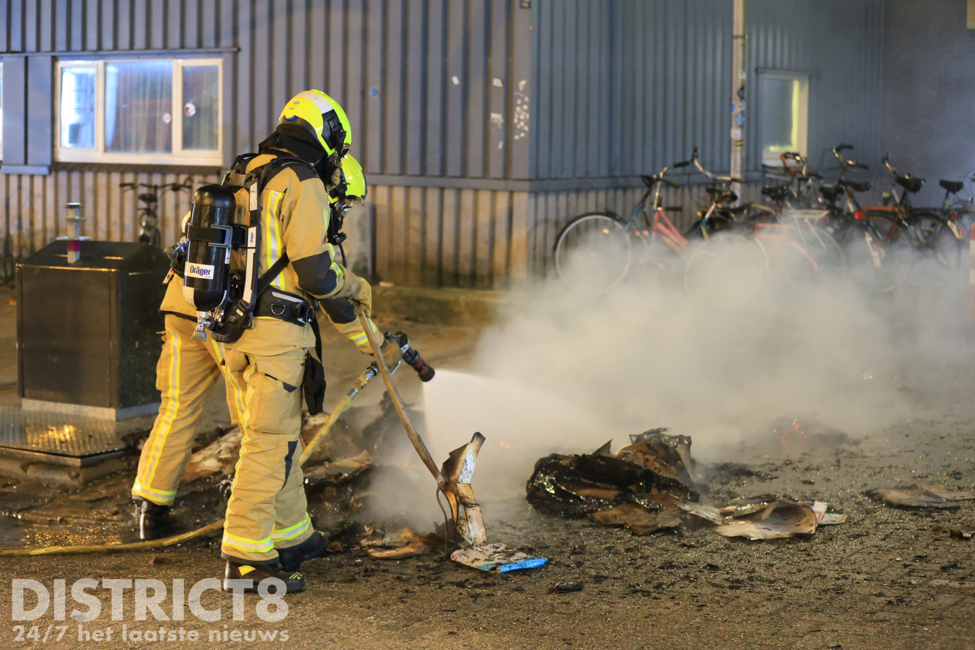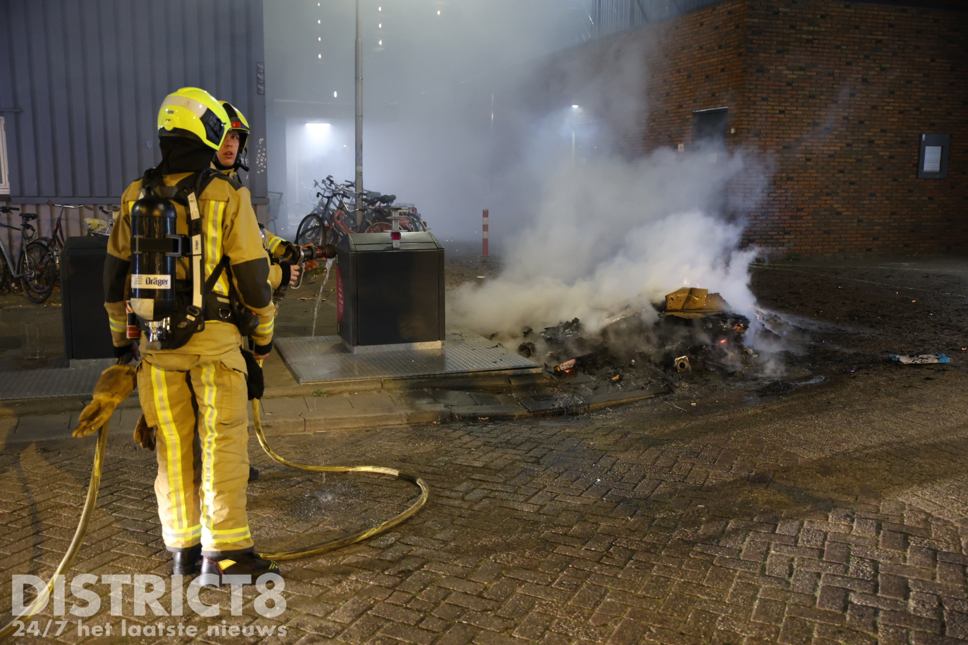 Bij aankomst van de brandweer en de politie was de container al volledig gesmolten en stond de inhoud van de papiercontainer ook al in brand. De brandweer is direct begonnen met het blussen van de brand.