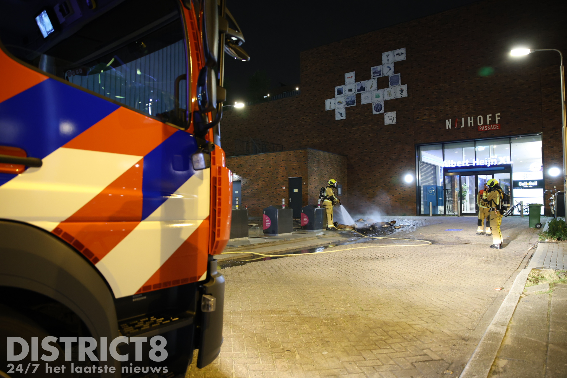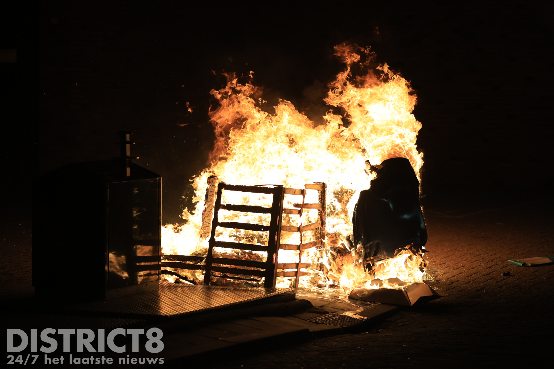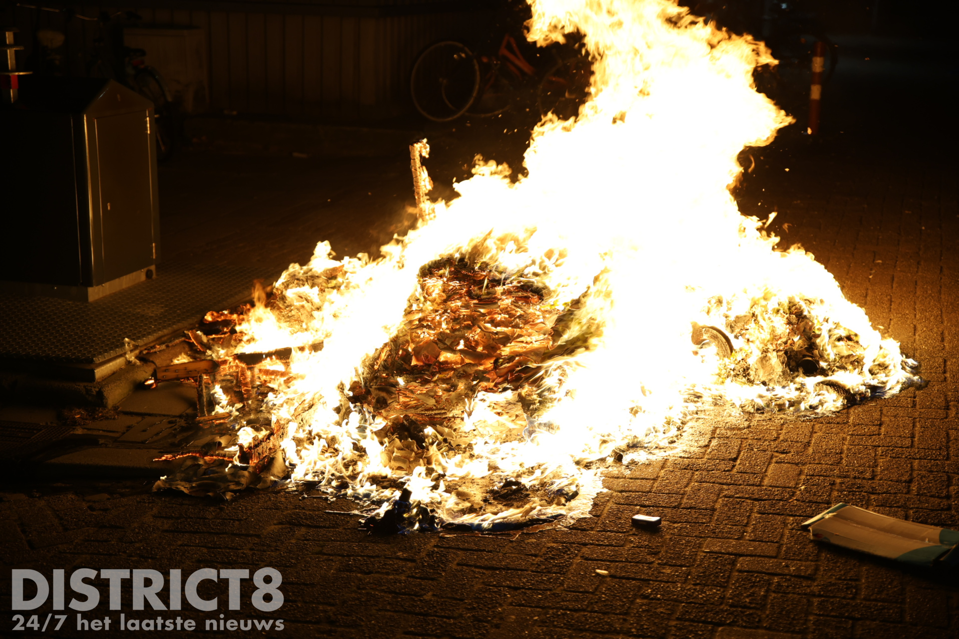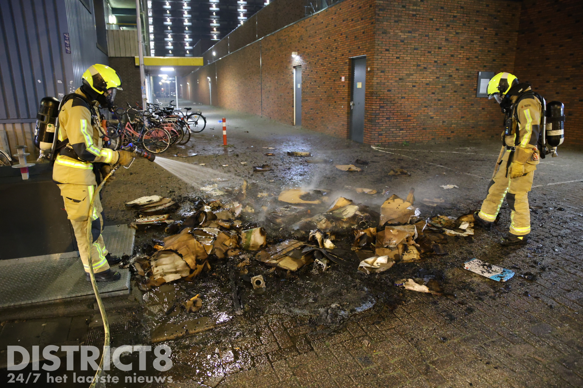 Bij aankomst van de brandweer en de politie was de container al volledig gesmolten en stond de inhoud van de papiercontainer ook al in brand. De brandweer is direct begonnen met het blussen van de brand.
