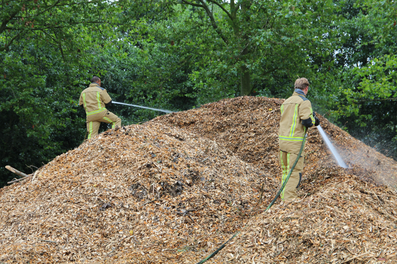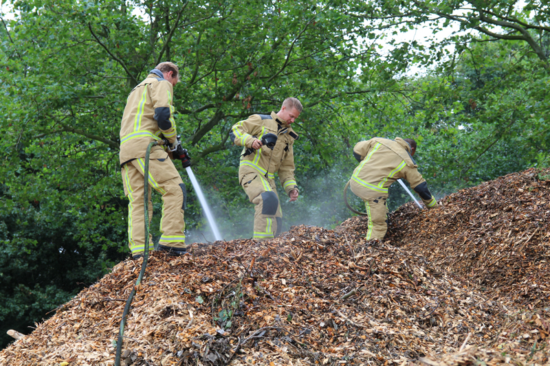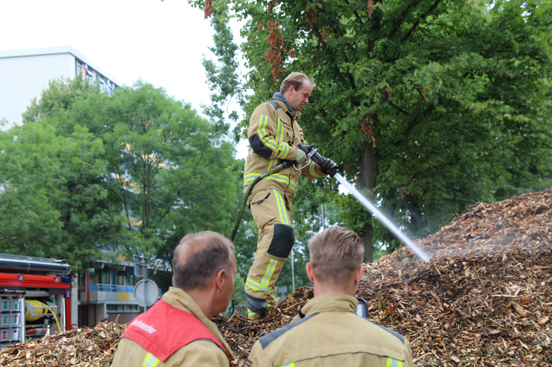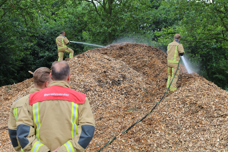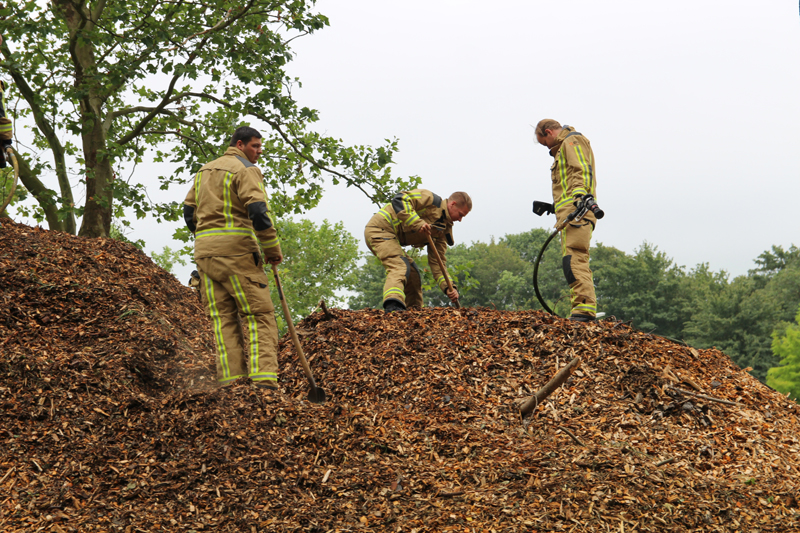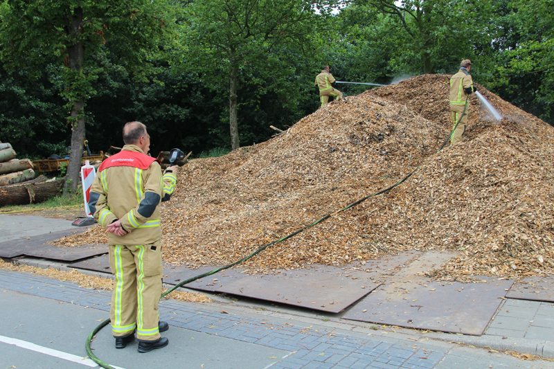 Op de Vulcanusweg in Delft heeft een voorbijganger de brandweer gewaarschuwd nadat hij rook waarnam boven een grote berg met houtsnippers.