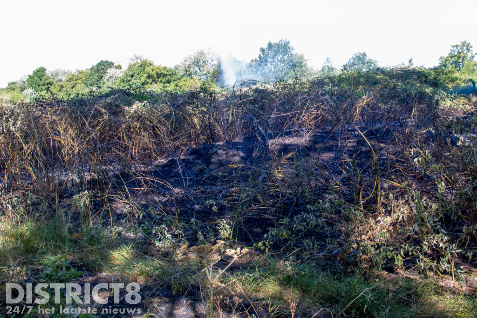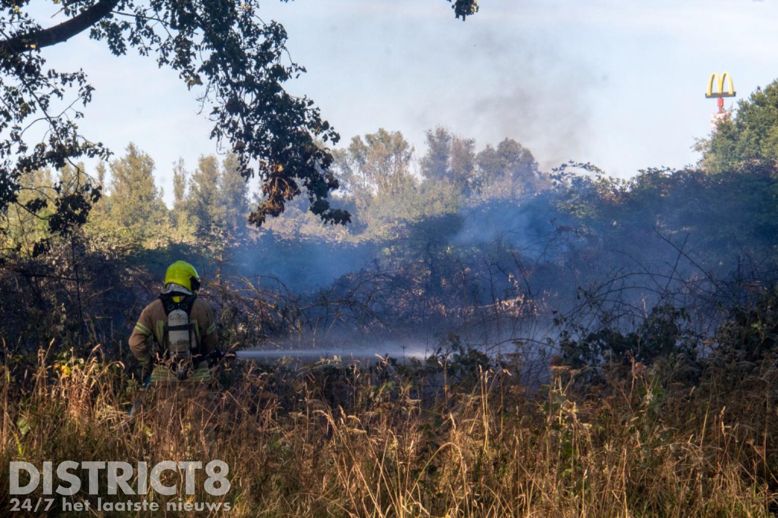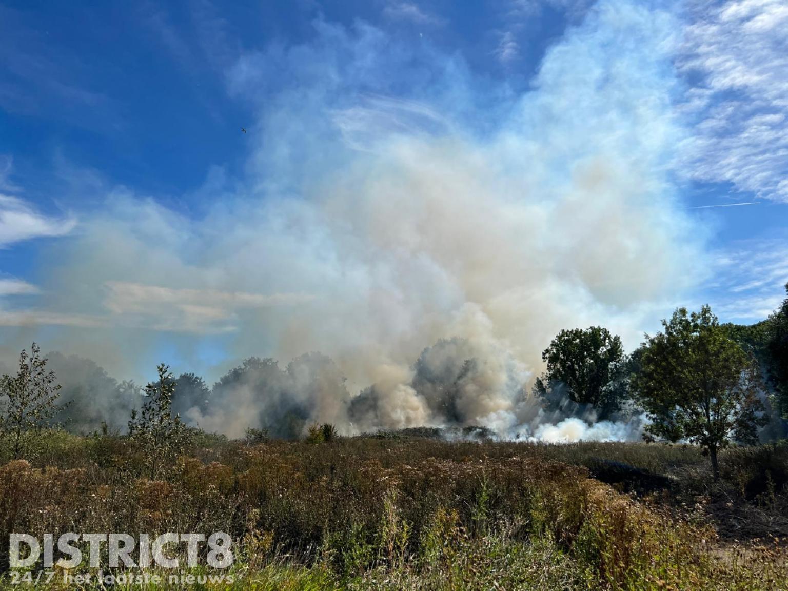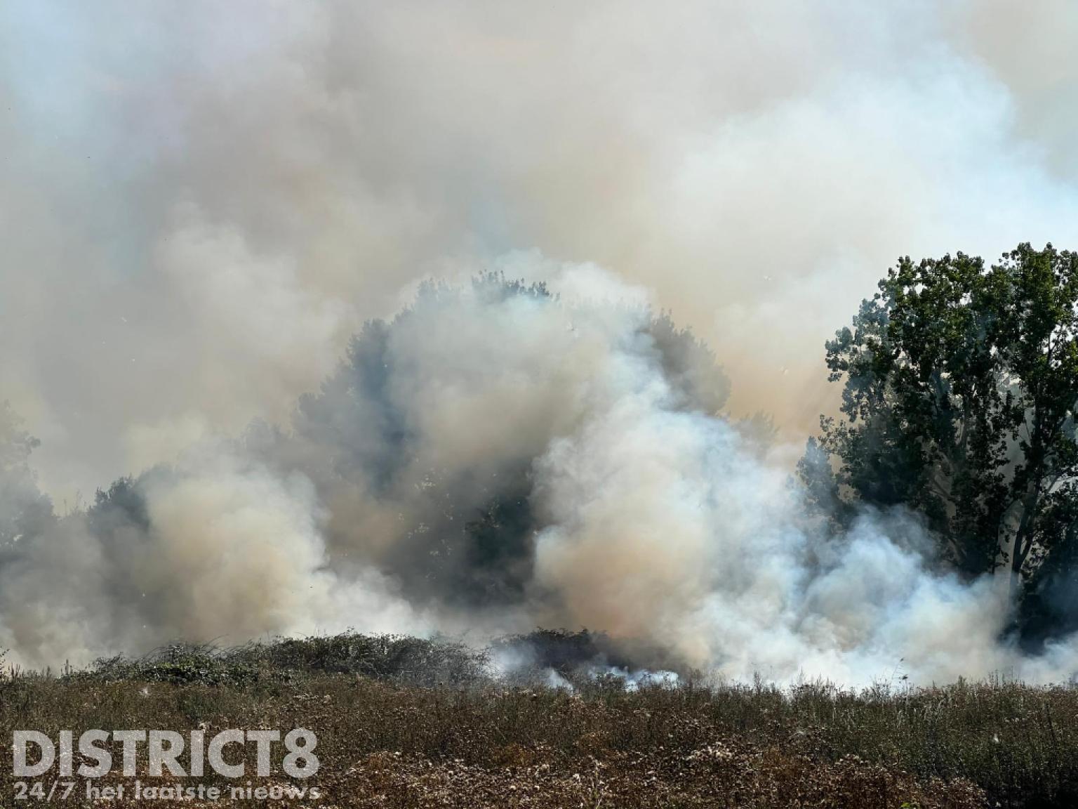 Er zijn van geruime afstand rookwolken te zien. Stukken gras en bosschages staan in brand. Een hoogwerker is ingezet om een beeld te krijgen van de situatie.