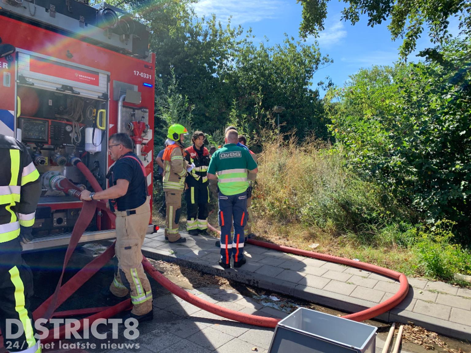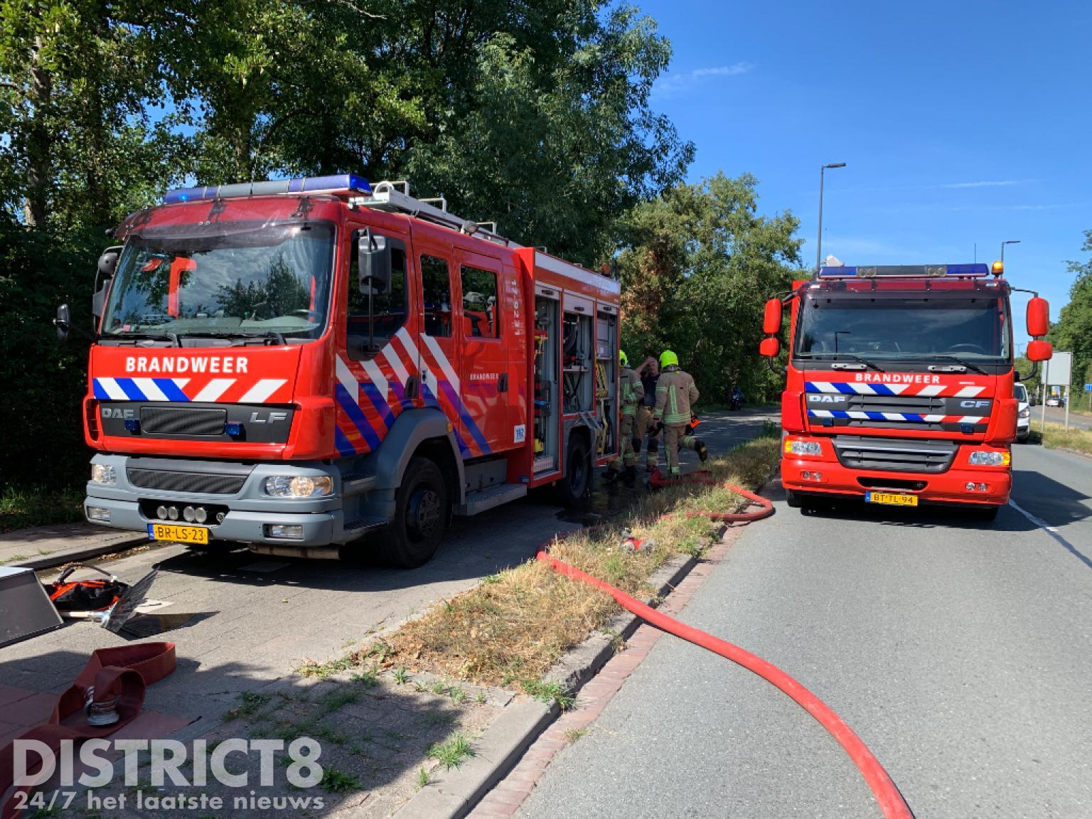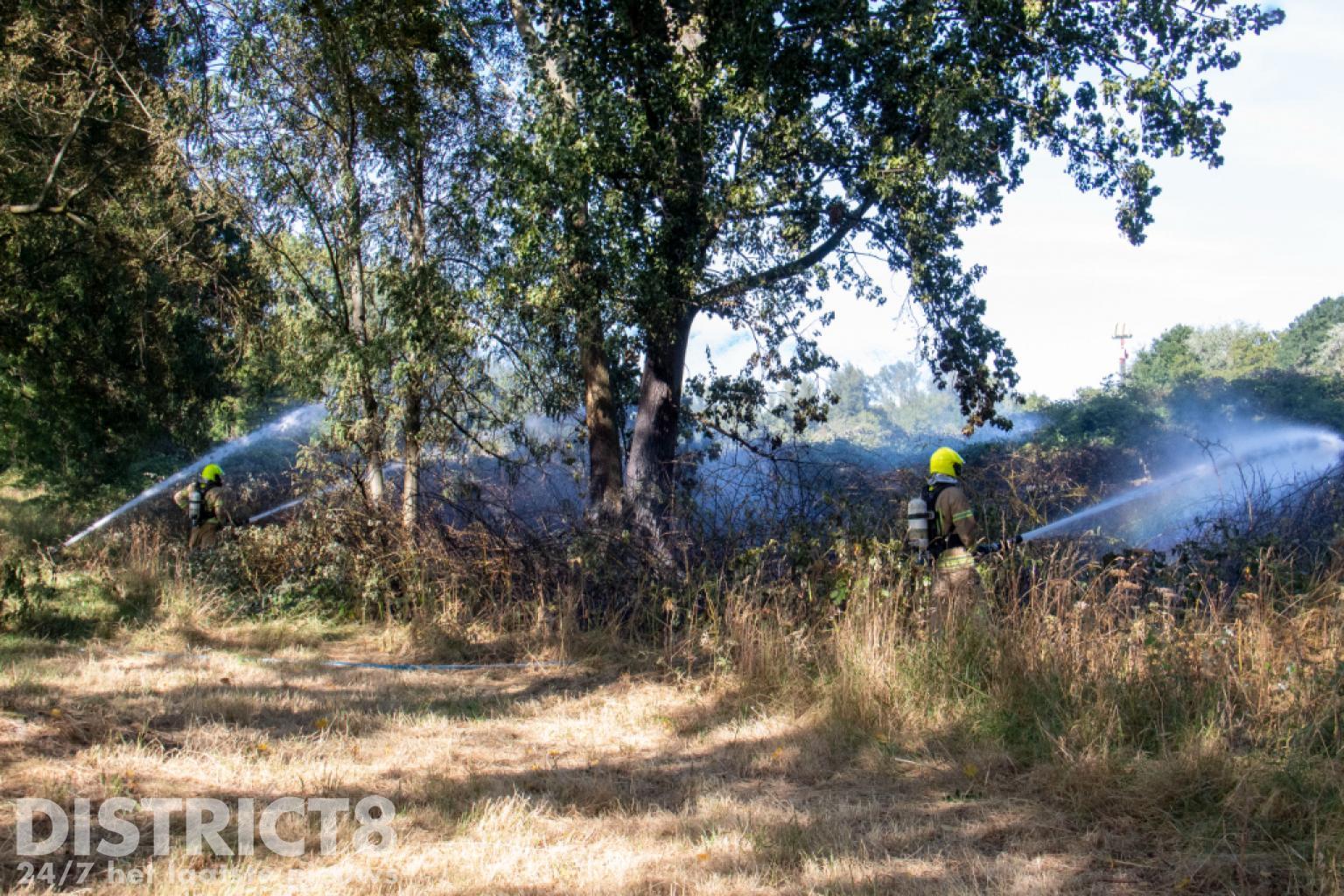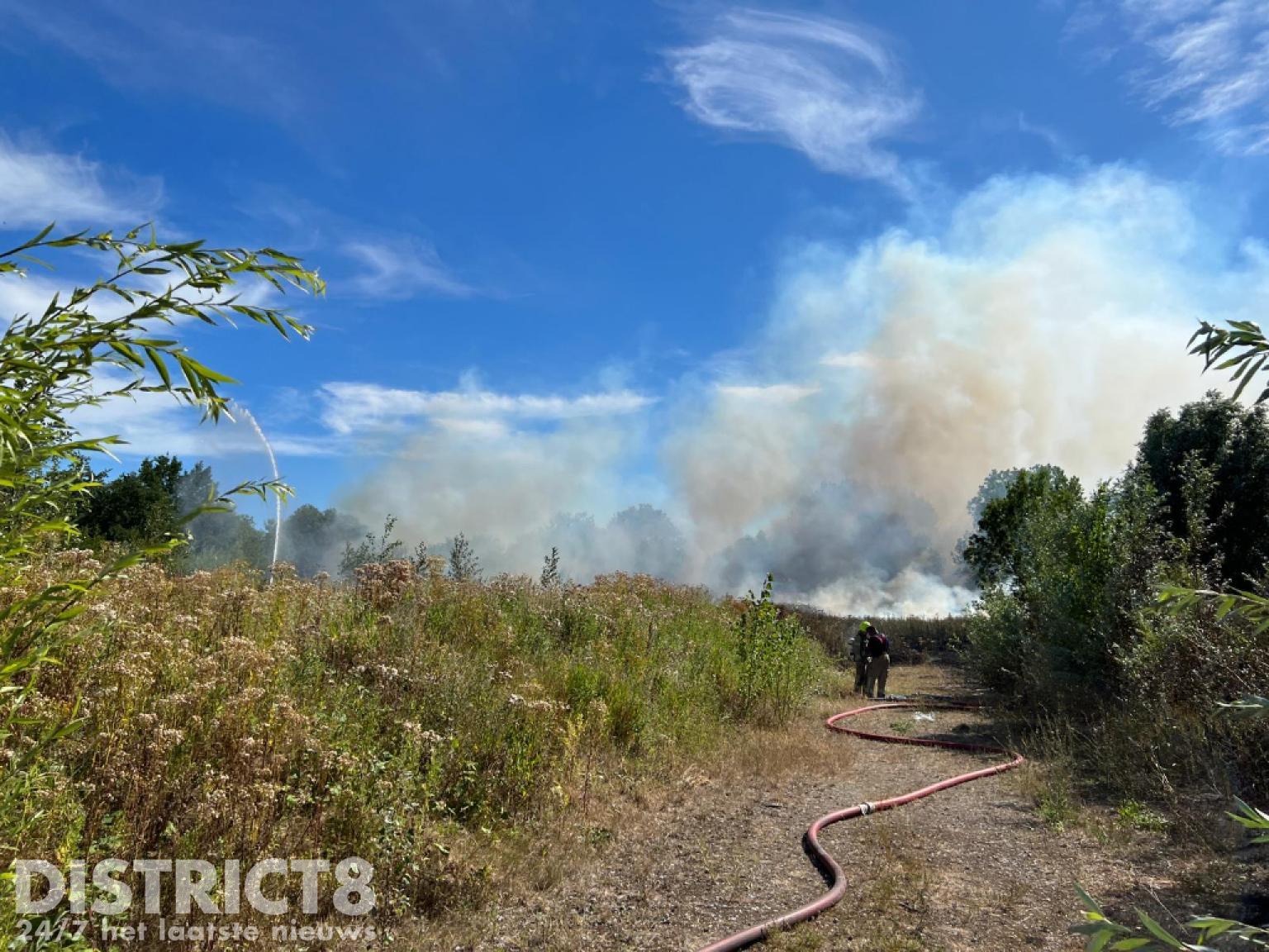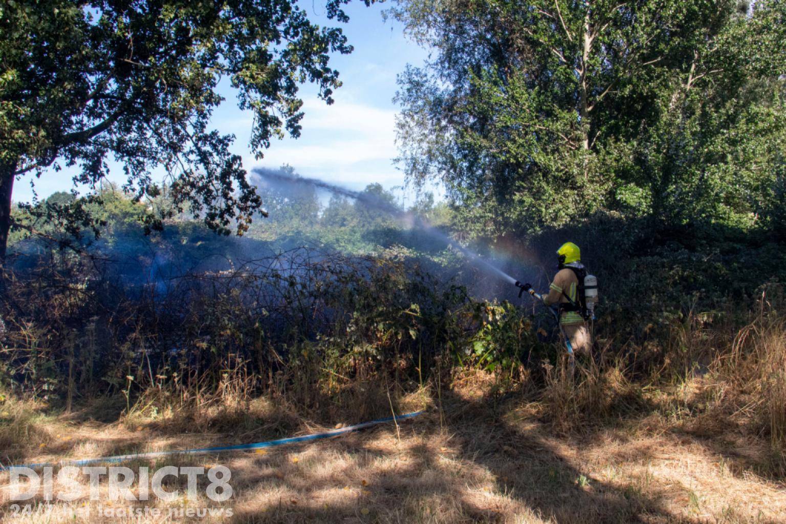 Er zijn van geruime afstand rookwolken te zien. Stukken gras en bosschages staan in brand. Een hoogwerker is ingezet om een beeld te krijgen van de situatie.