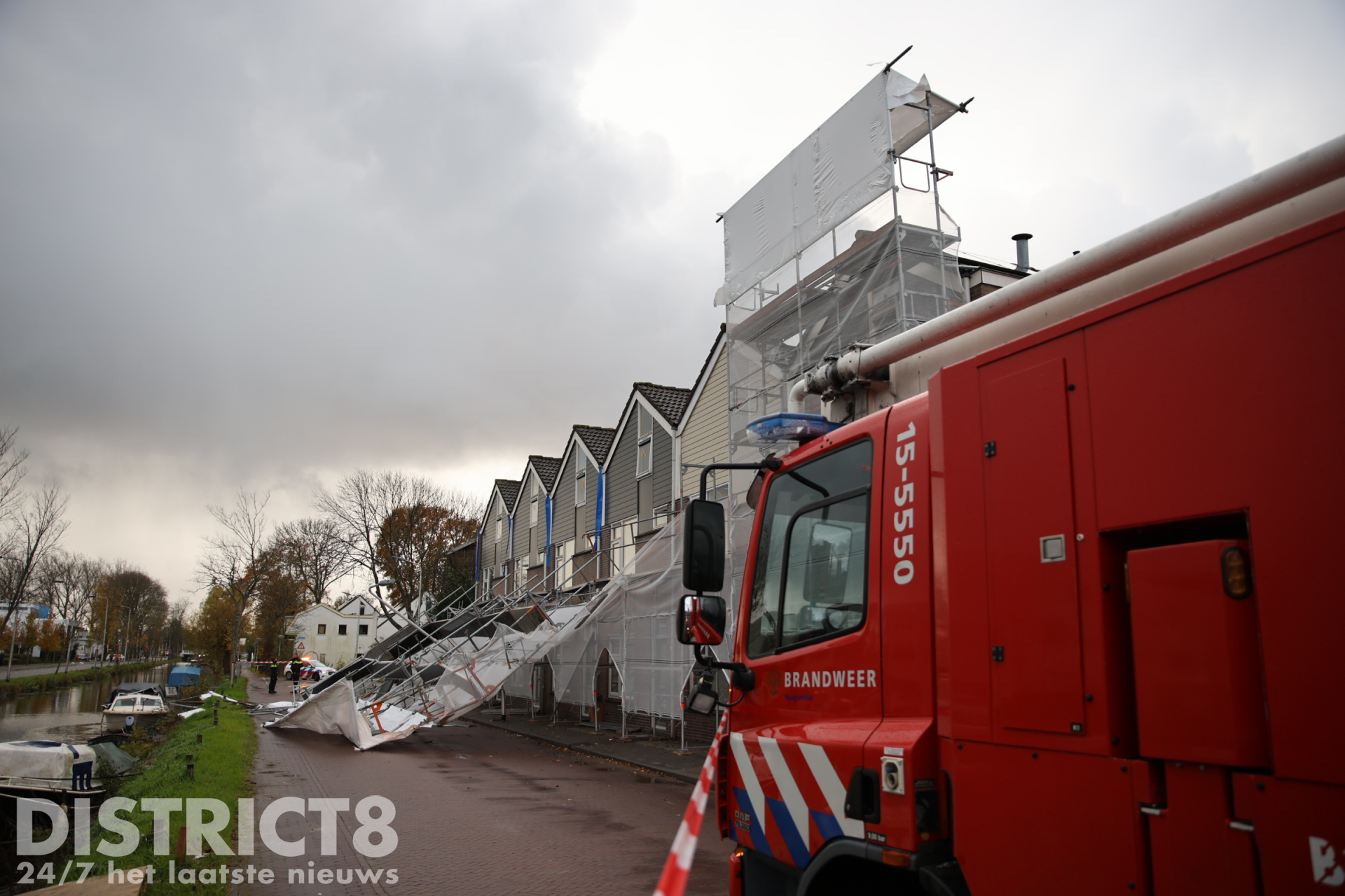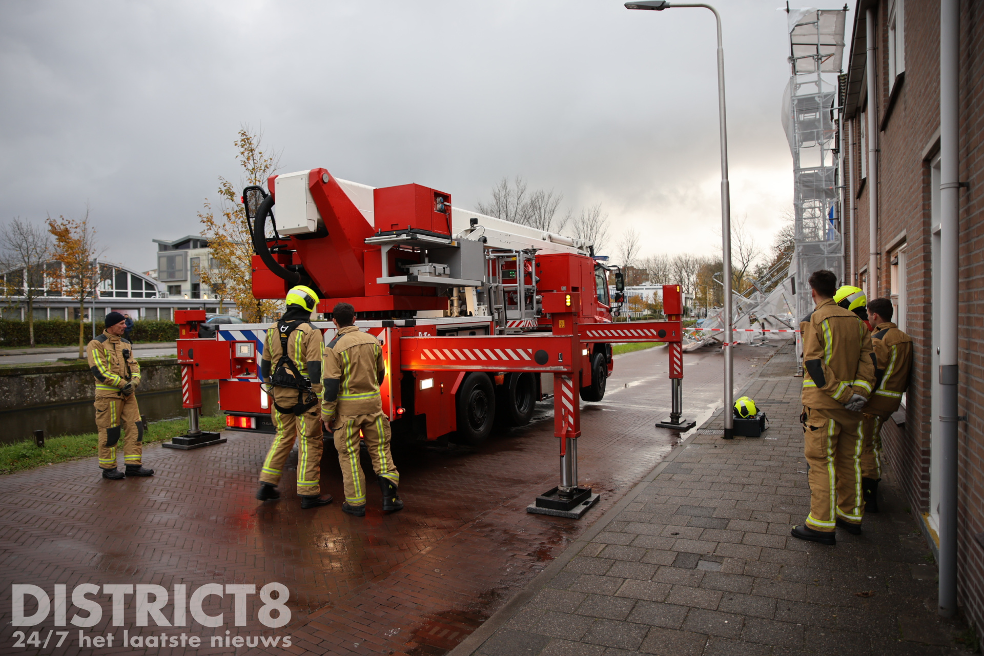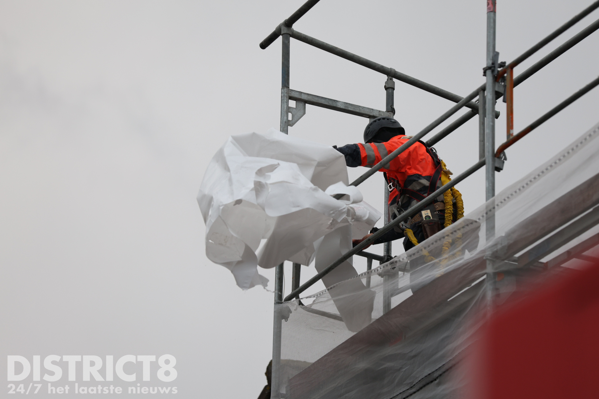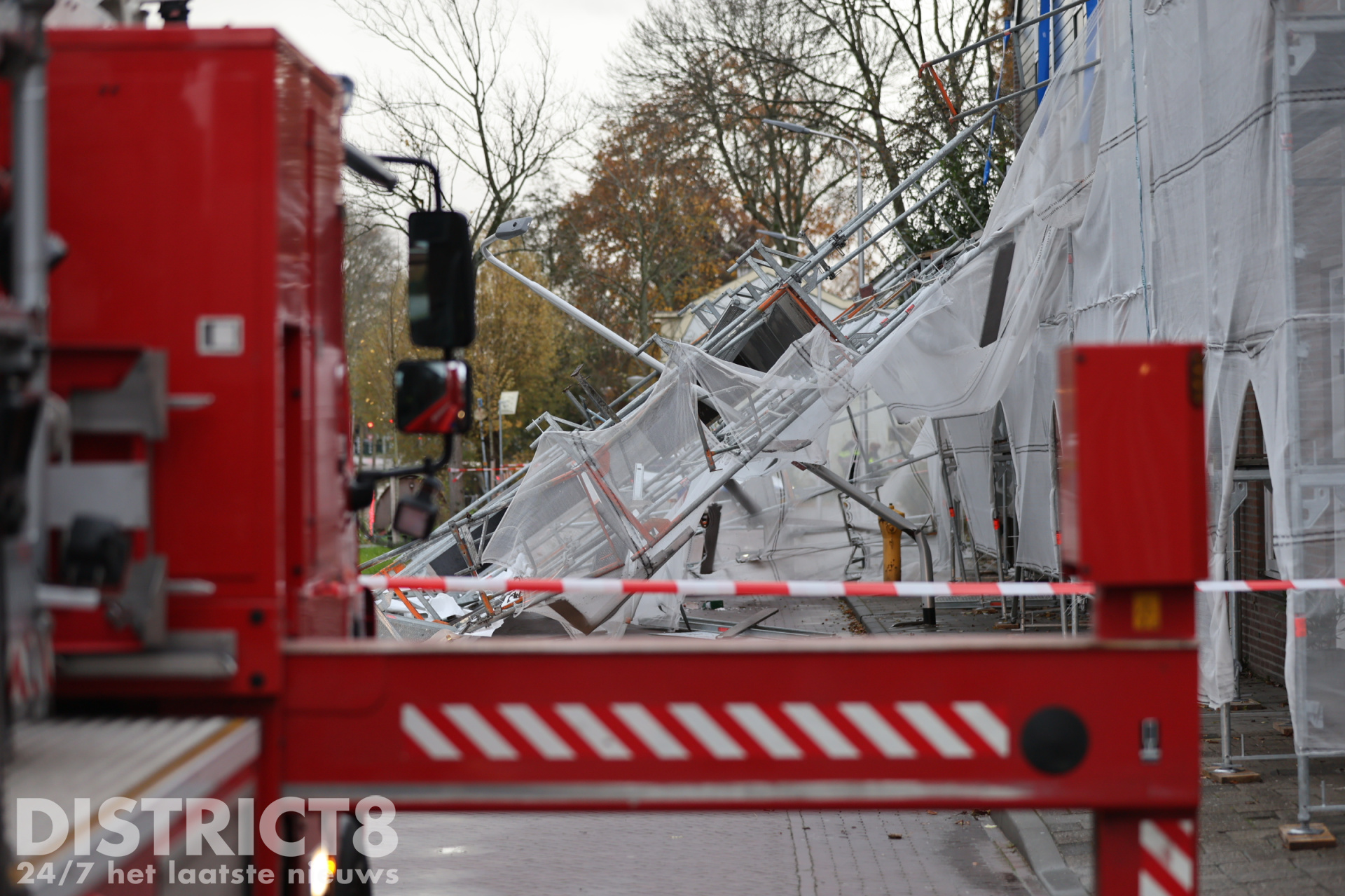 De brandweer kwam samen met de politie ter plaatse om een gedeelte van de weg af te sluiten en de situatie veilig te stellen. Met een hoogwerker heeft de brandweer samen met de steigerbouwer bij het nog staande stuk een groot stuk zeil verwijderd om te voorkomen dat deze ook nog om zou vallen.