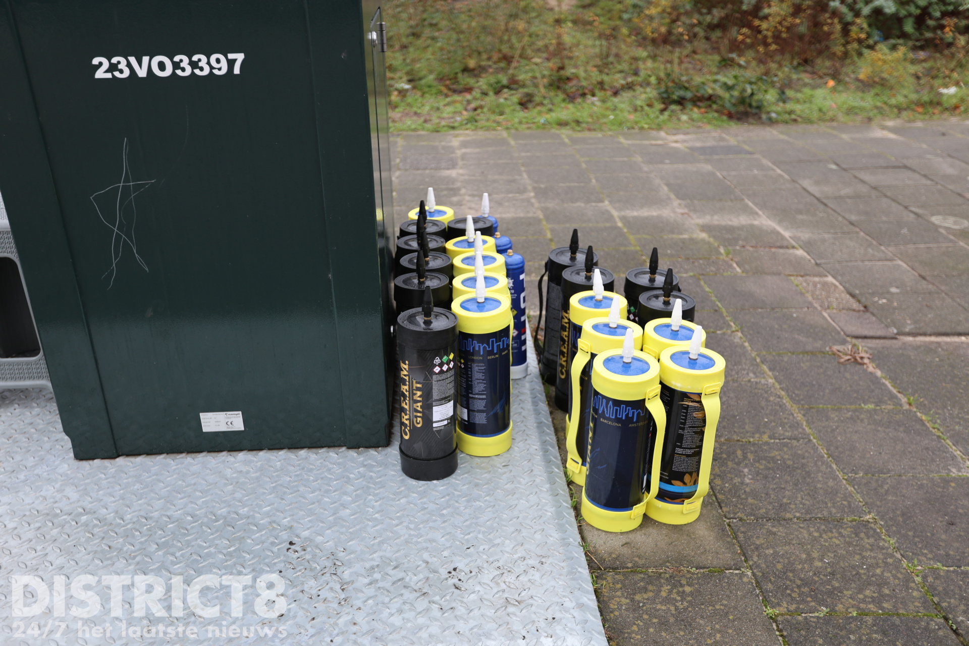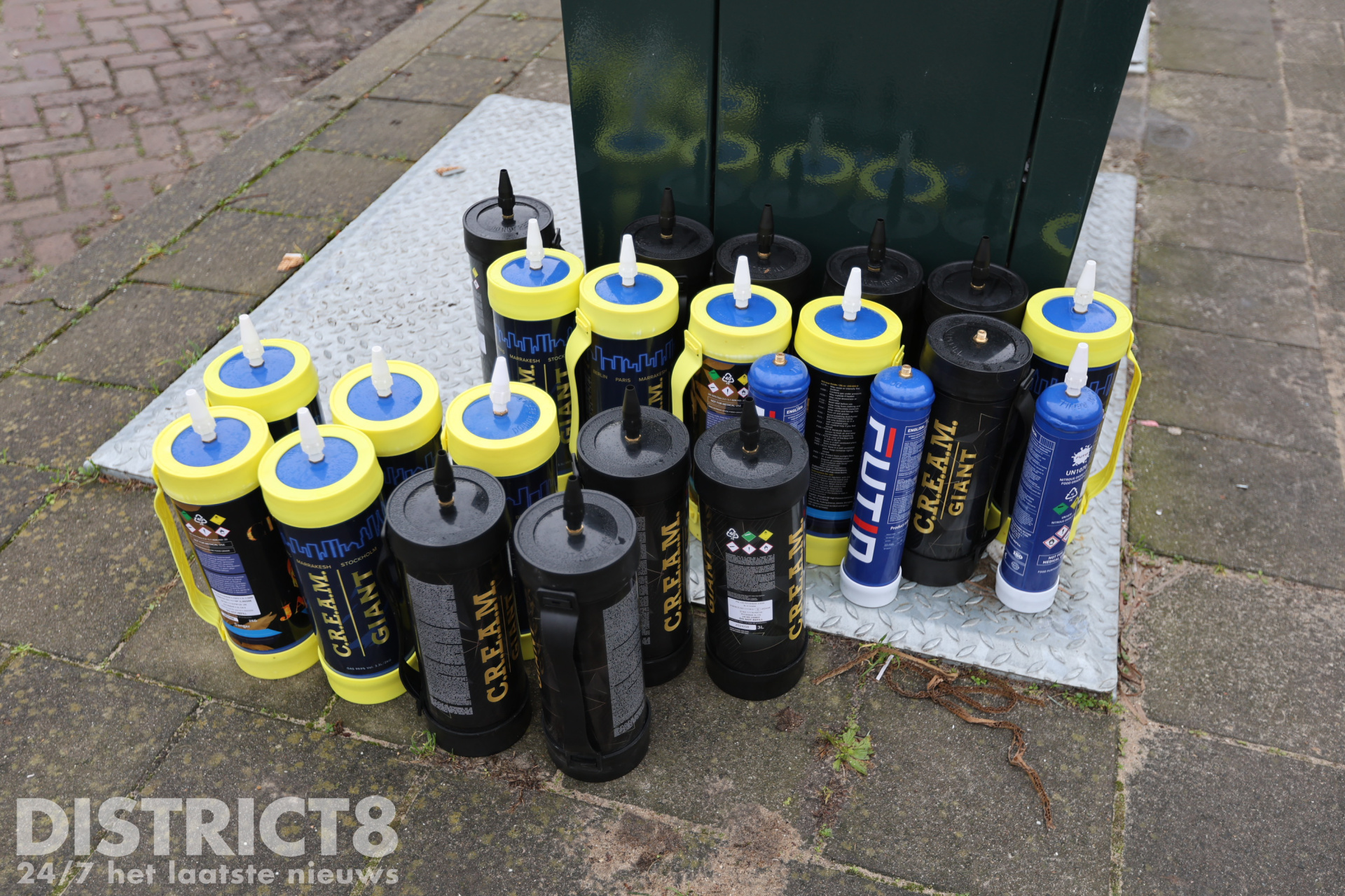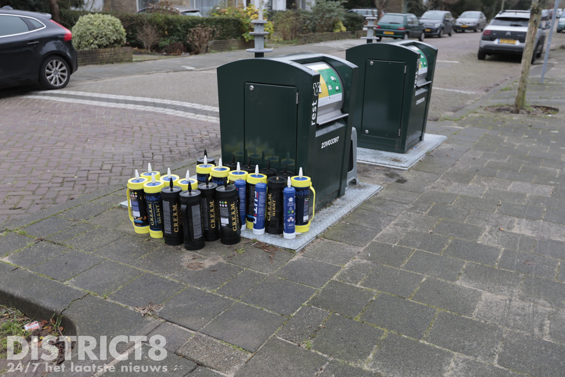 Donderdagochtend 26 december, tweede kerstdag, stonden bij verschillende ondergrondse containers lachgasflessen. Waar er met regelmaat 1 of 2 worden gevonden, waren het er dit keer iets meer.