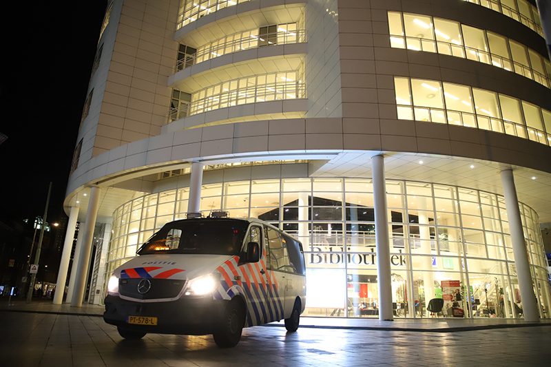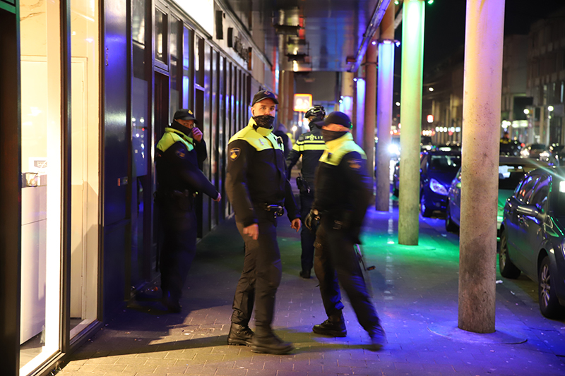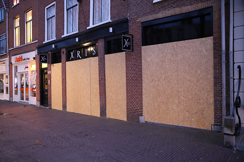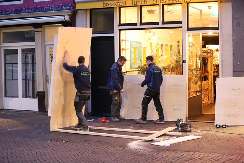 De politie rijdt met verschillende voertuigen rond en houdt alles nauwlettend in de gaten. Meerdere winkeliers in Delft hadden vanavond grote houten platen voor de ramen geplaatst, dit tegen eventuele plunderingen.