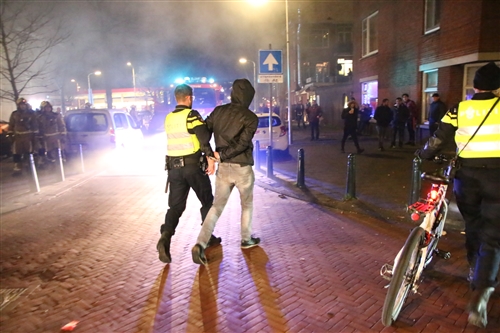 Bij de brand op de Bloemfonteinstraat stonden enkele bewoners op straat. Jongeren gooide zwaar vuurwerk richting de hulpdiensten en de bewoners. Een oudere man werd door het vuurwerk geraakt en liep brandwonden op. Een agente had enige tijd last van haar oren.