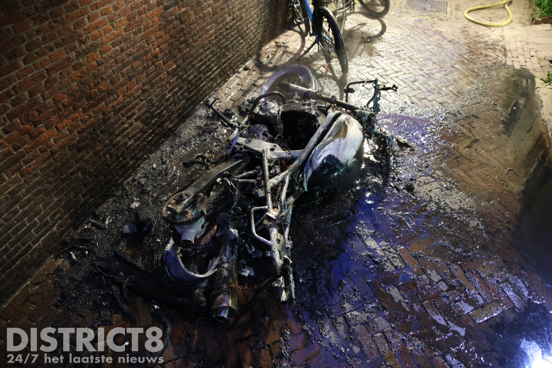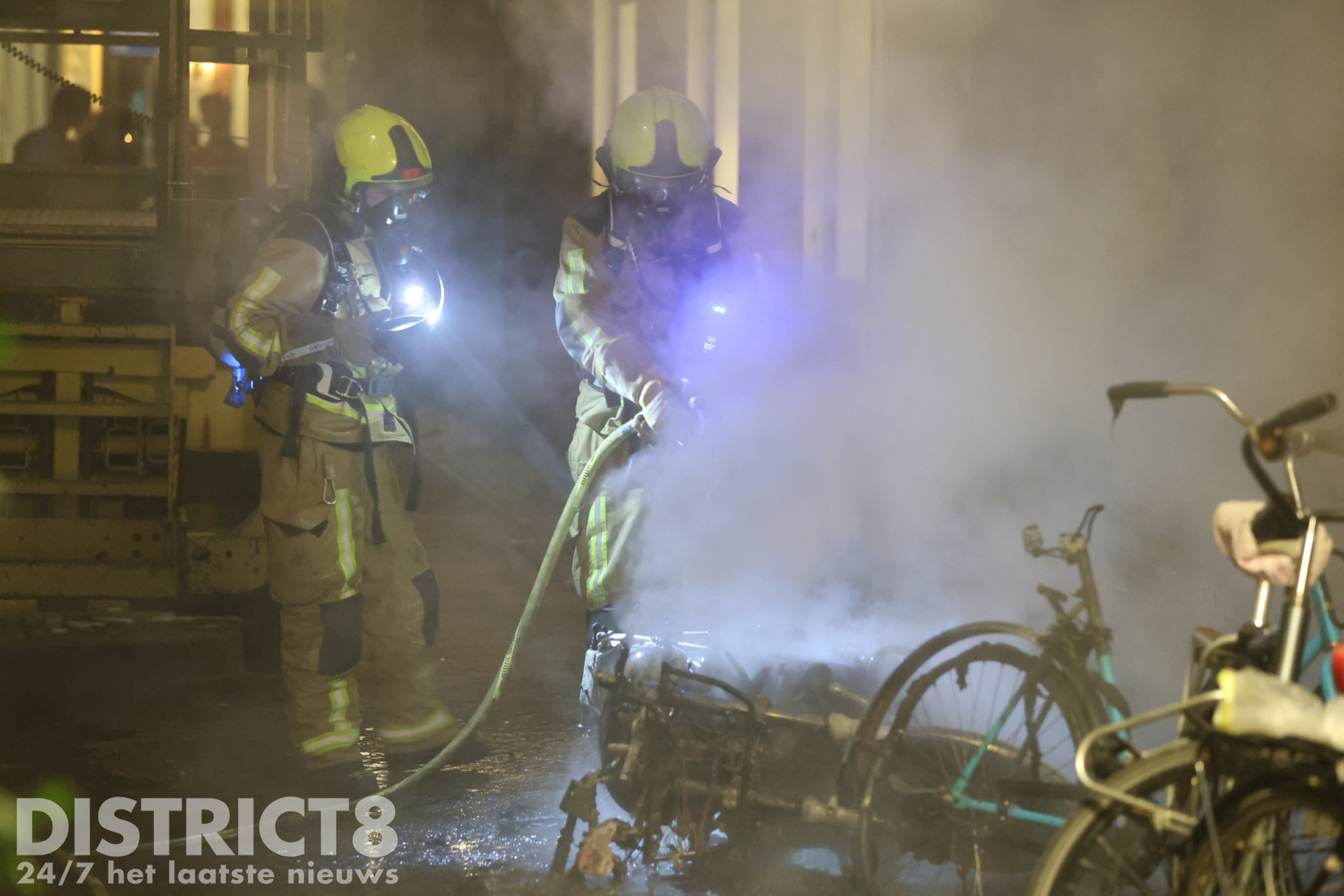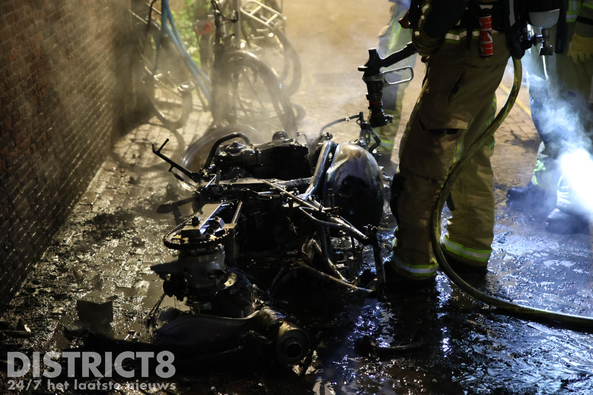 Bij aankomst stond de motor al volledig in brand, ook een fiets was inmiddels door de vlammen aangestraald en in brand gevlogen.
