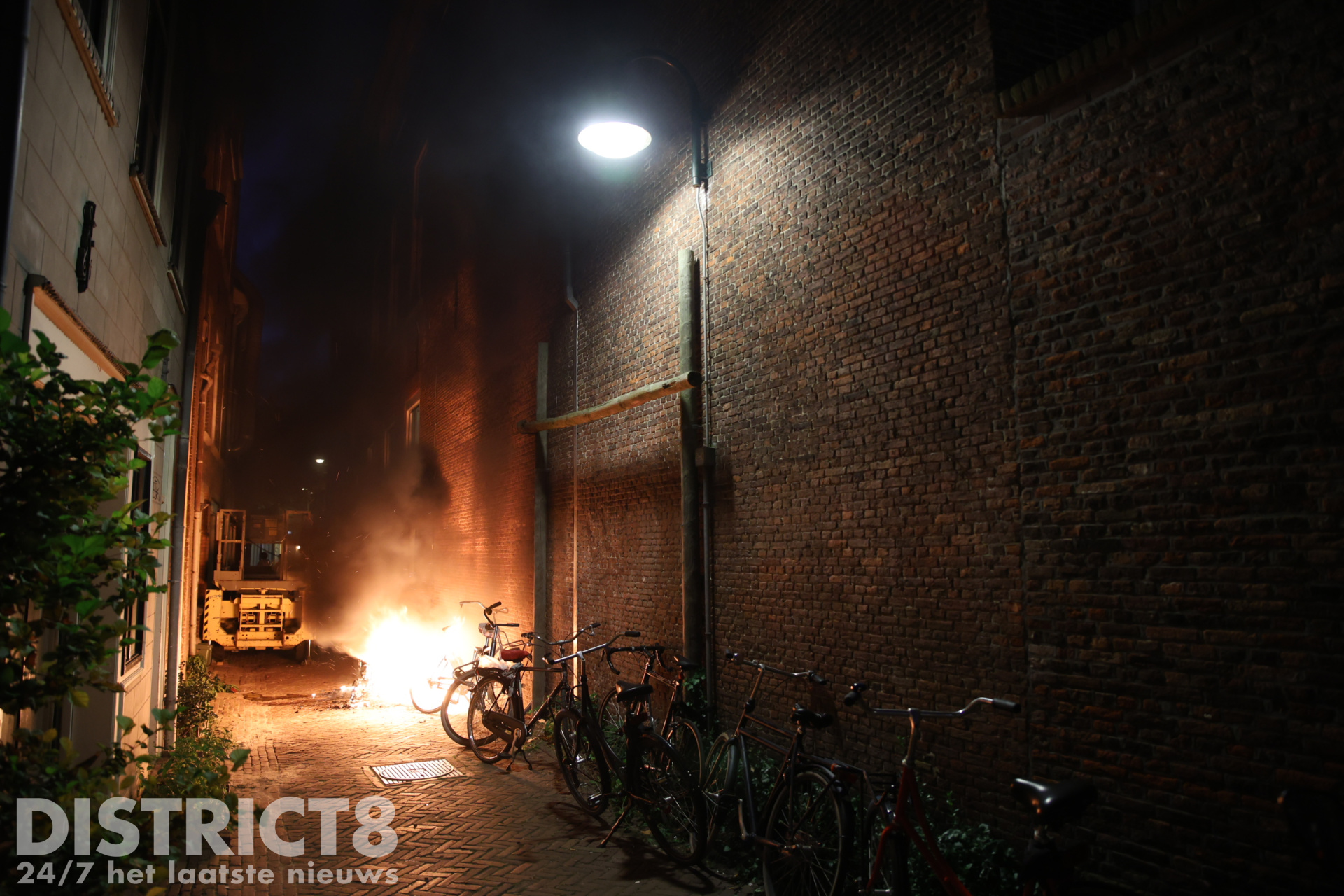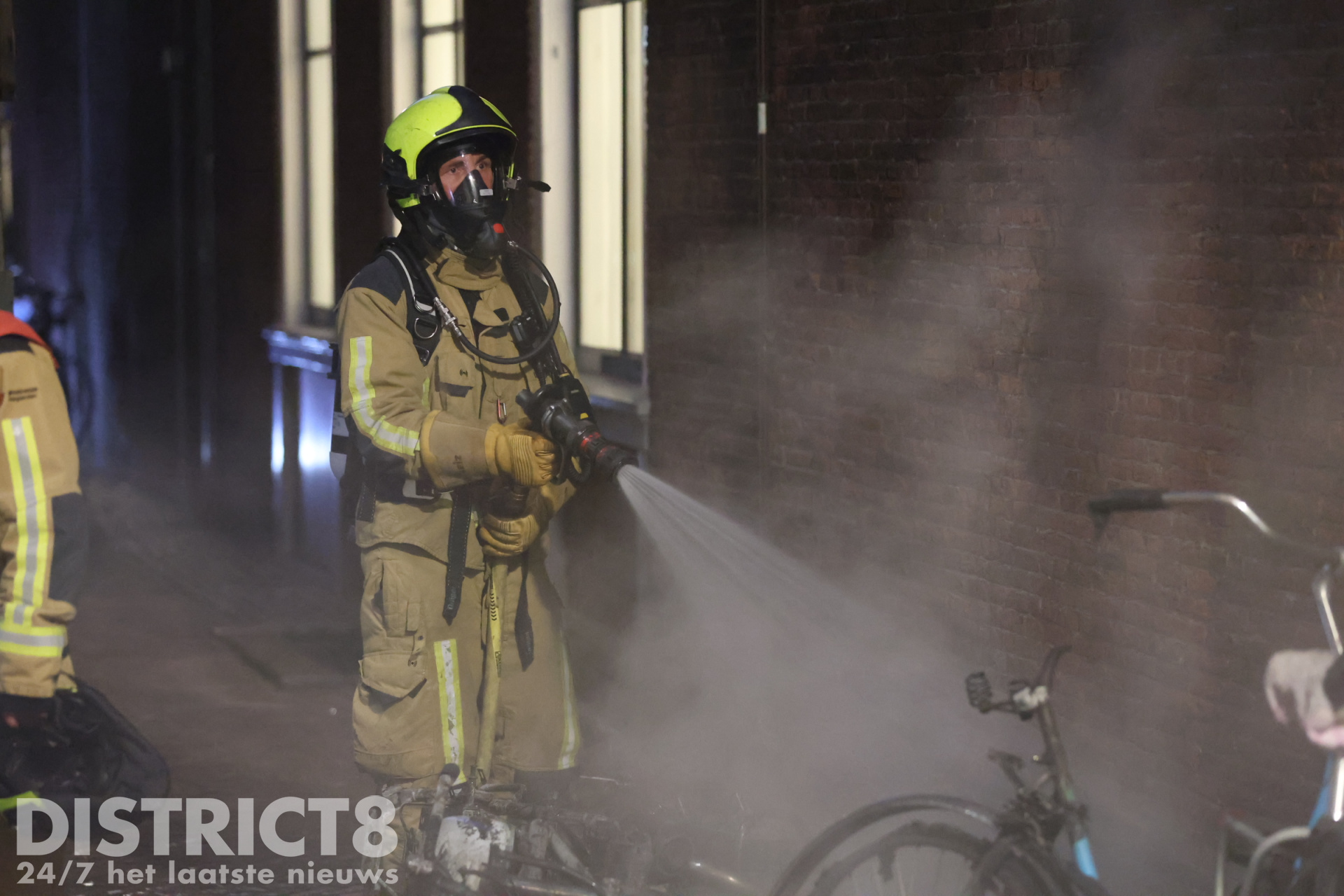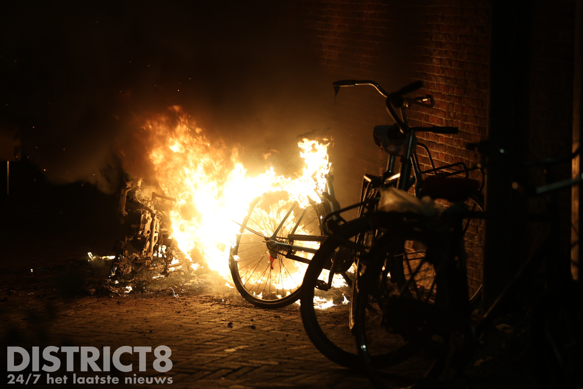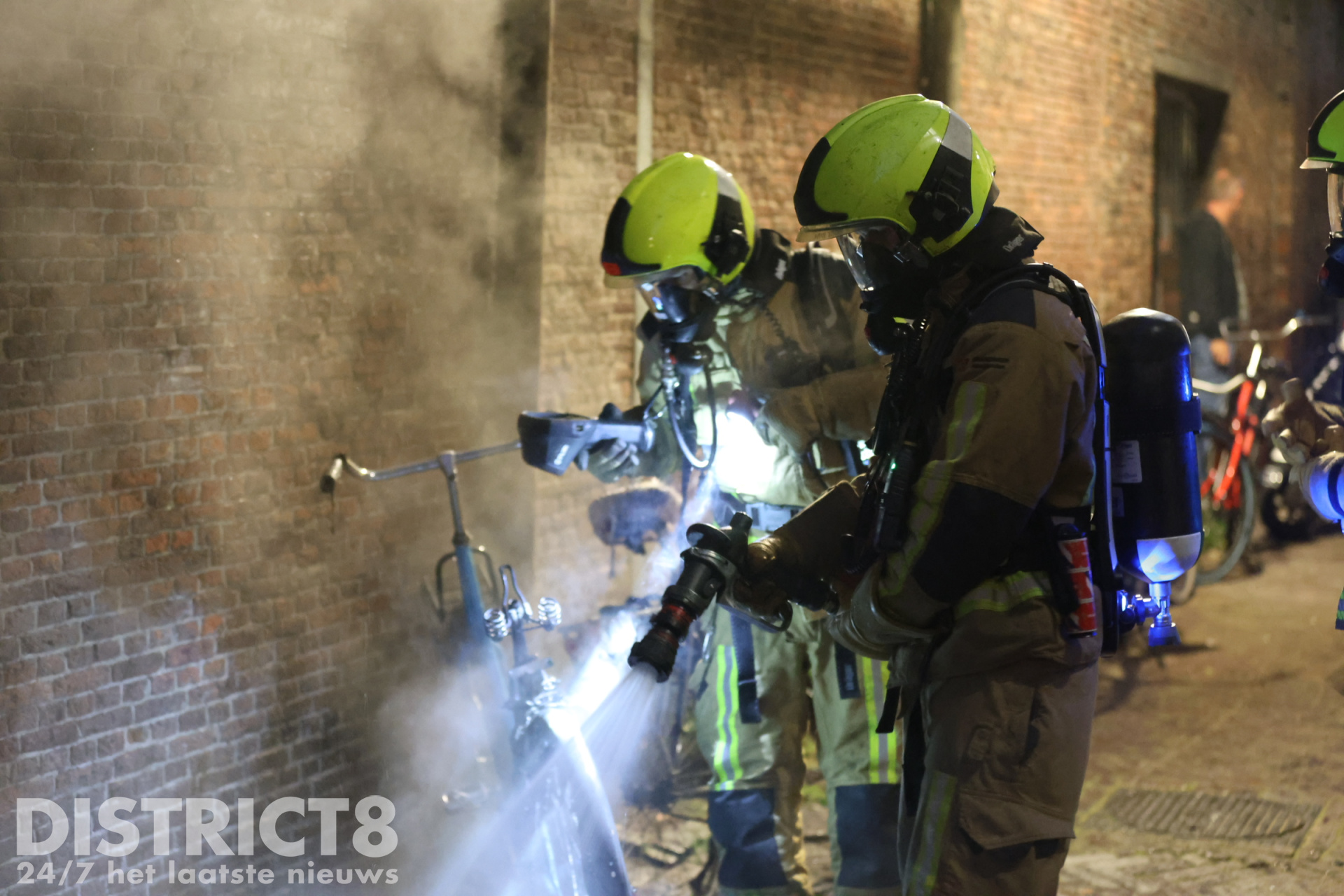 Bij aankomst stond de motor al volledig in brand, ook een fiets was inmiddels door de vlammen aangestraald en in brand gevlogen.