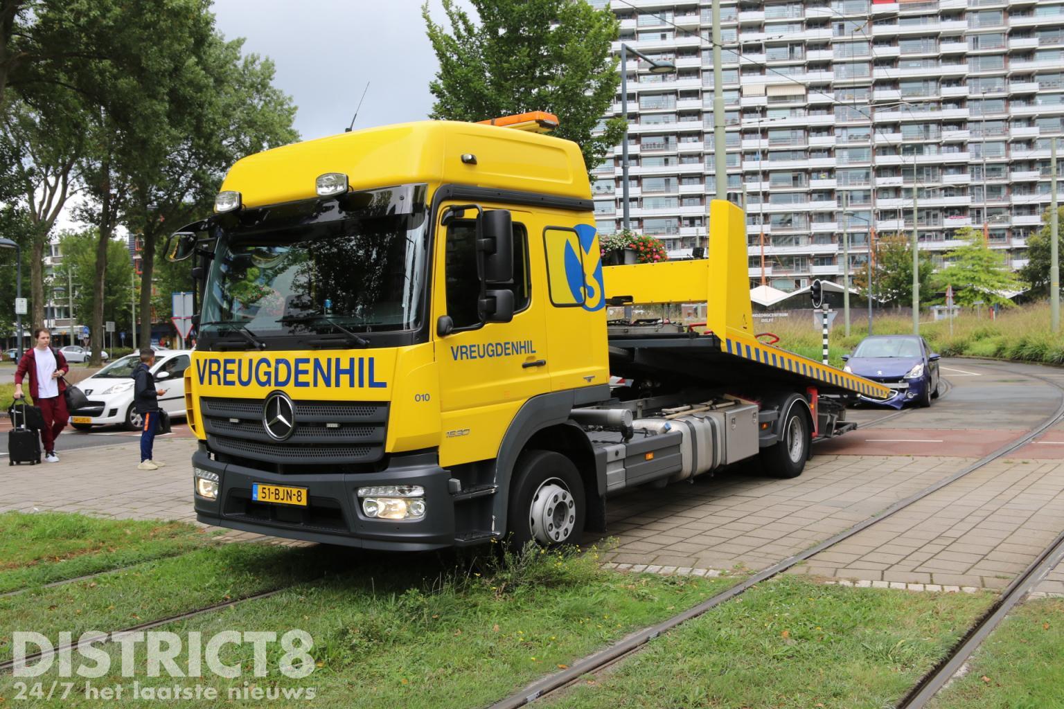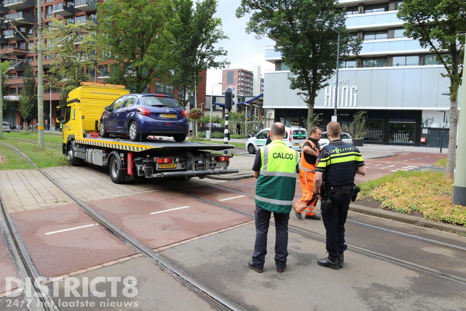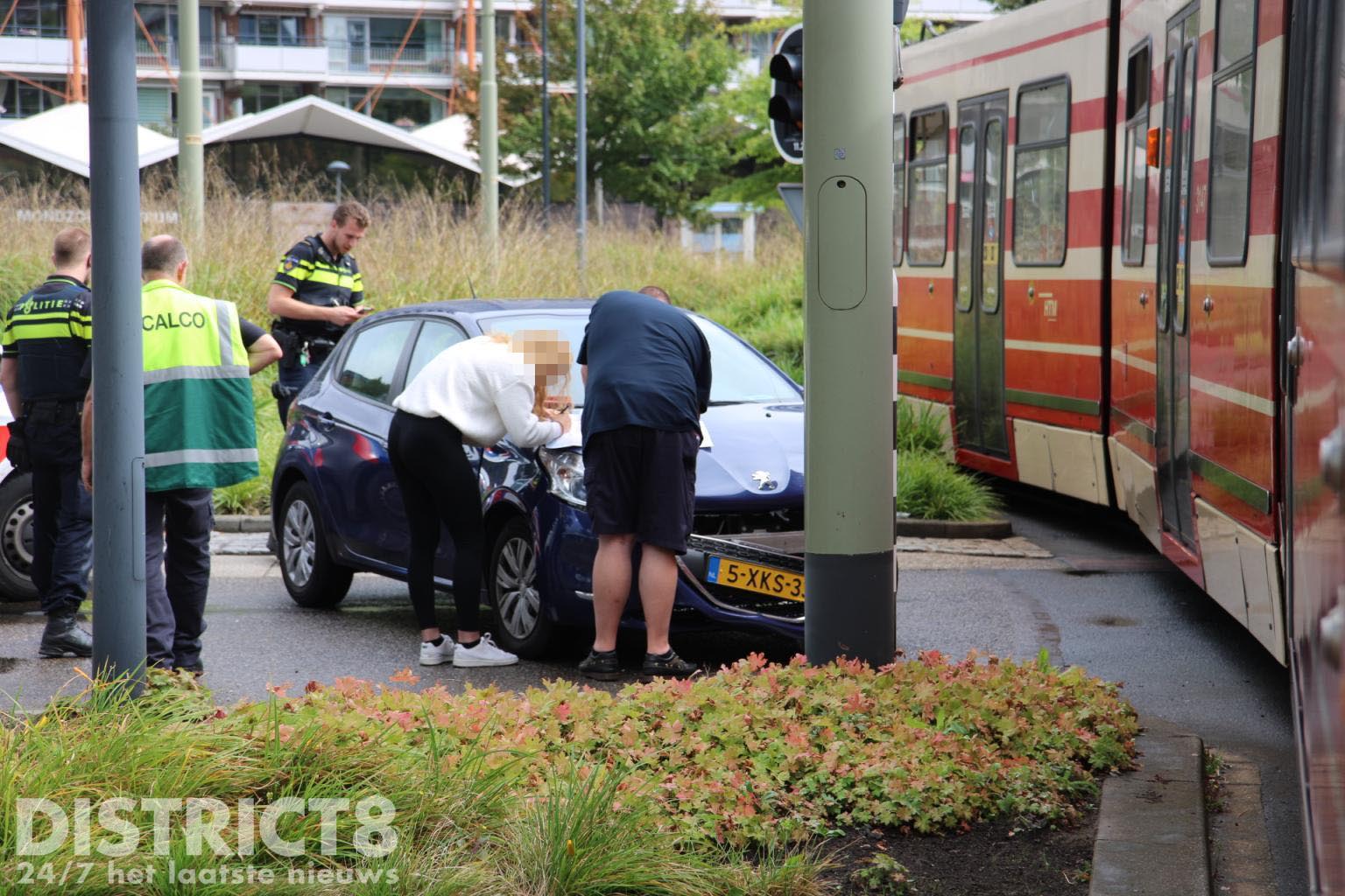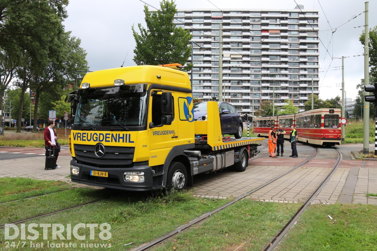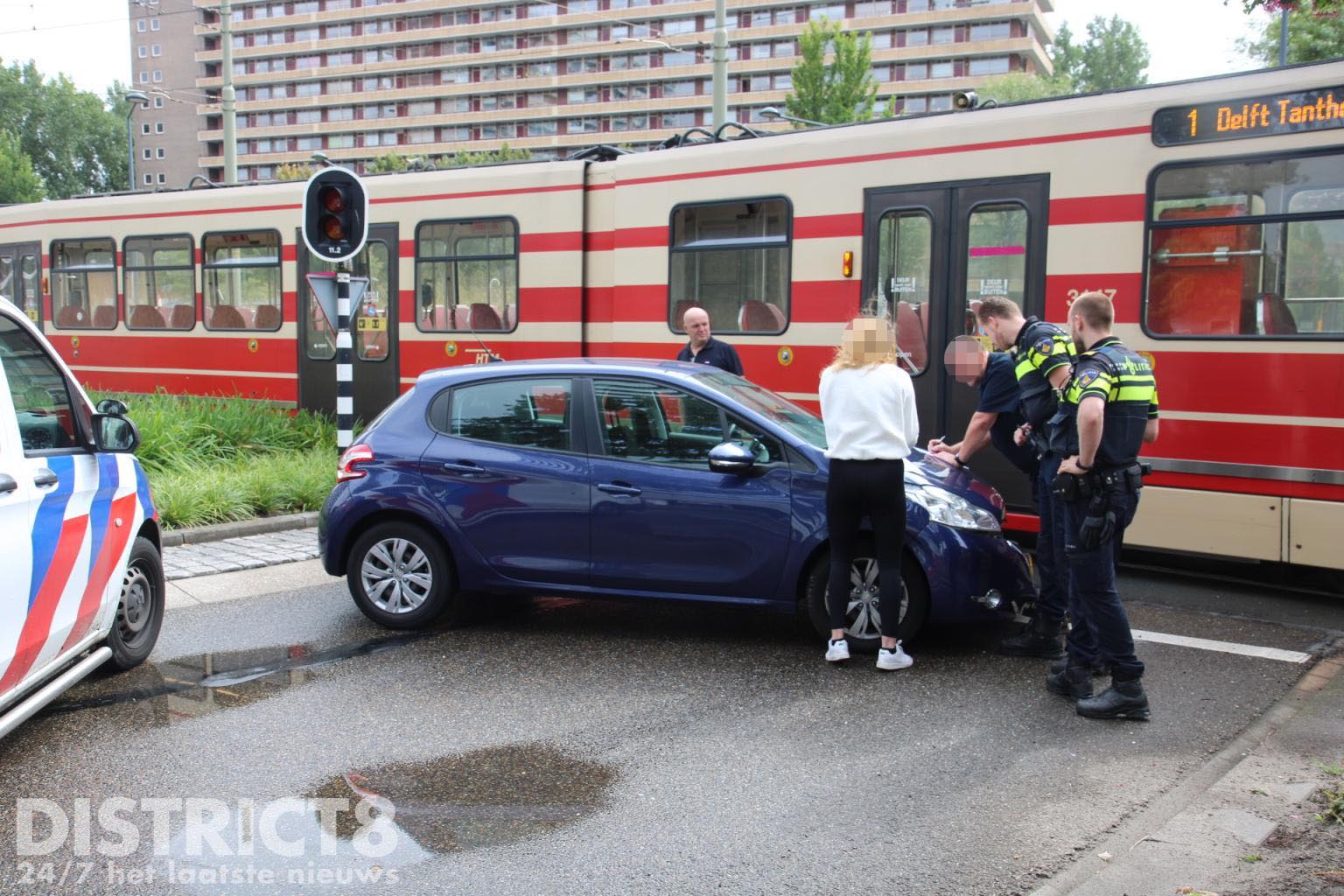 Door de aanrijding is tram 1 naar Delft Tanthof gestremd. Bergingsbedrijf Vreugdenhil heeft de personenauto geborgen.