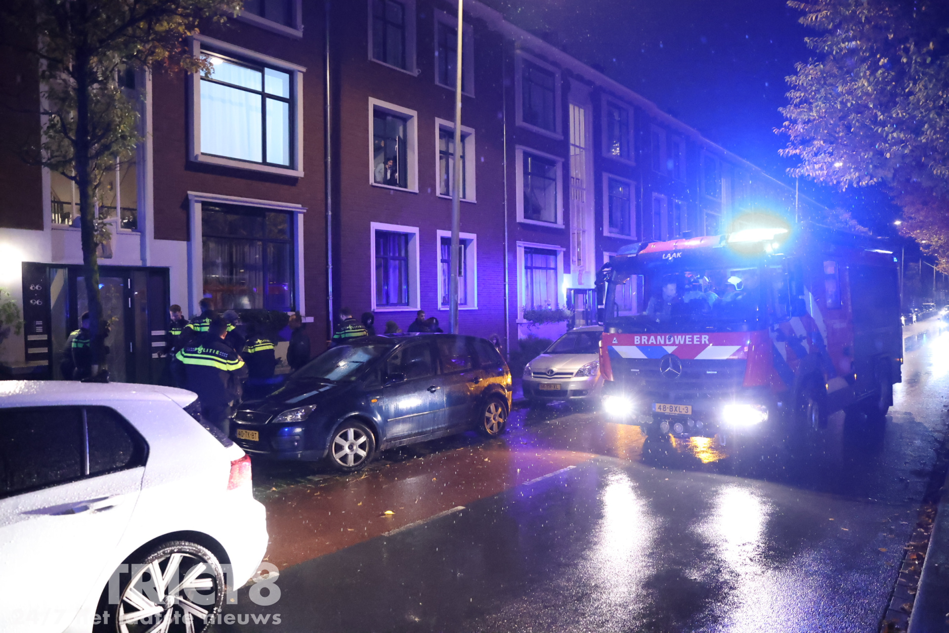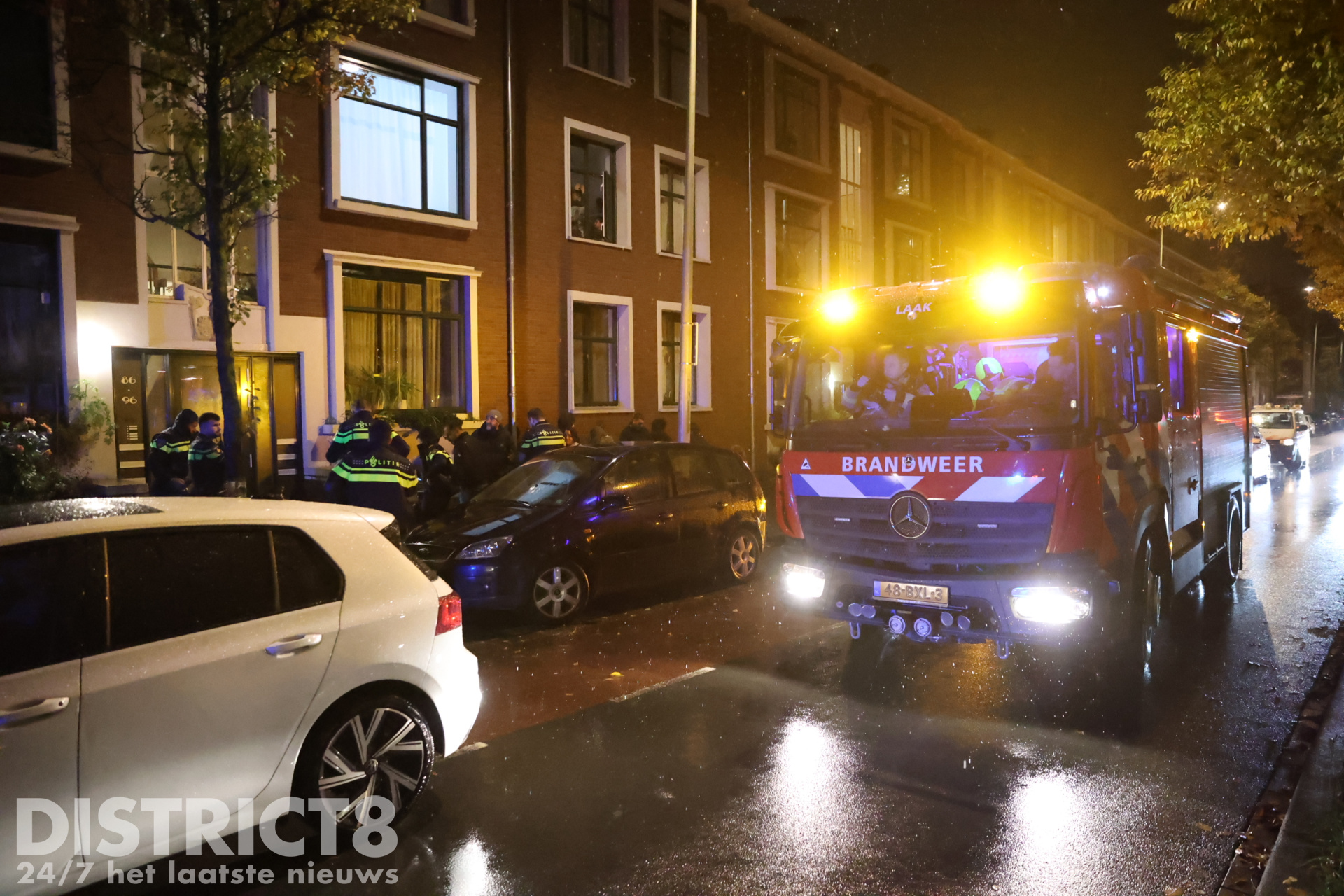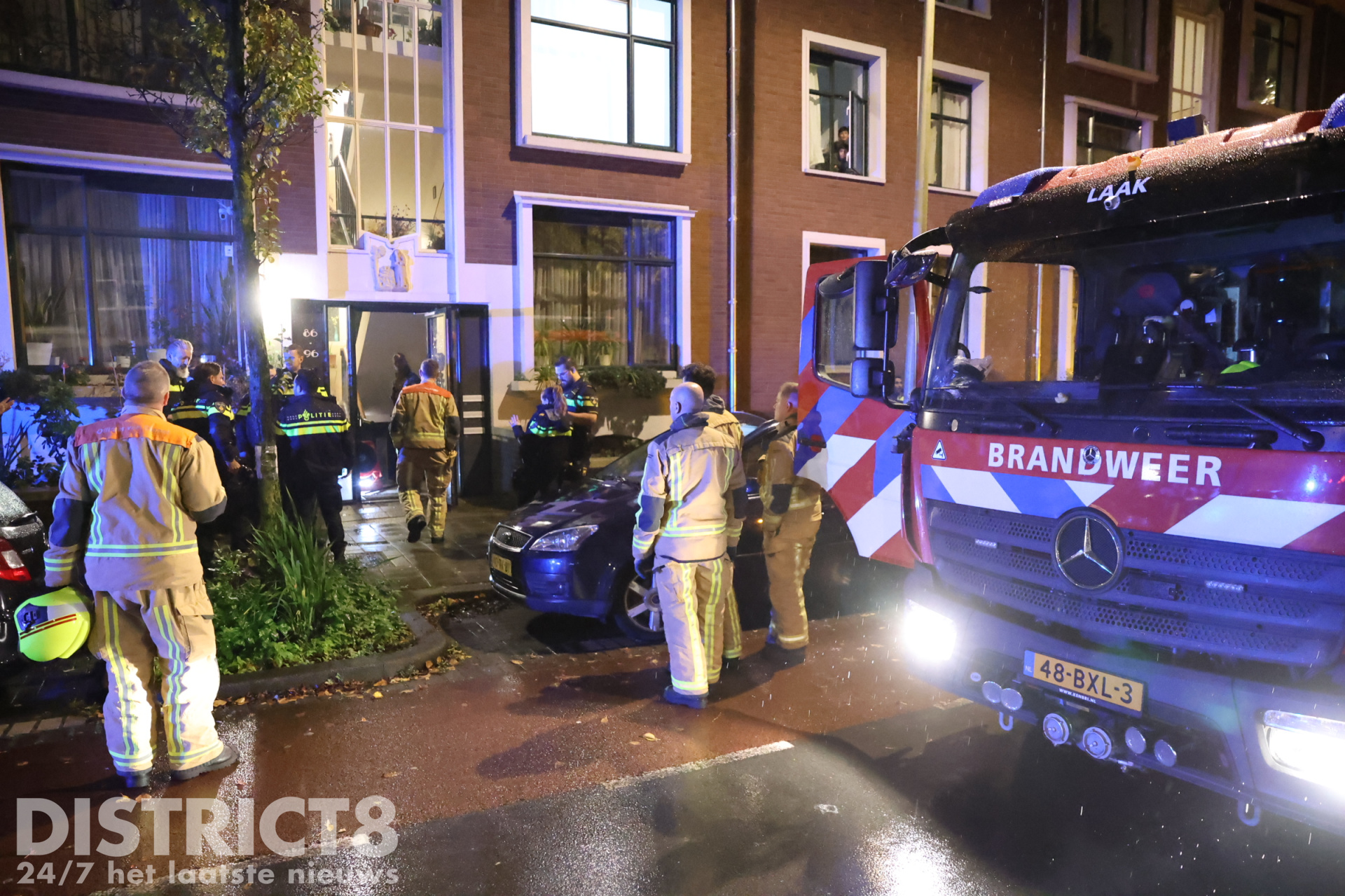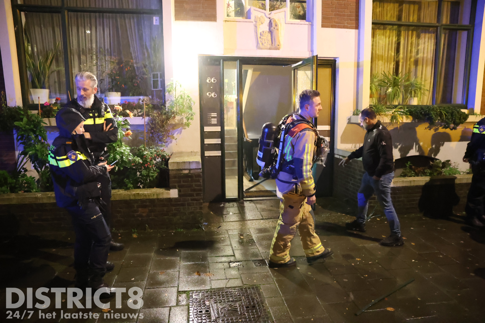 De brandweer ventileert het portiek, terwijl meerdere bewoners op straat staan.