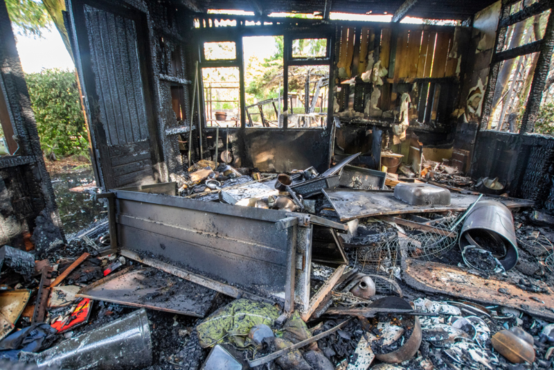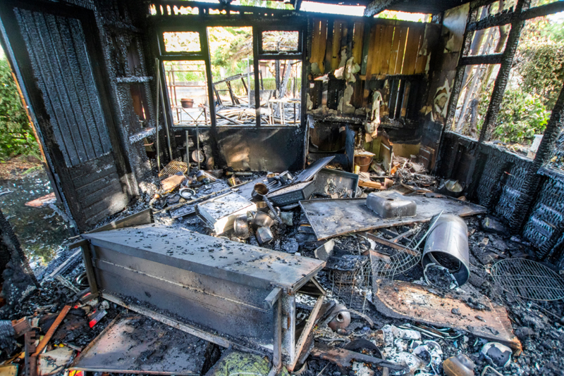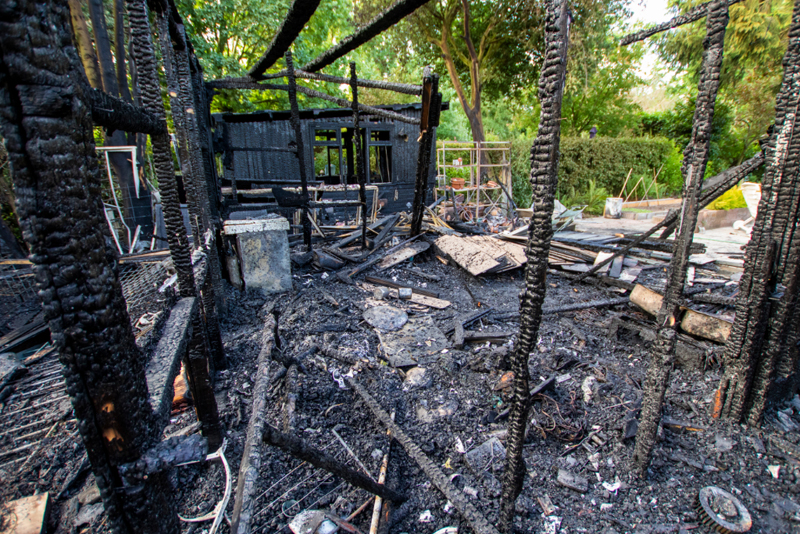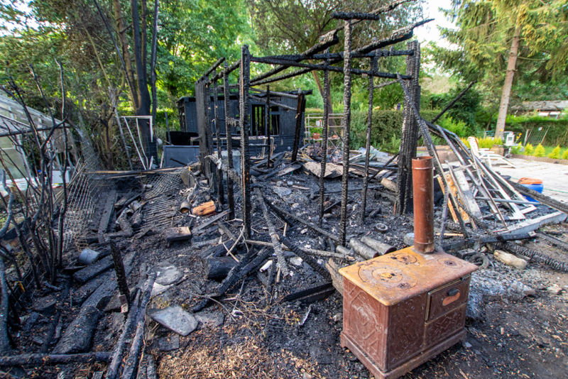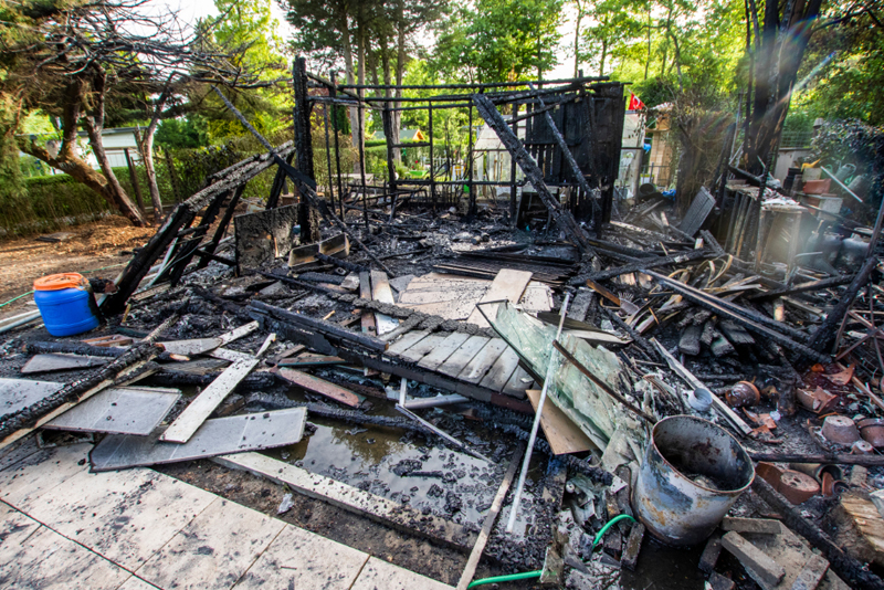 Schiedam – De enorme schade die een brand in de nacht van zaterdag op zondag veroorzaakte bij 2 tuinhuisjes op Volkstuincomplex Vijfsluizen is bij daglicht goed zichtbaar.