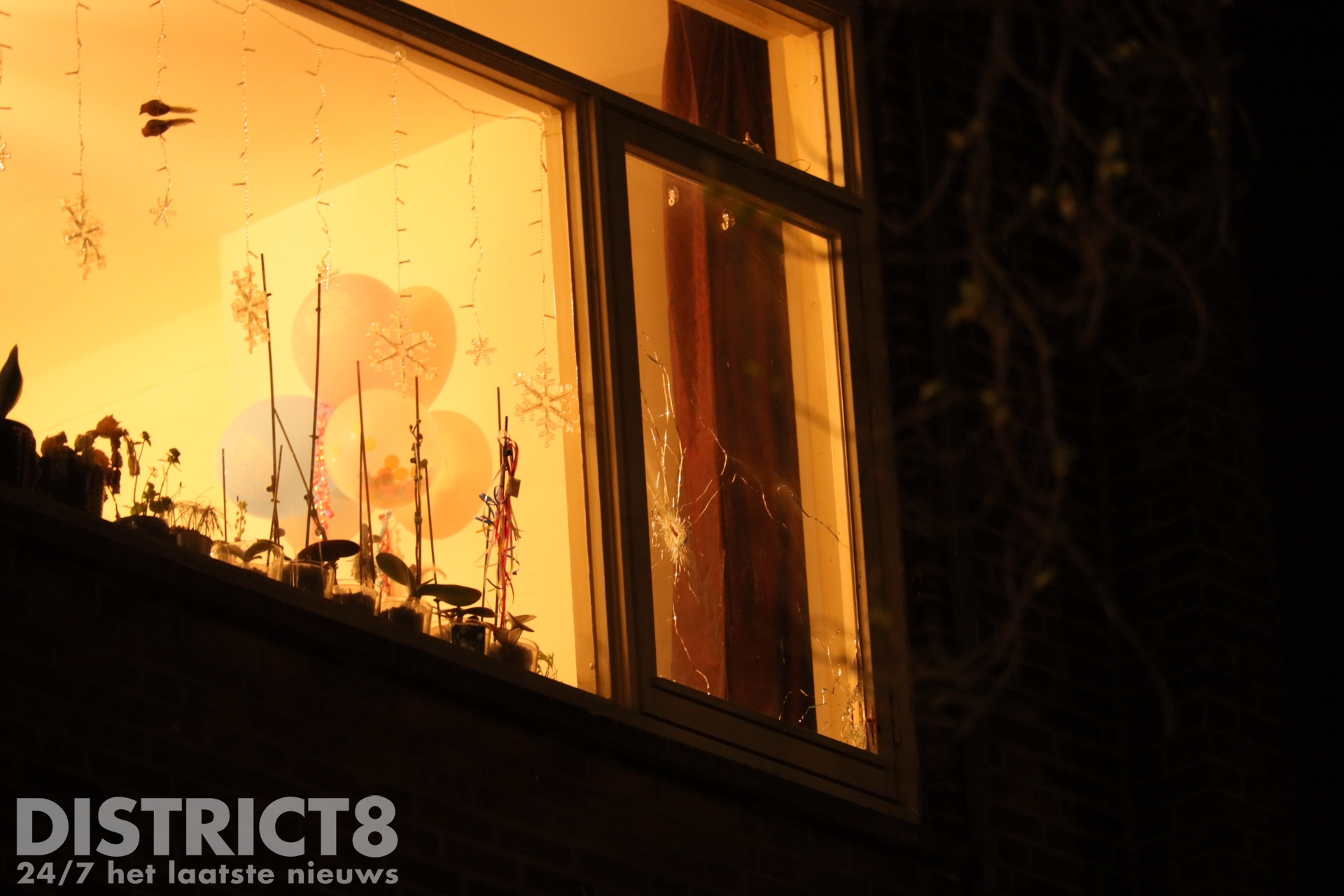 In een raam op de derde verdieping van een portiekwoning zitten meerdere kogelinslagen.