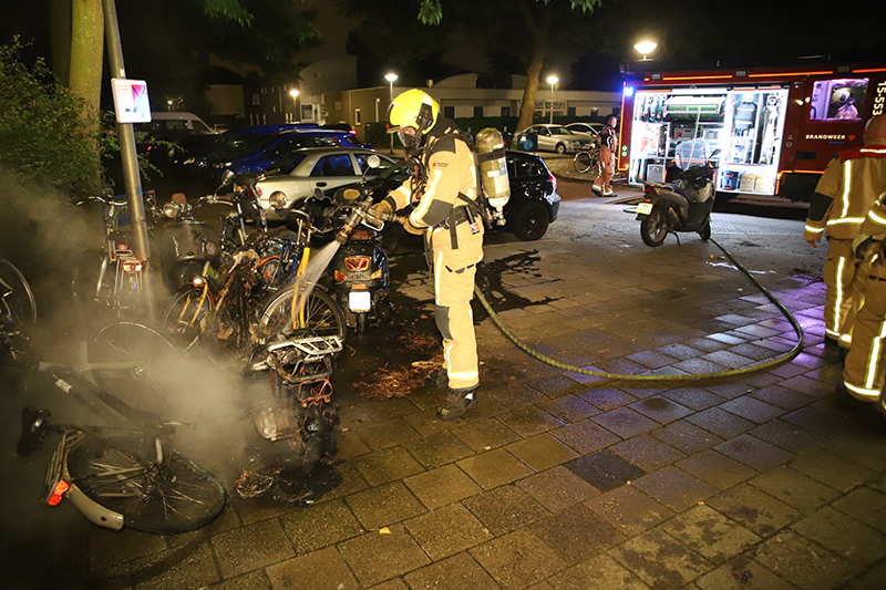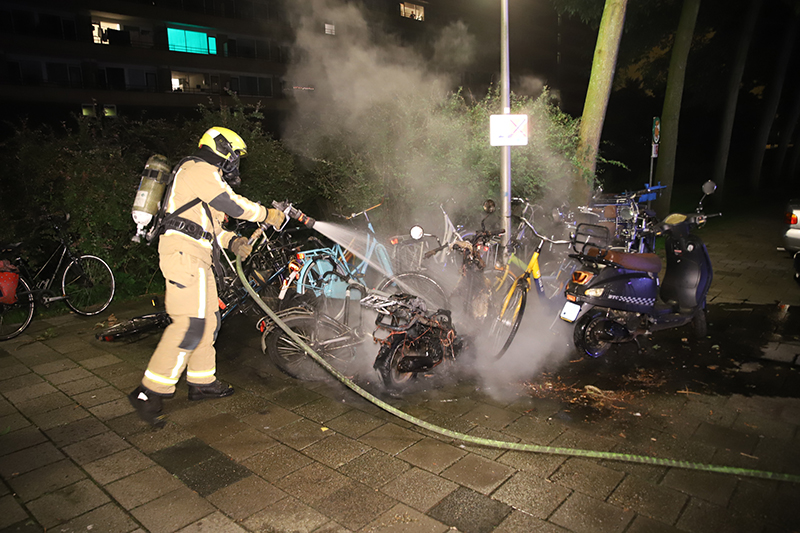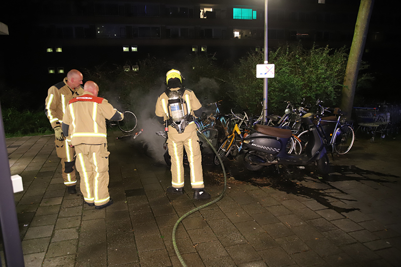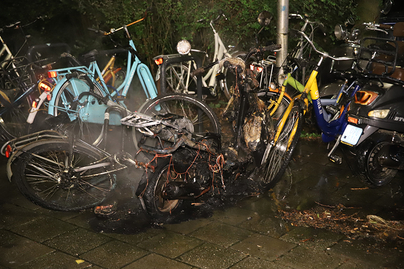 De scooter stond in brand nabij enkele fietsen en een scooter, deze raakte door de brand licht beschadigd.