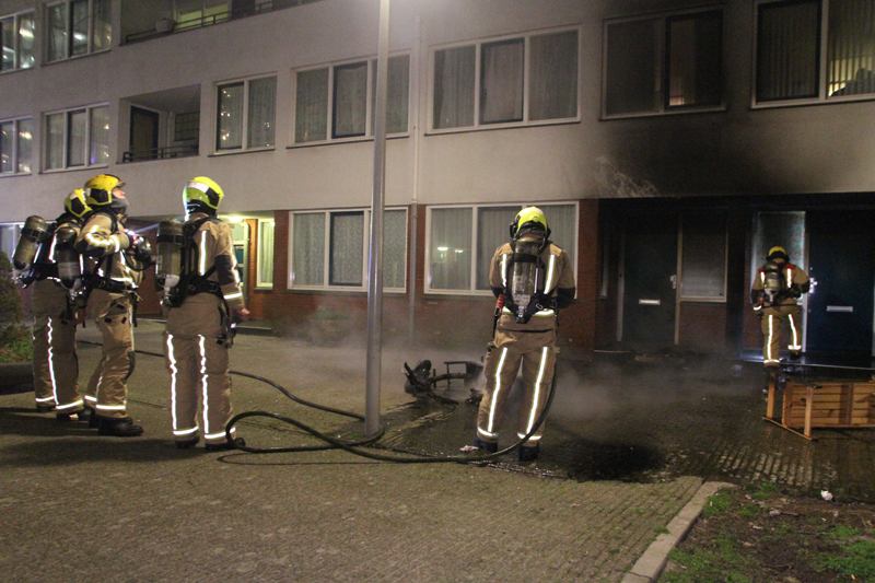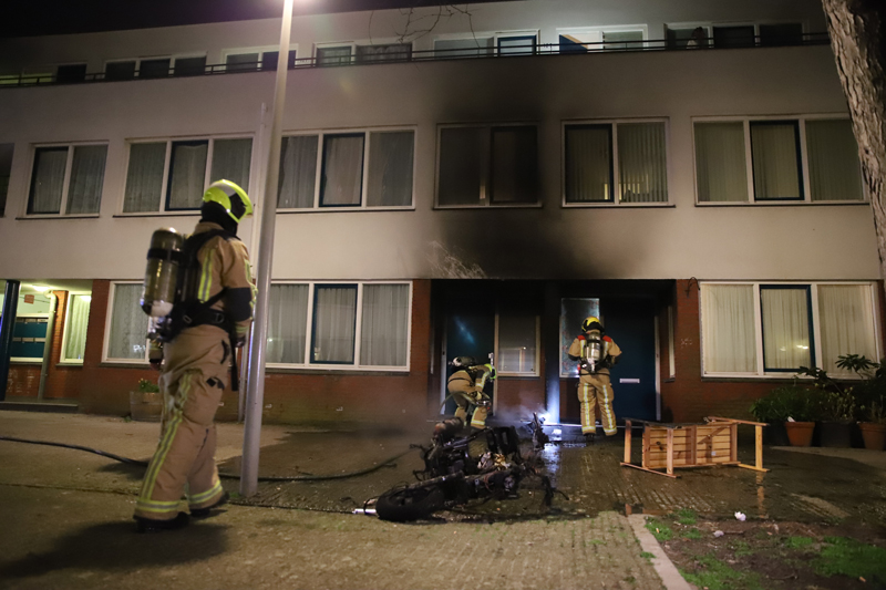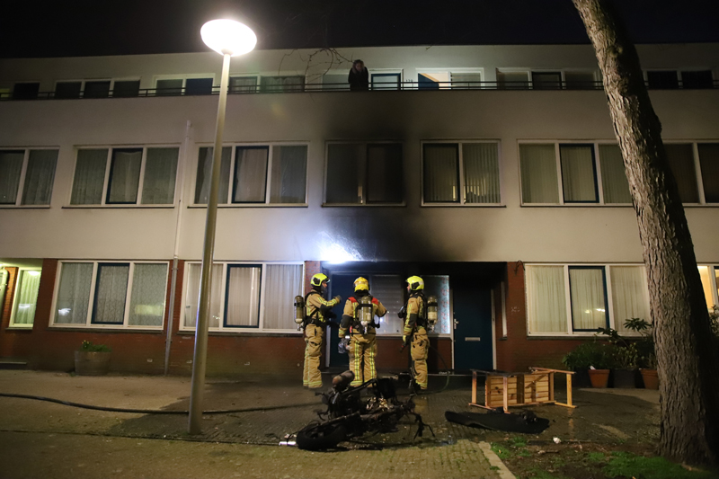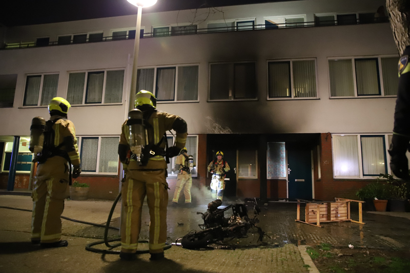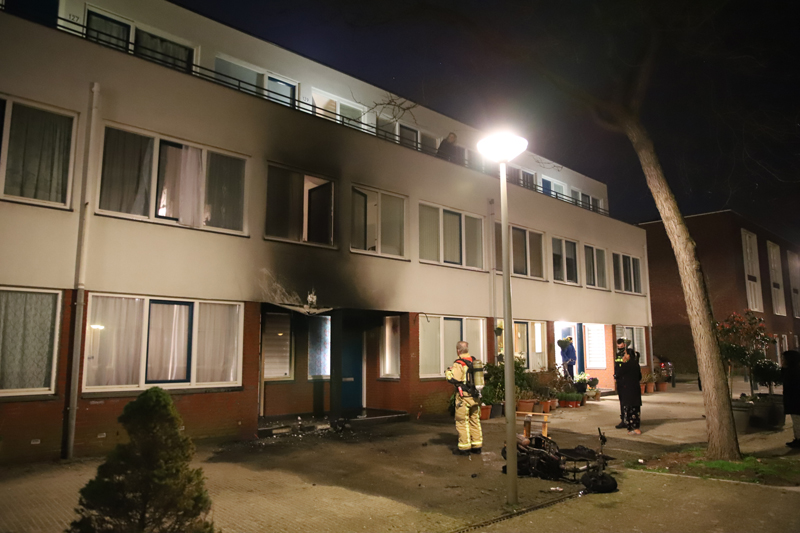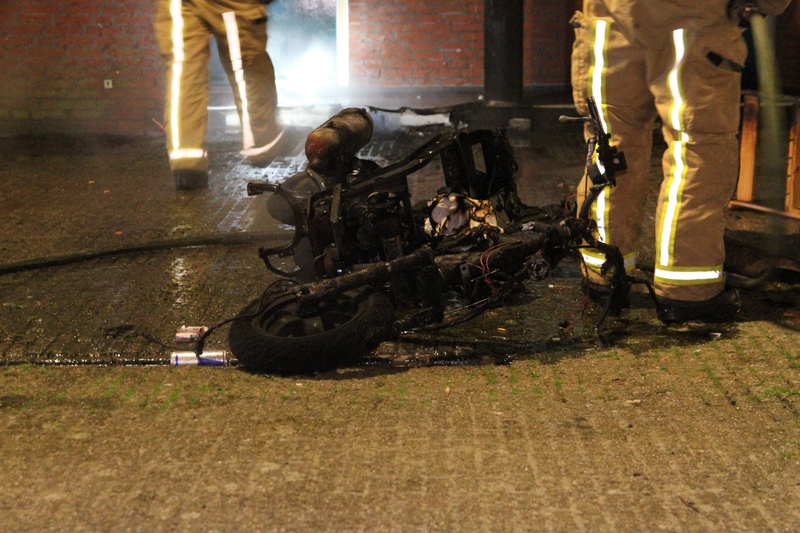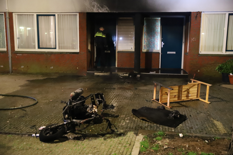 De brandweer kreeg omstreeks half twee vannacht een melding van een brand in een woning. Toen zij ter plekke aankwamen bleek dat de brand niet in de woning woedde, maar bij de voordeur. Een scooter stond volledig in brand.