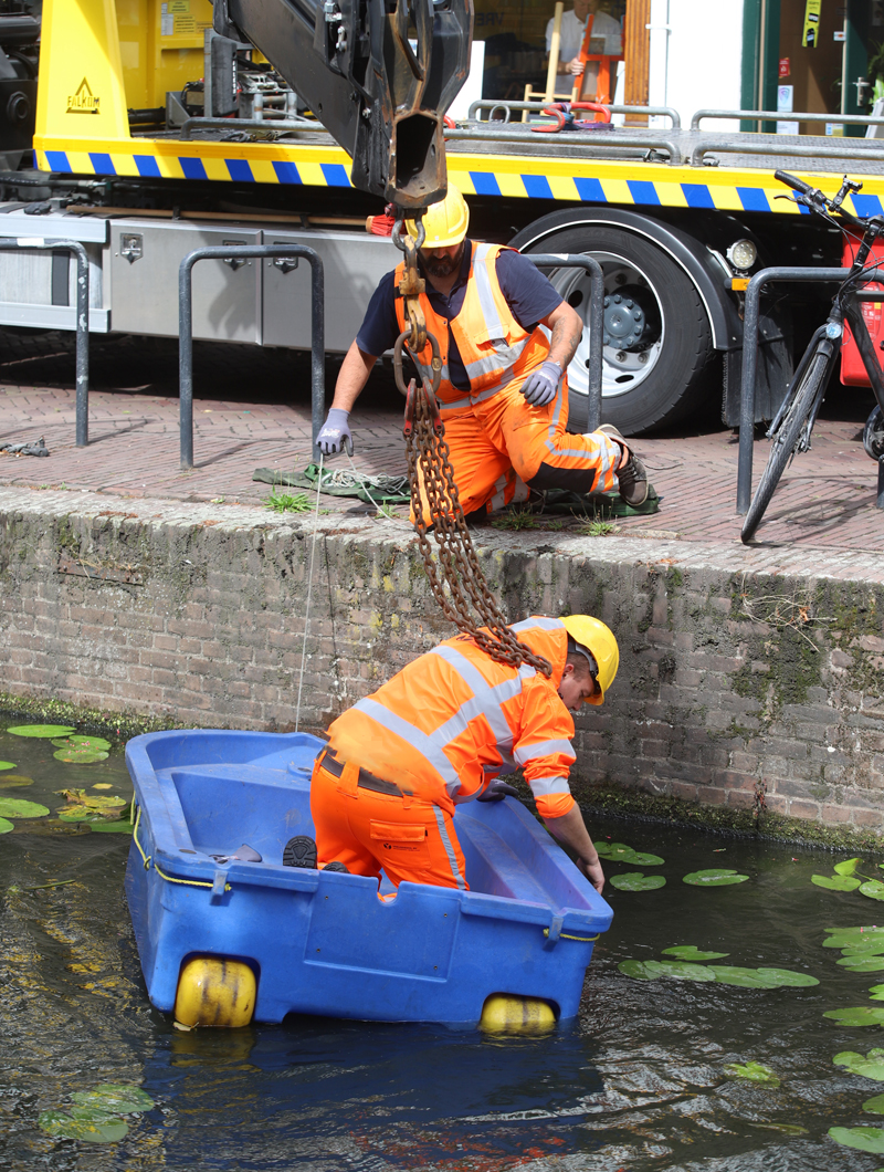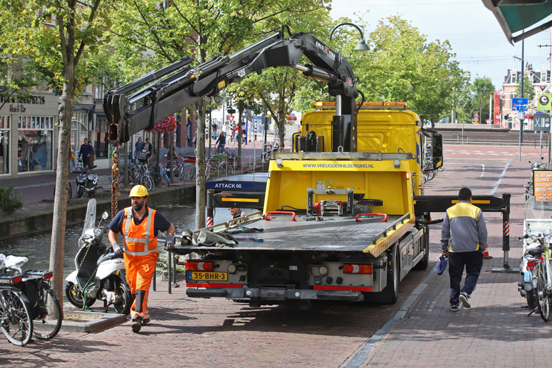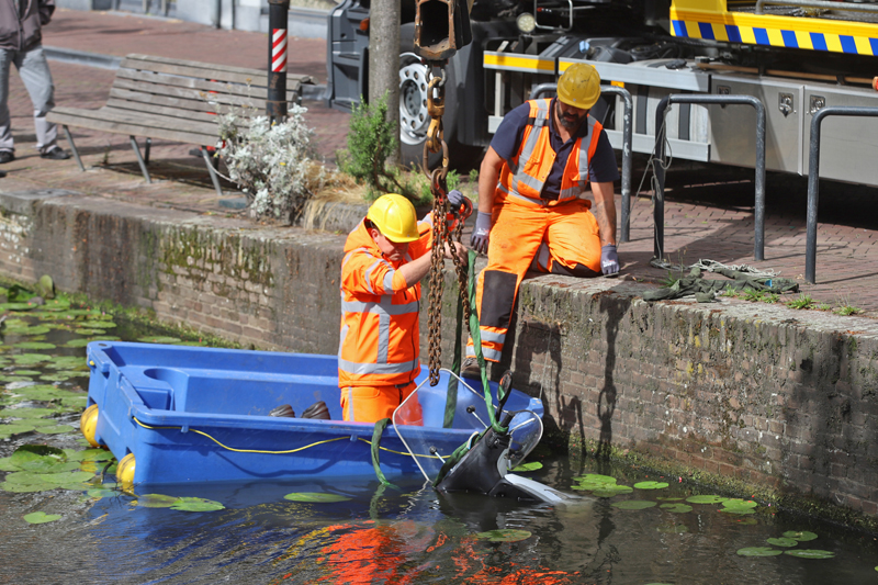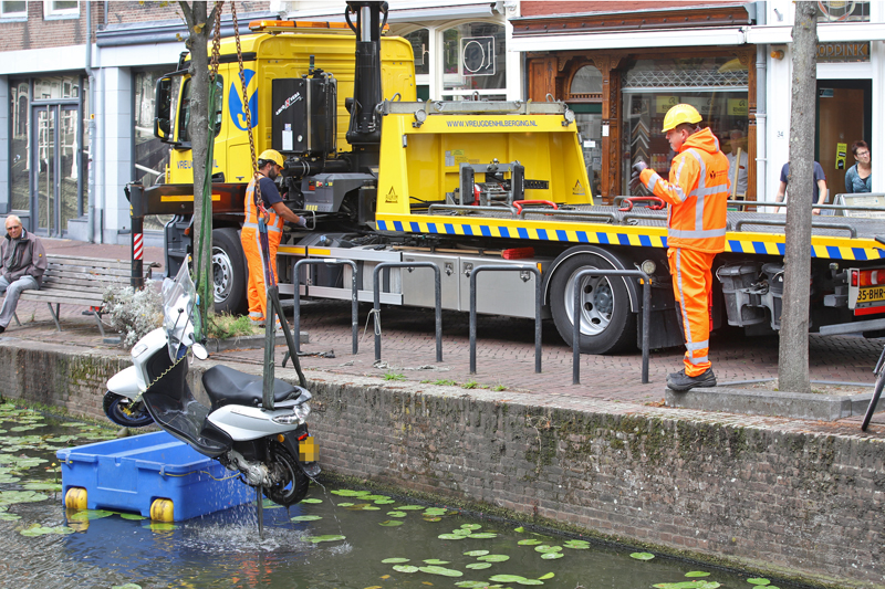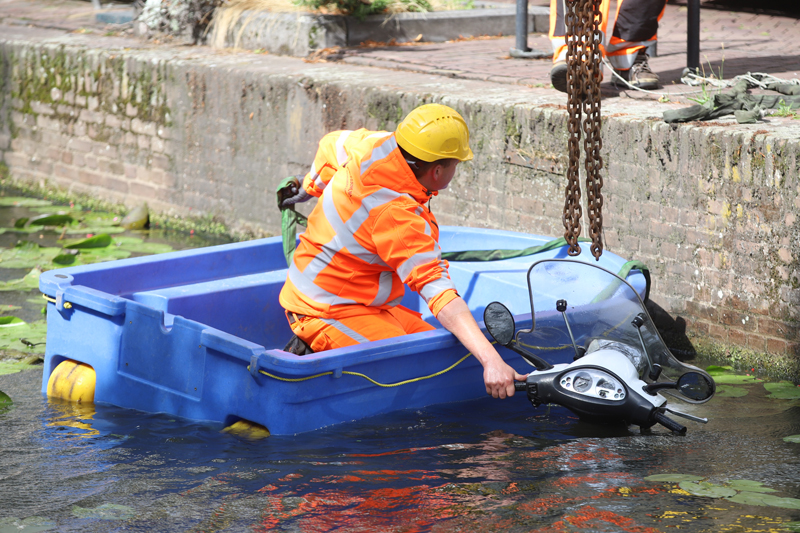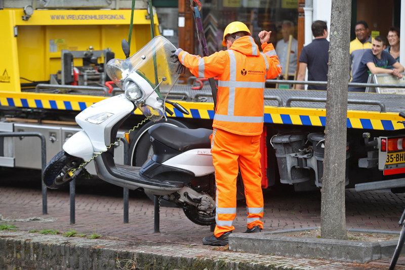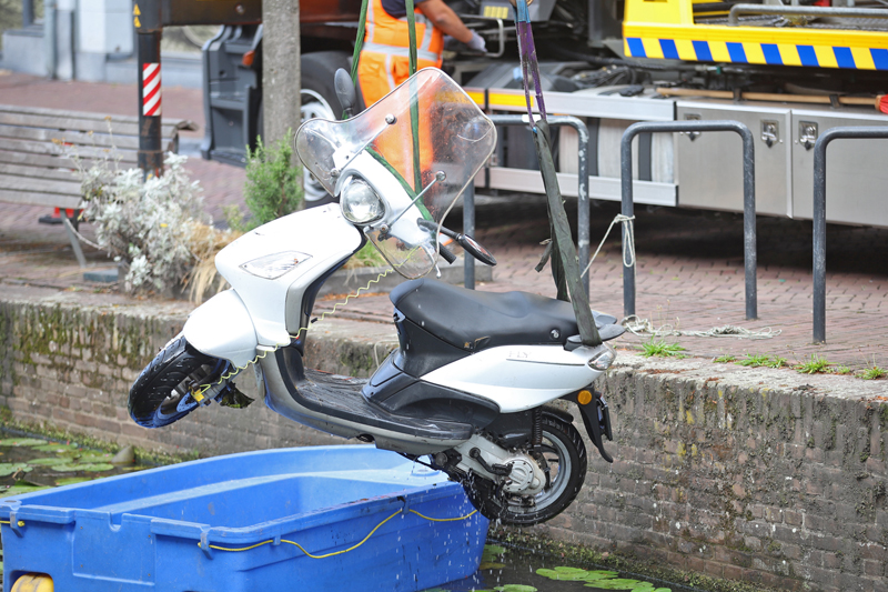 Twee wagens van bergingsbedrijf Vreugdenhil kwamen ter plaatse om de scooter uit het water te halen, met een bootje kregen de bergers de scooter aan de haak om deze hierna uit de gracht te halen.