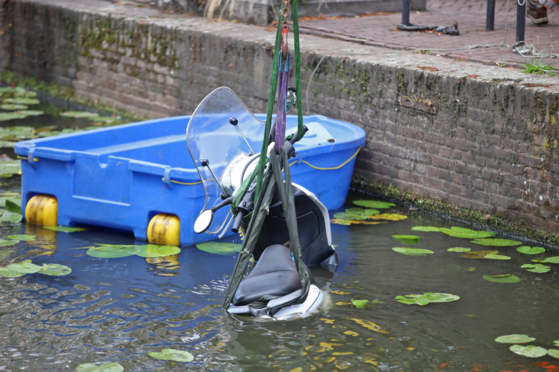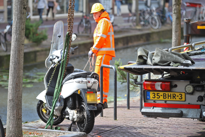 Delft – Een scooter is zaterdagochtend 10 augustus in het water gevallen aan de Binnenwatersloot in Delft. De scooter viel door een windvlaag in de gracht.
