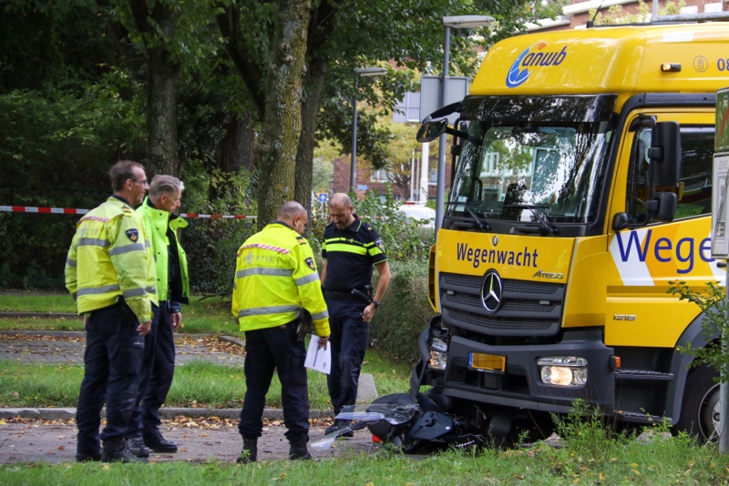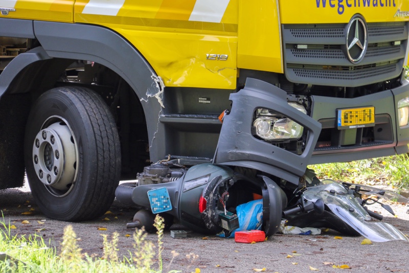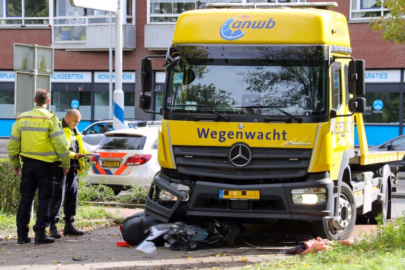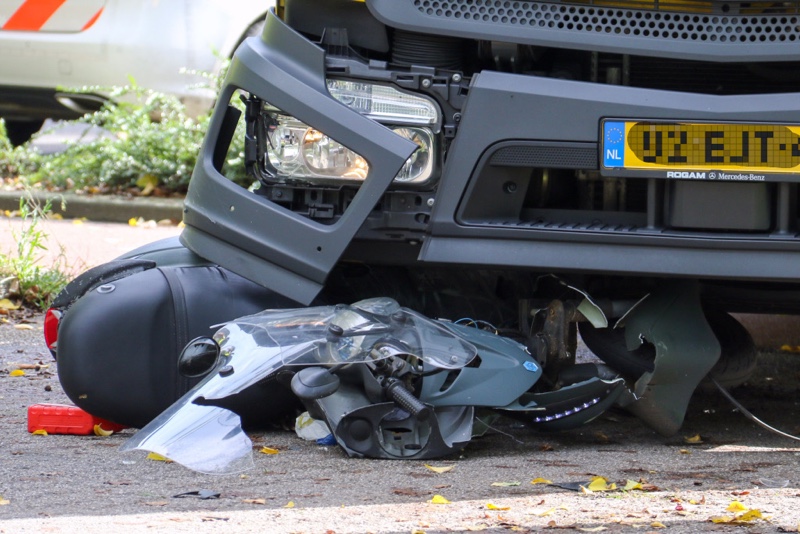 Van de scooter die onder de vrachtwagen terecht kwam is nog maar weinig over.