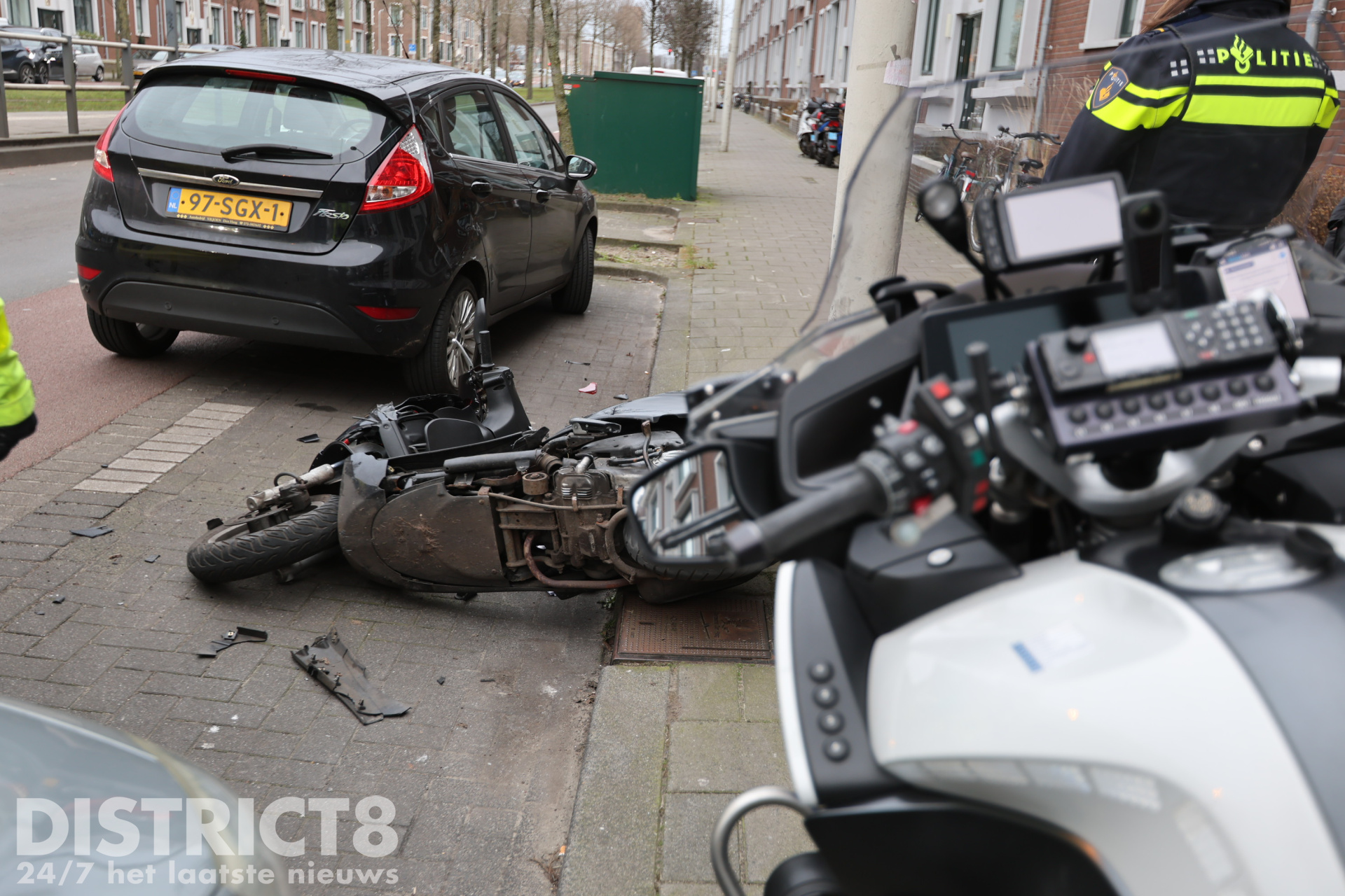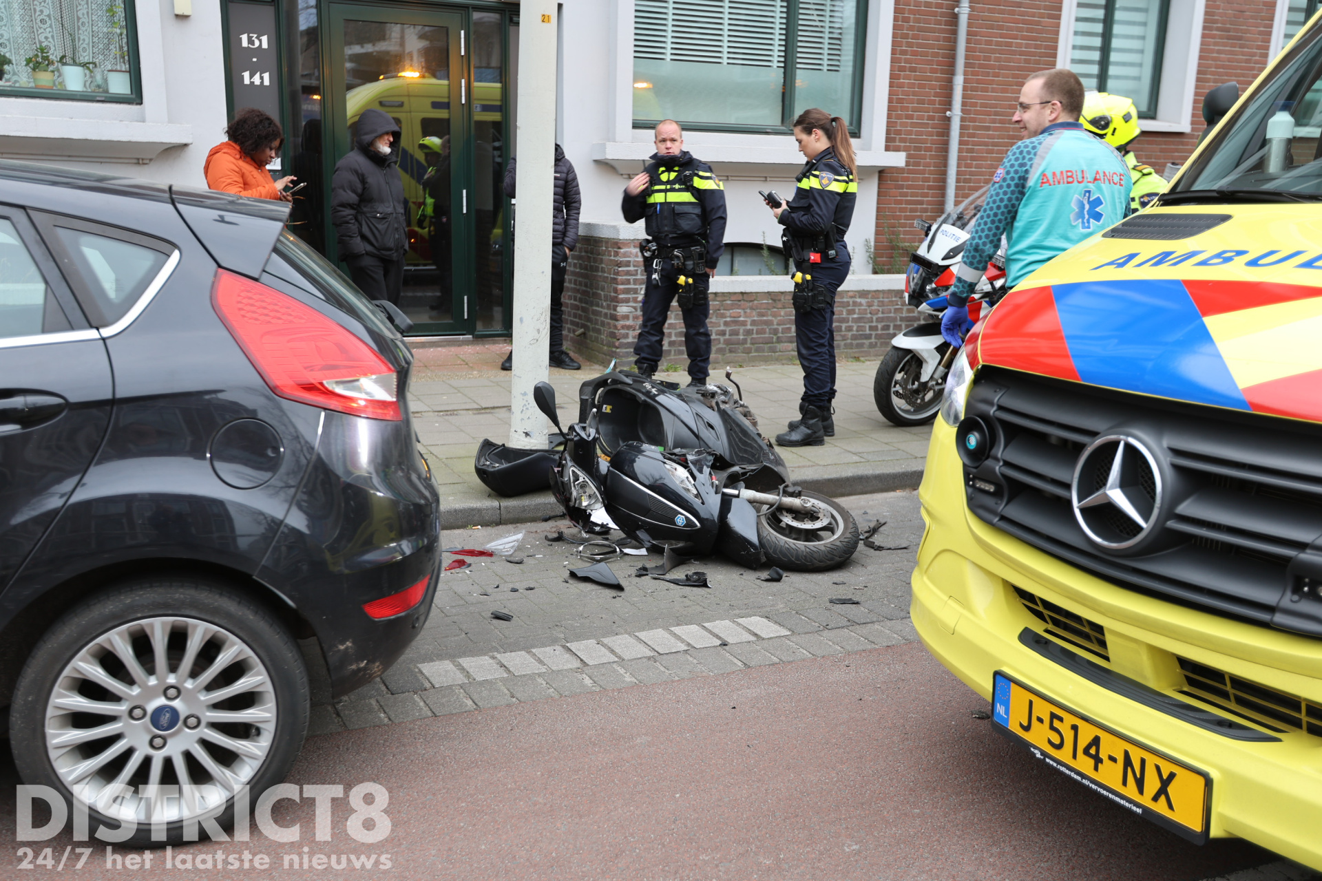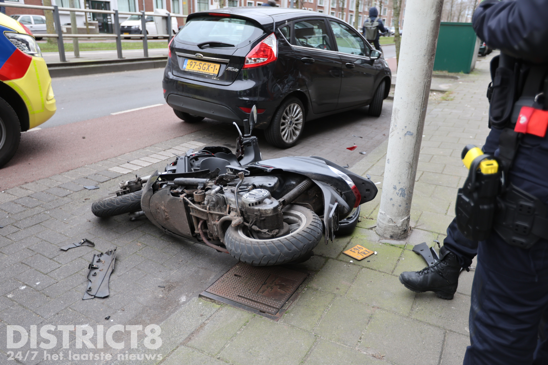 De scooterrijder kwam hard ten val als gevolg van de aanrijding. De scooter en de auto raakten beschadigd. De bestuurder van de scooter raakte gewond en is opgevangen door de ambulancedienst.