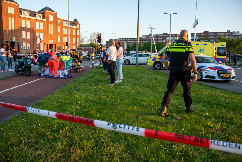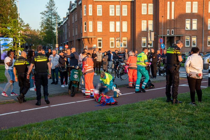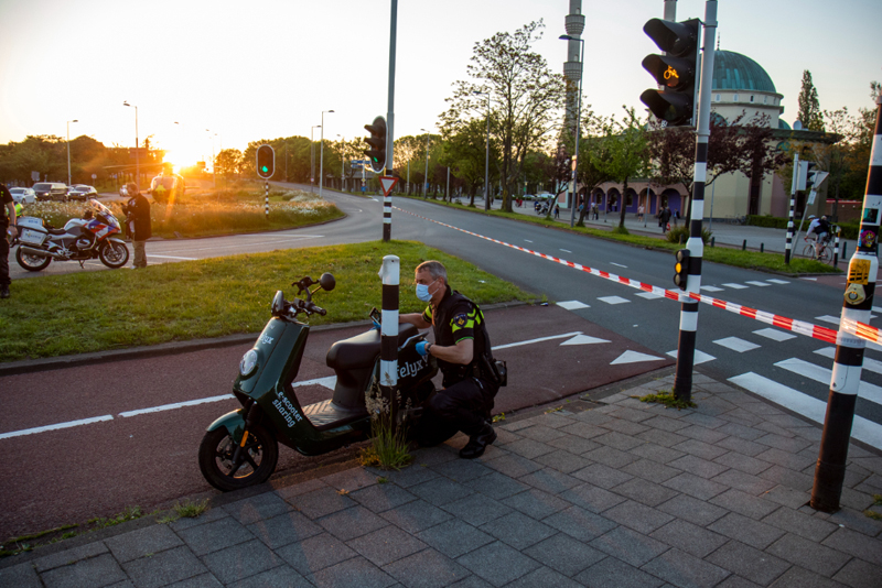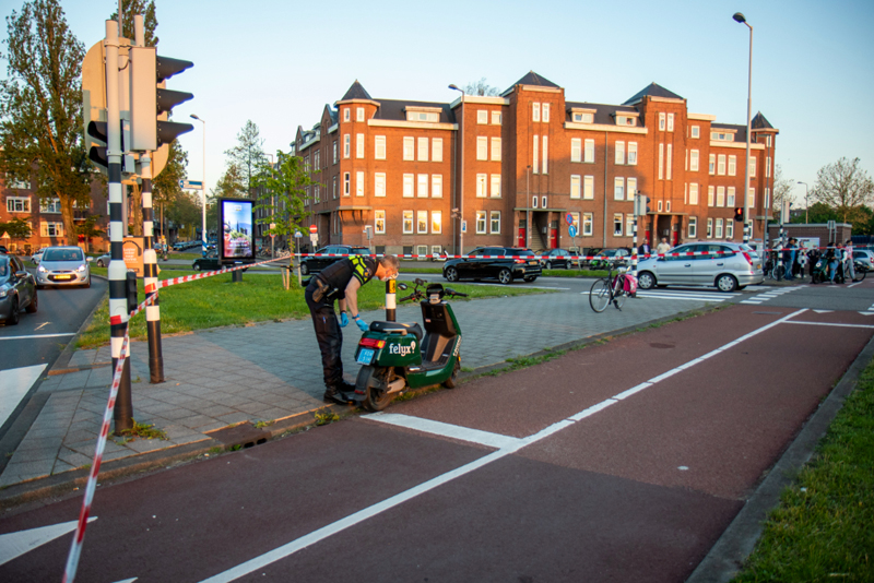 De Felyx huurscooter raakte ook beschadigd door de botsing en de val. De kruising was geruime tijd grotendeels afgesloten voor de hulpverlening.