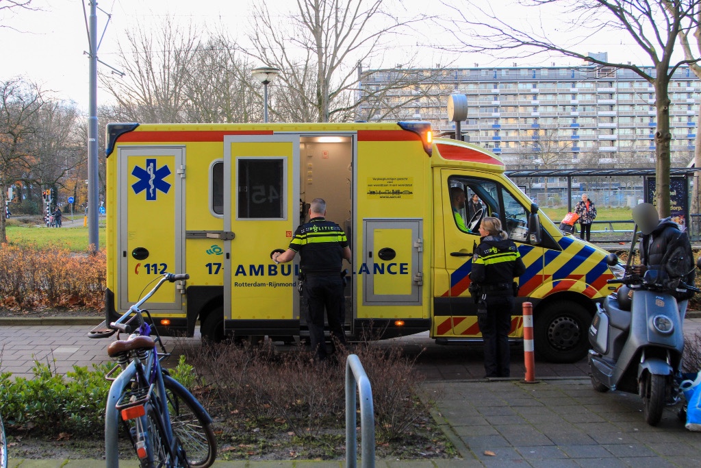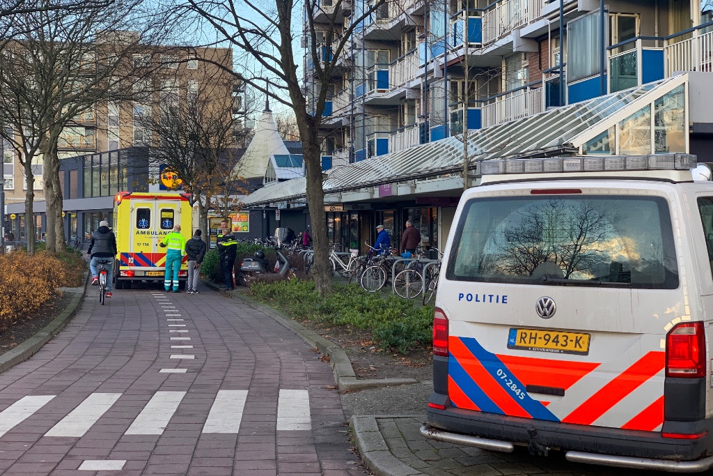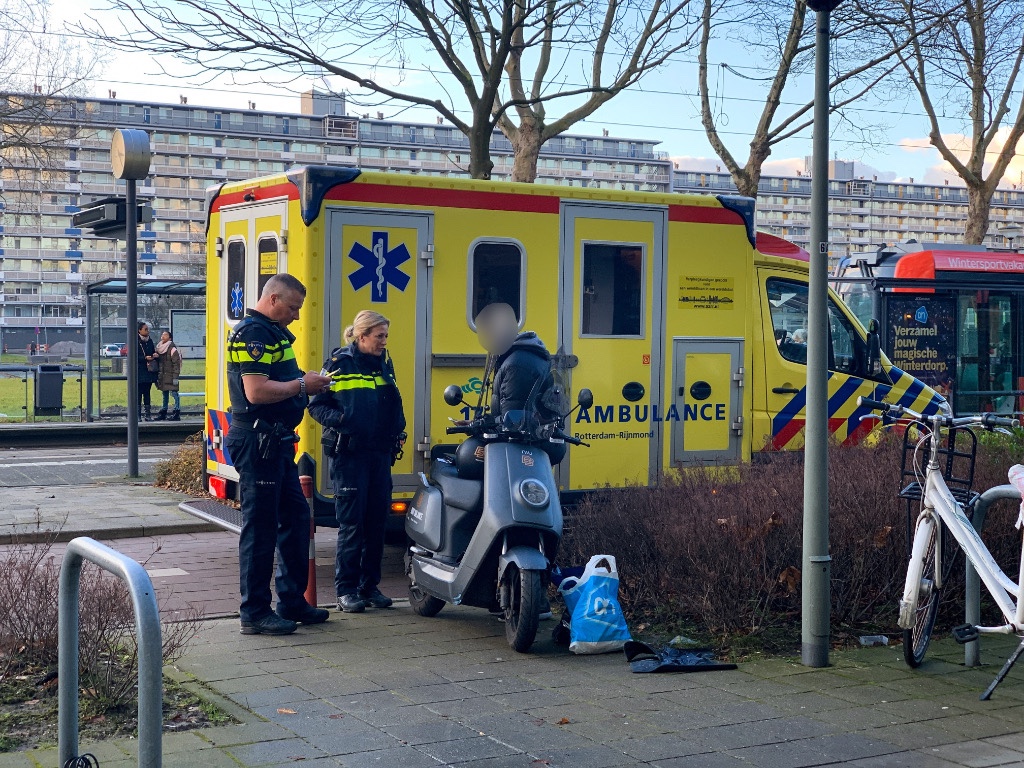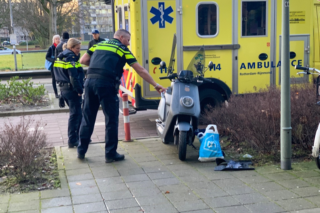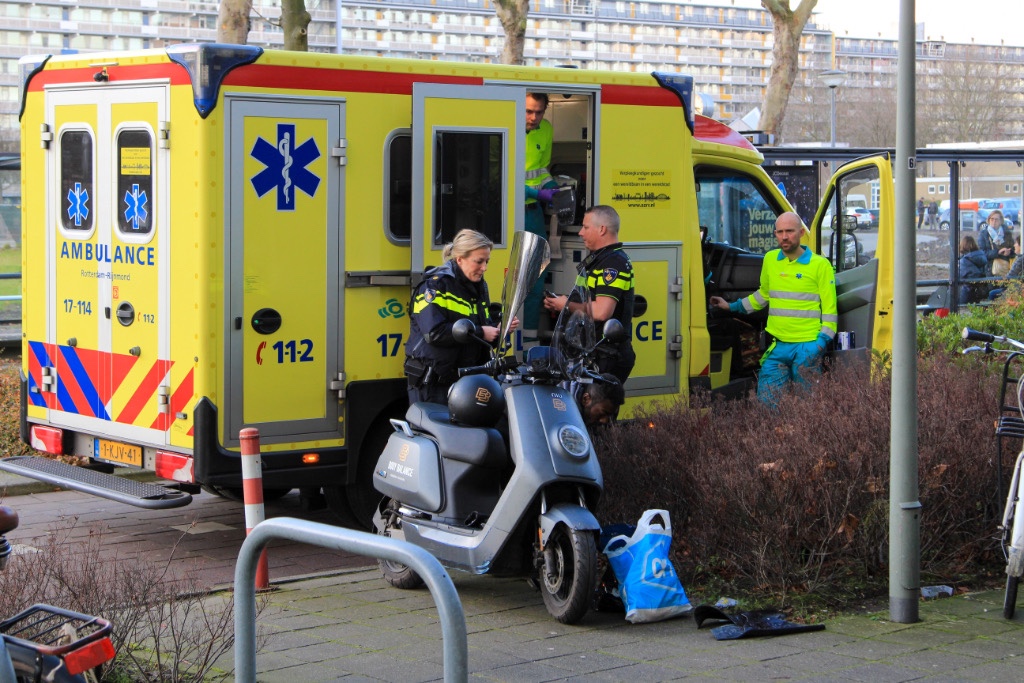 Schiedam – Een ongelukkig voorval bij het Hof van Spaland, zaterdagmiddag toen een scooterrijder in botsing kwam met een voetganger.