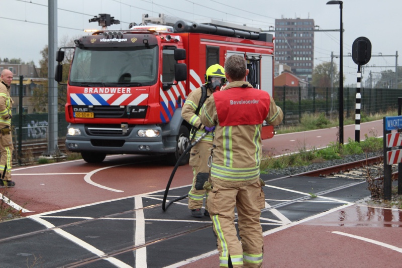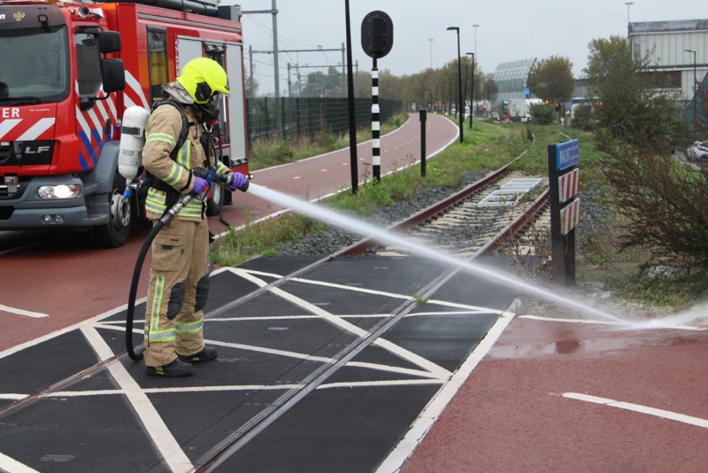 De brandweer is verzocht het wegdek schoon te komen spuiten.