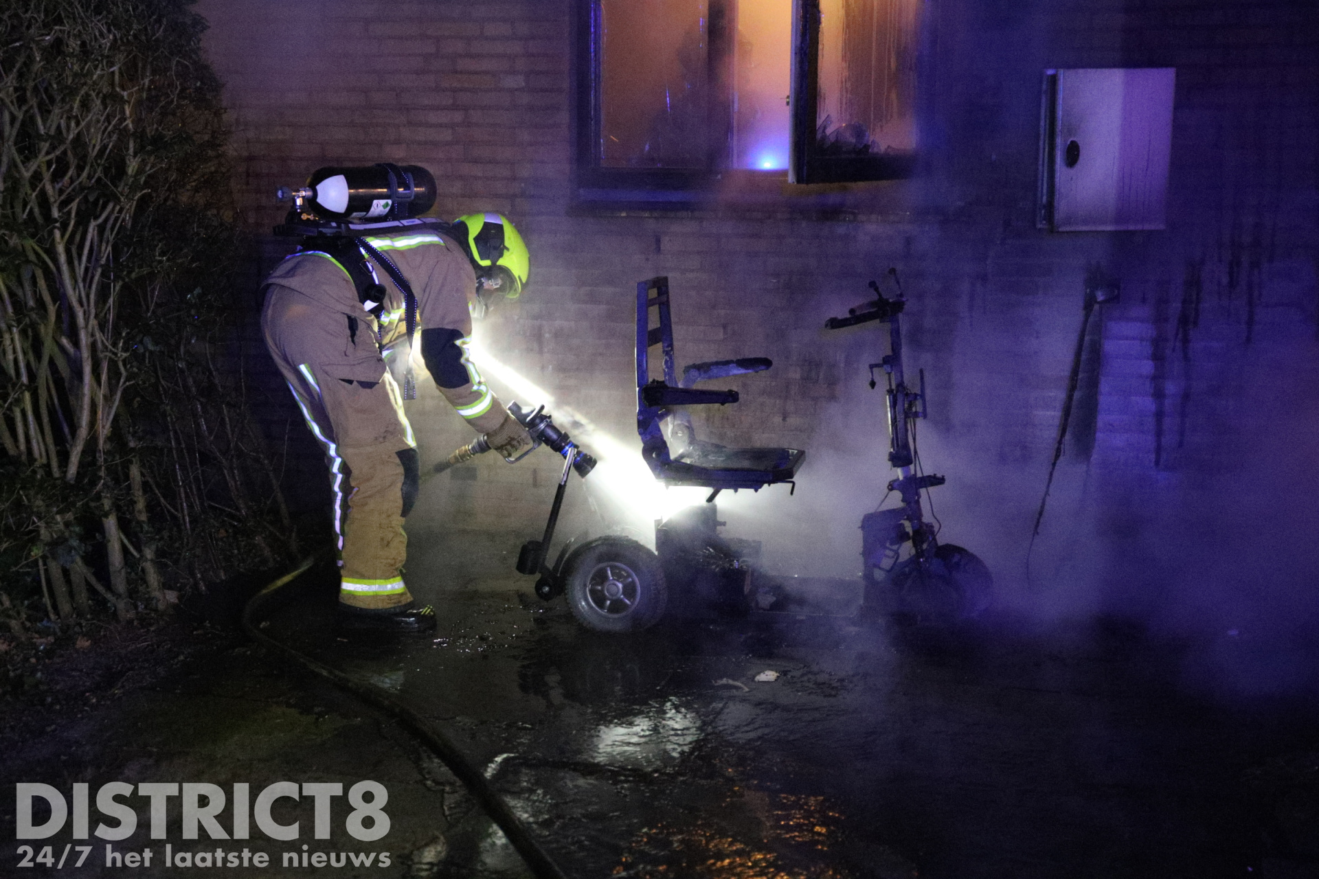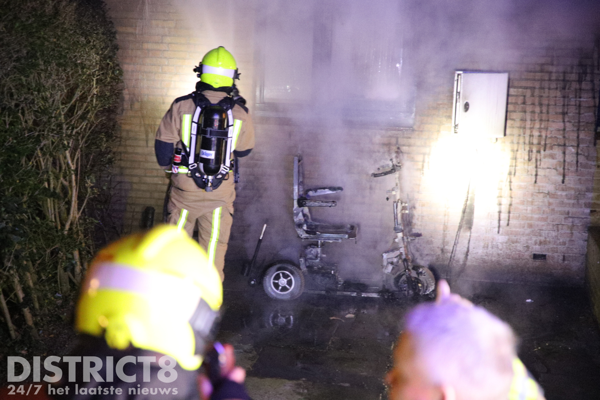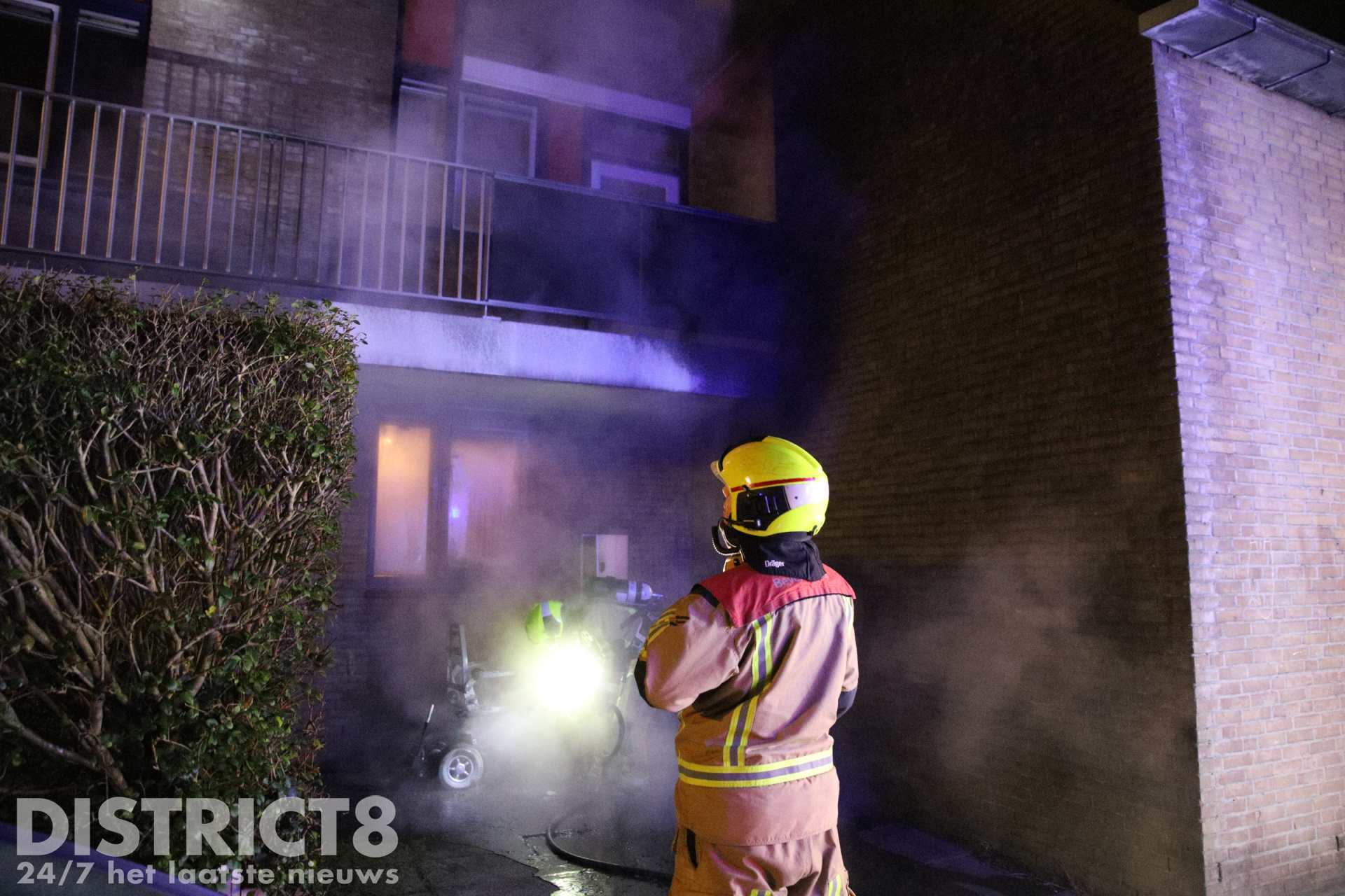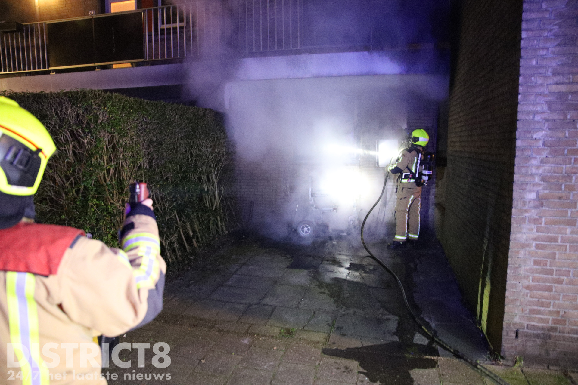 De brandweer kwam met spoed ter plaatse. Bij aankomst sloegen de vlammen van de scootmobiel tegen een raam en het balkon van de woning. Brandweerlieden wisten erger te voorkomen en blusten de brand.