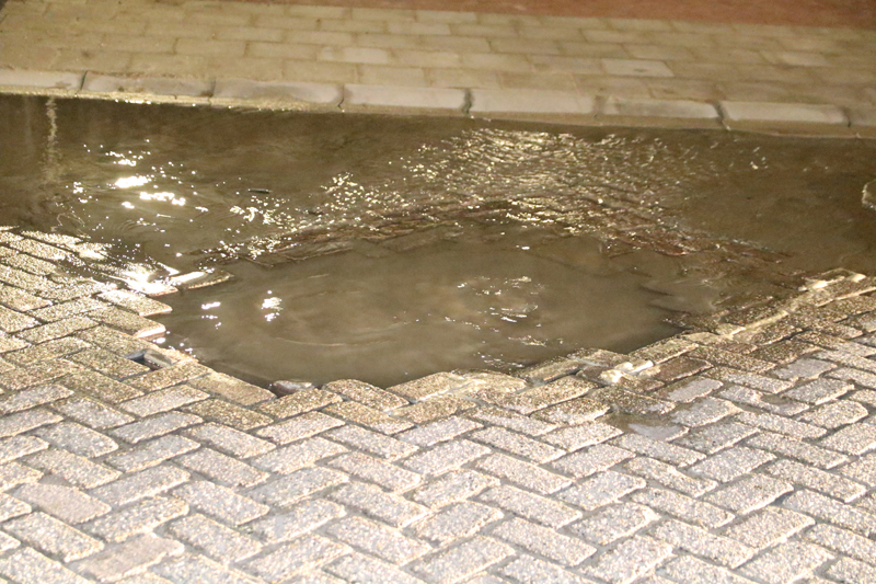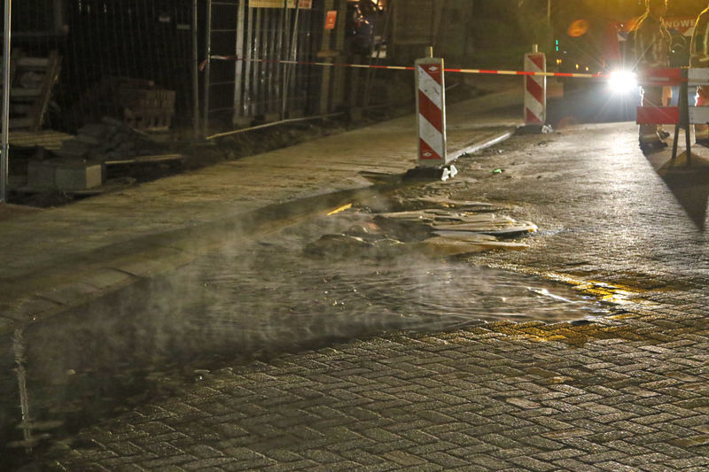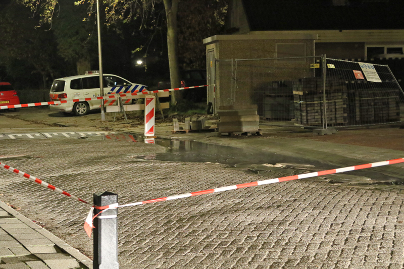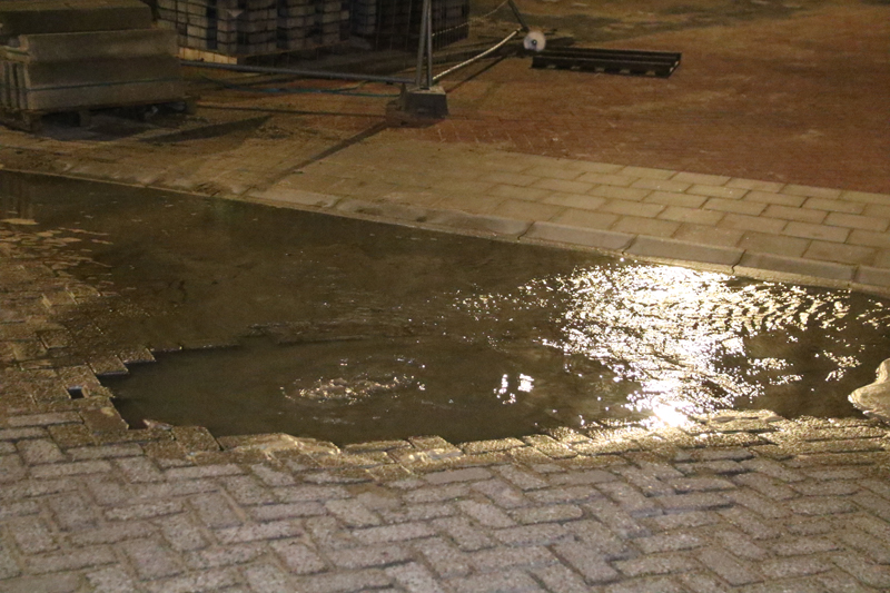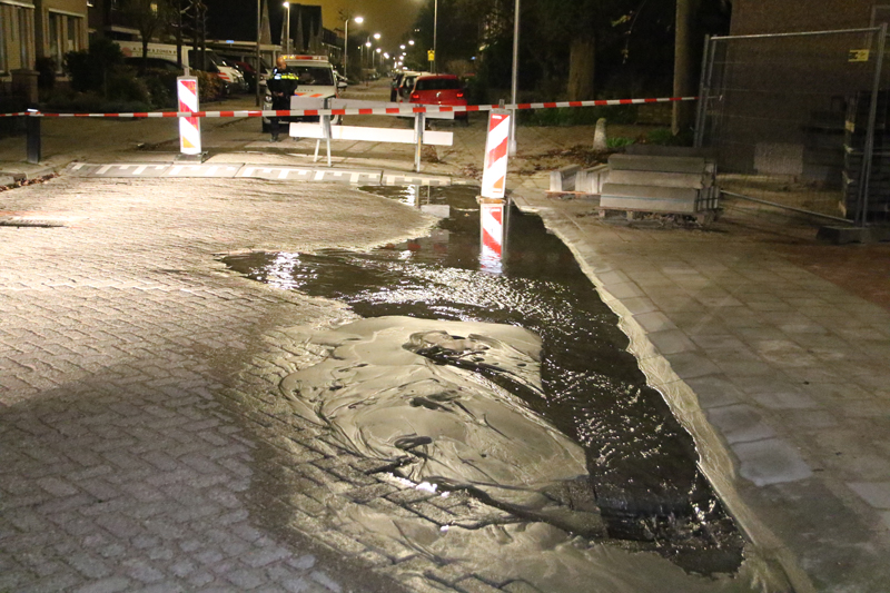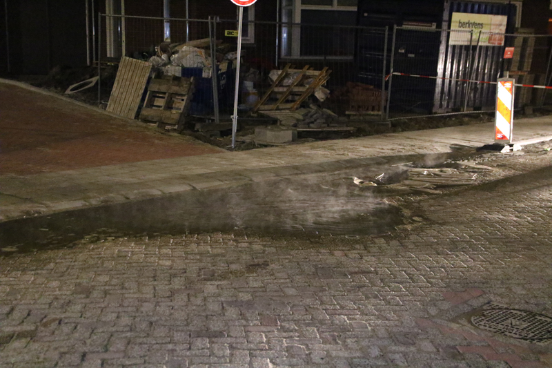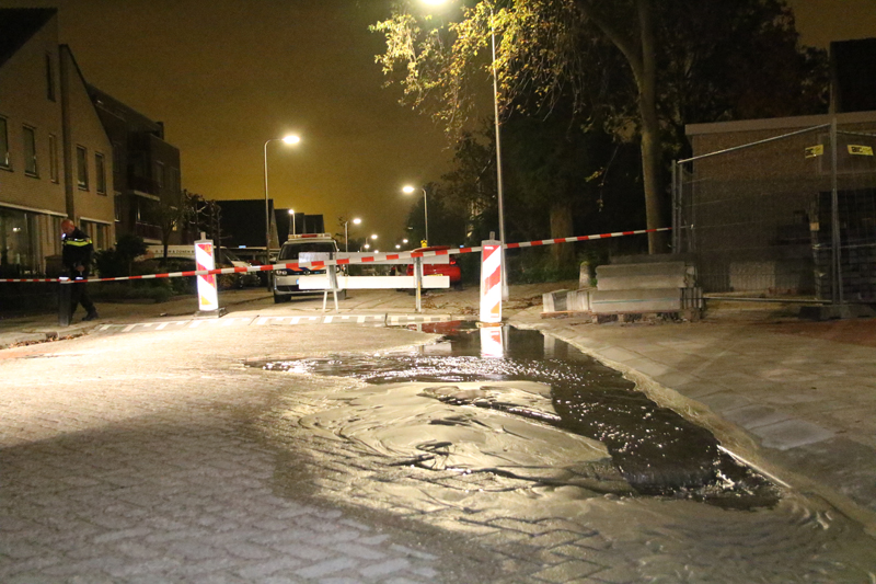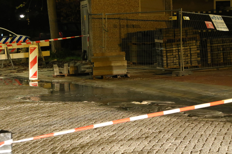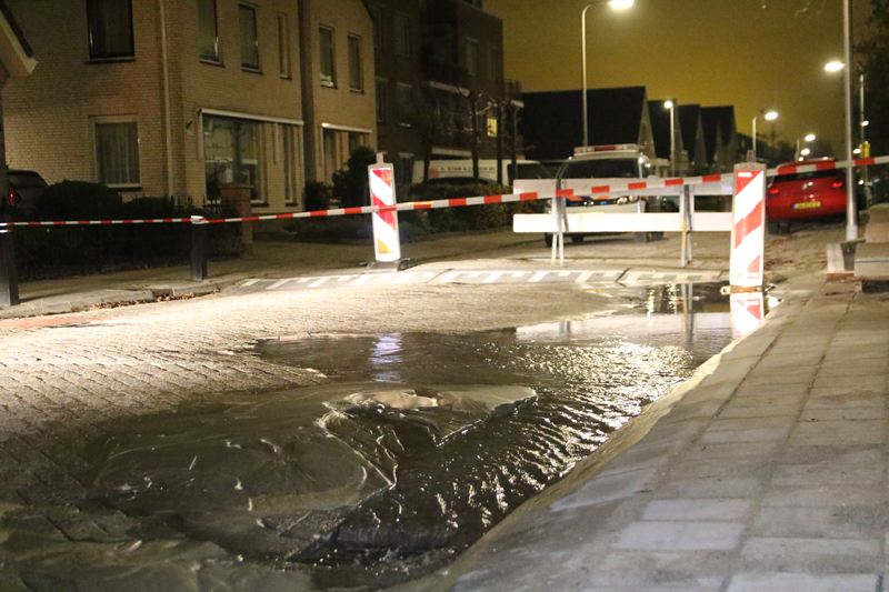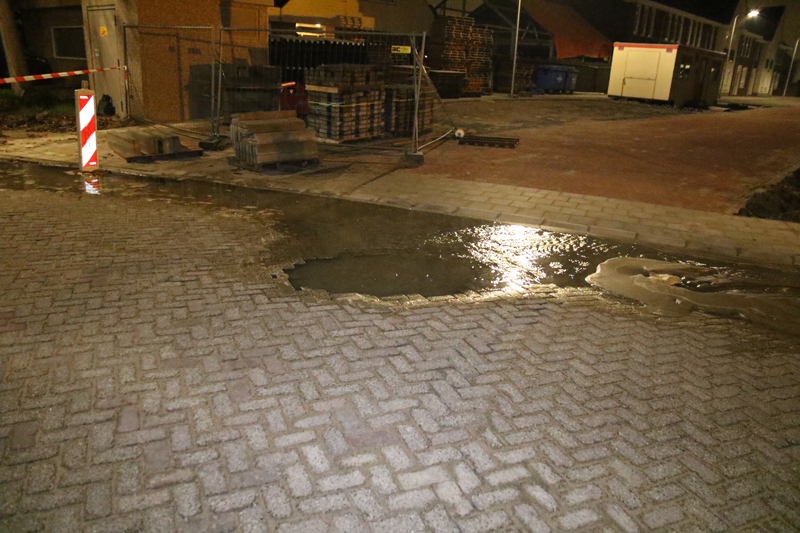 Een bewoner van de Kerklaan hoorde deze nacht een raar geluid in de straat. Toen de bewoner een kijkje ging nemen kwam het geluid uit de punt. Aan de overkant van de straat was inmiddels een deel van de straat onder gelopen.
