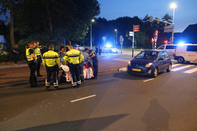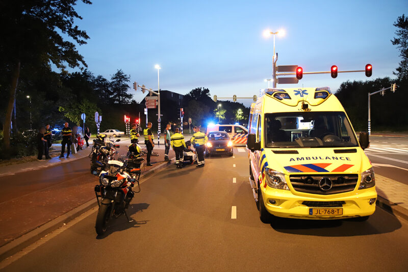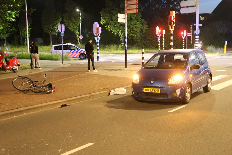 De fietser reed door rood en werd geschept door de personenauto. De fietser kwam ten val en raakte gewond.