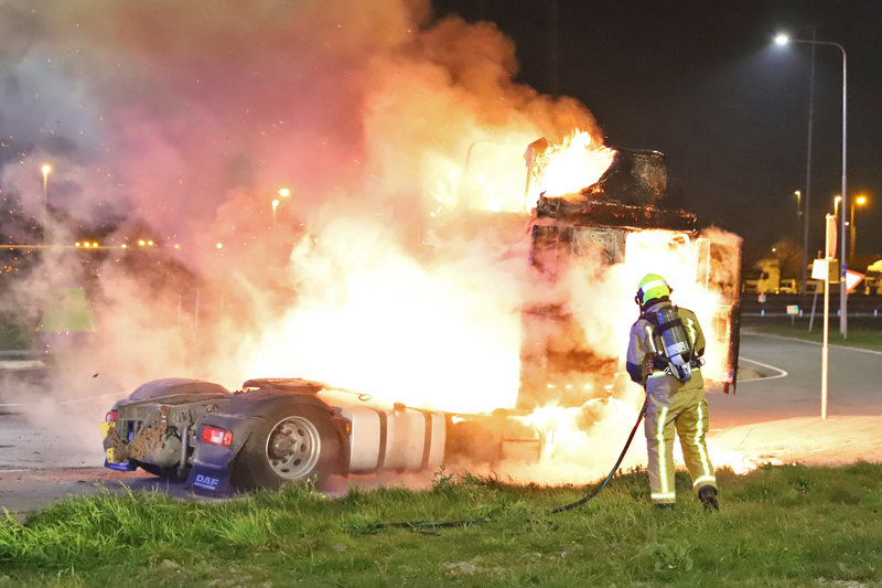 Bij aankomst van de brandweer stond de gehele trekker in brand.