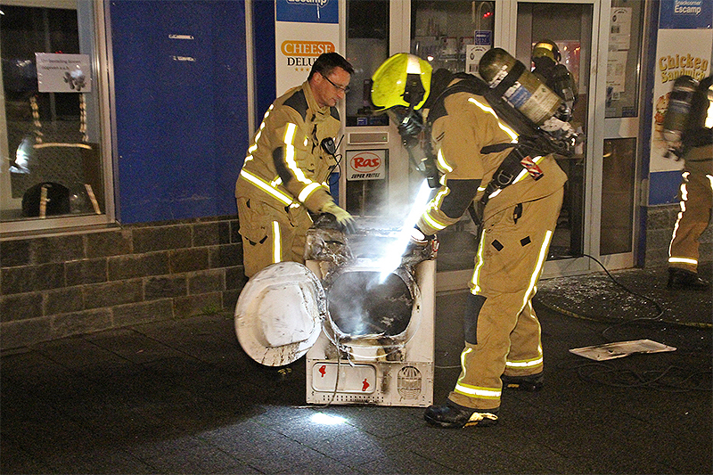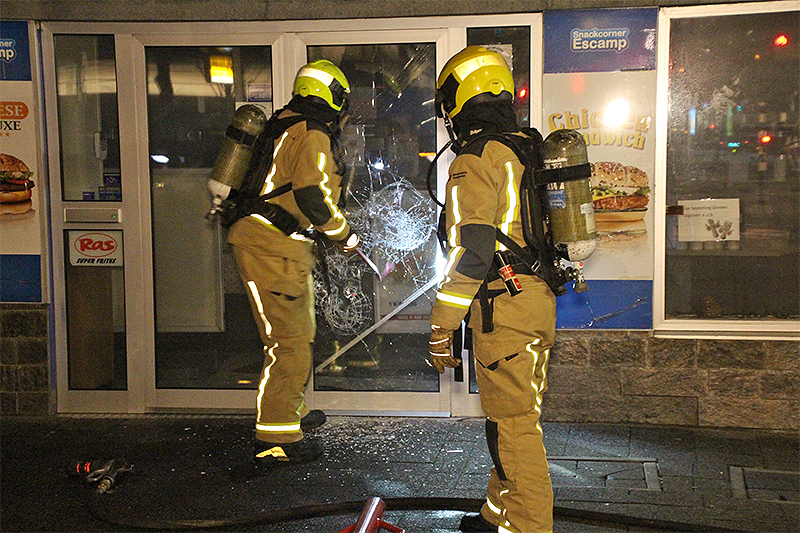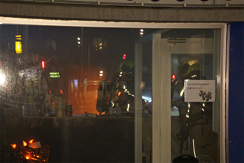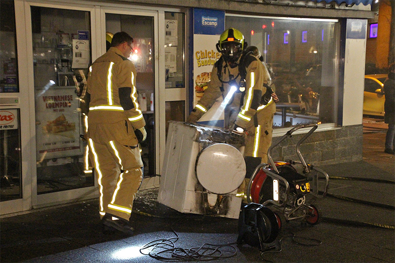 Nadat de brandweer de ruit van de deur geforceerd had, was de brandhaard snel gevonden. Een wasdroger achterin de winkel had vlam gevat.