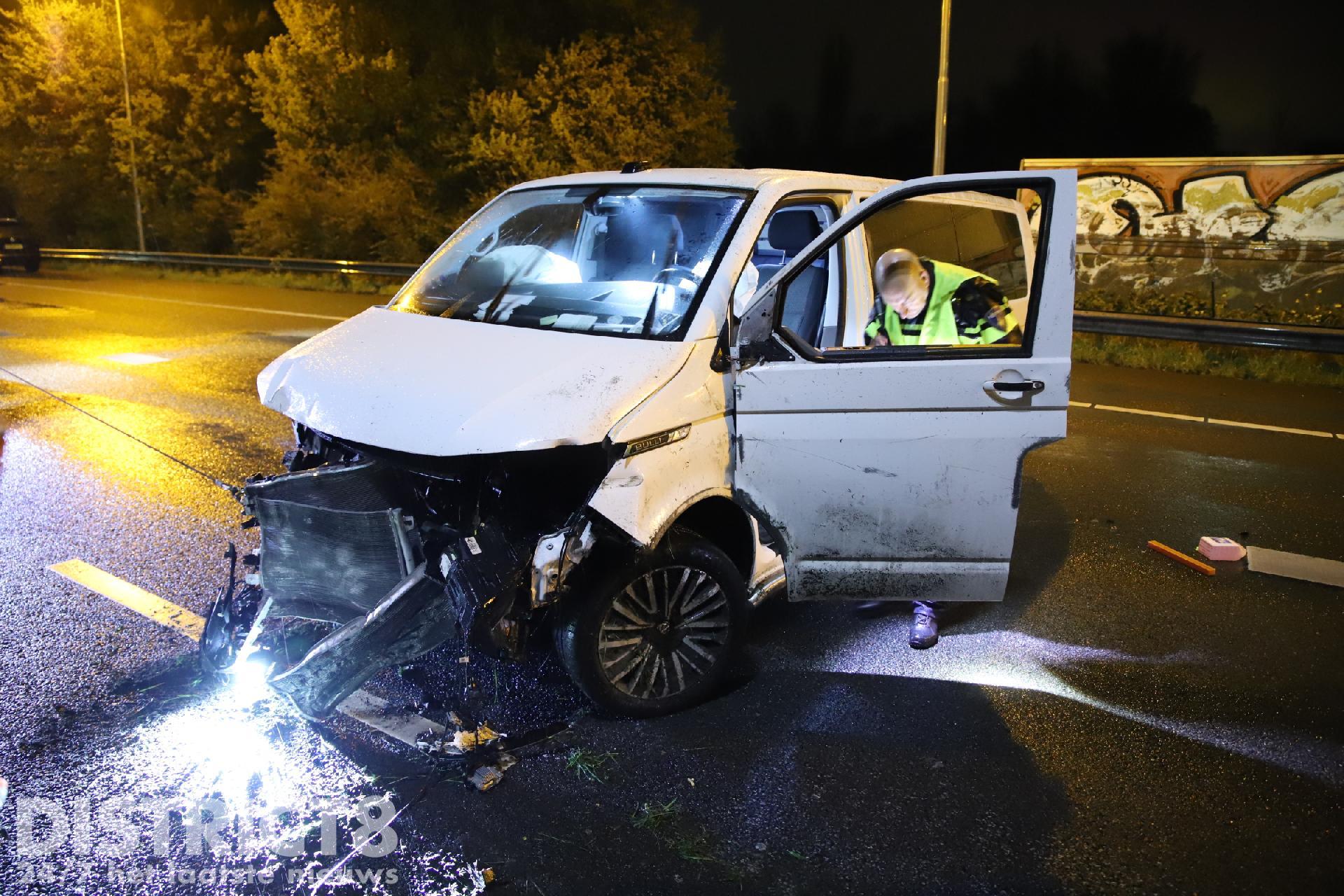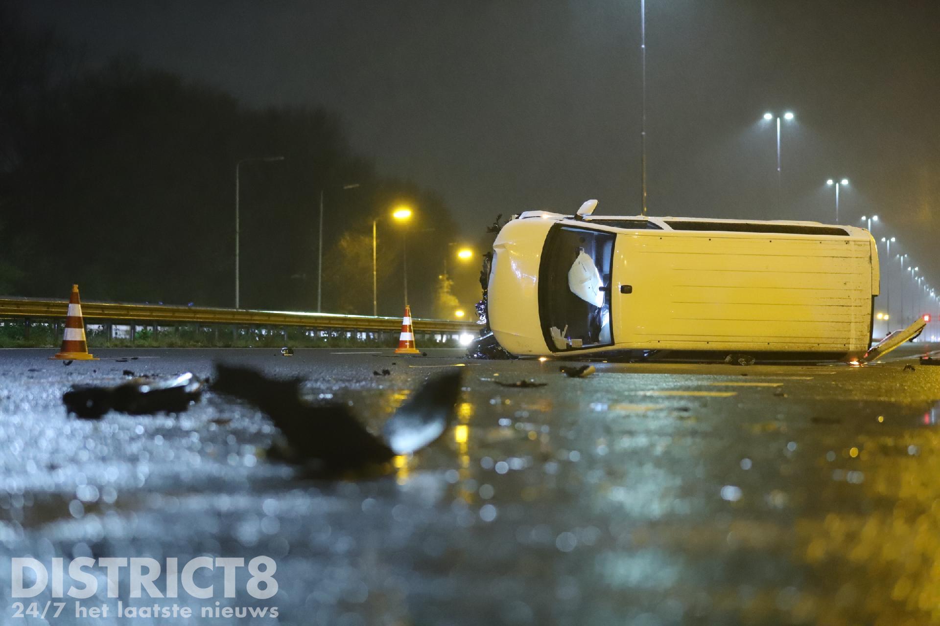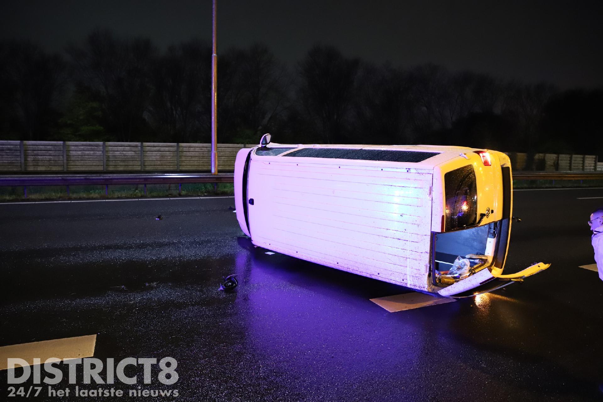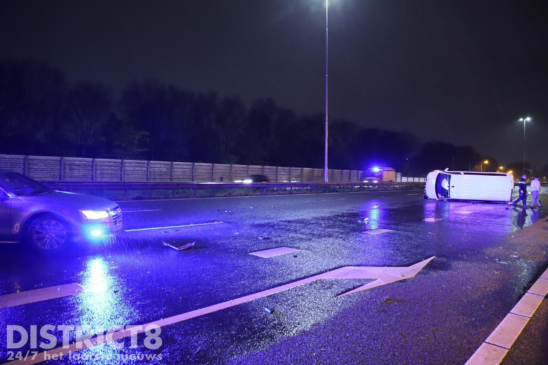 Kort voor middernacht verloor de bestuurder van het busje de macht over het stuur en botste in de geleiderail. Door de klap kwam het busje op zijn zijkant tot stilstand op de snelweg. De ravage is flink en de weg ligt bezaaid met auto-onderdelen.