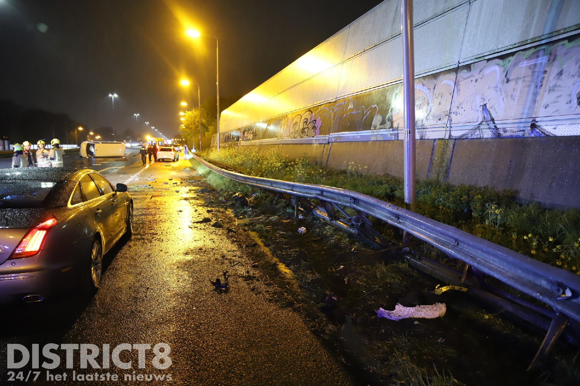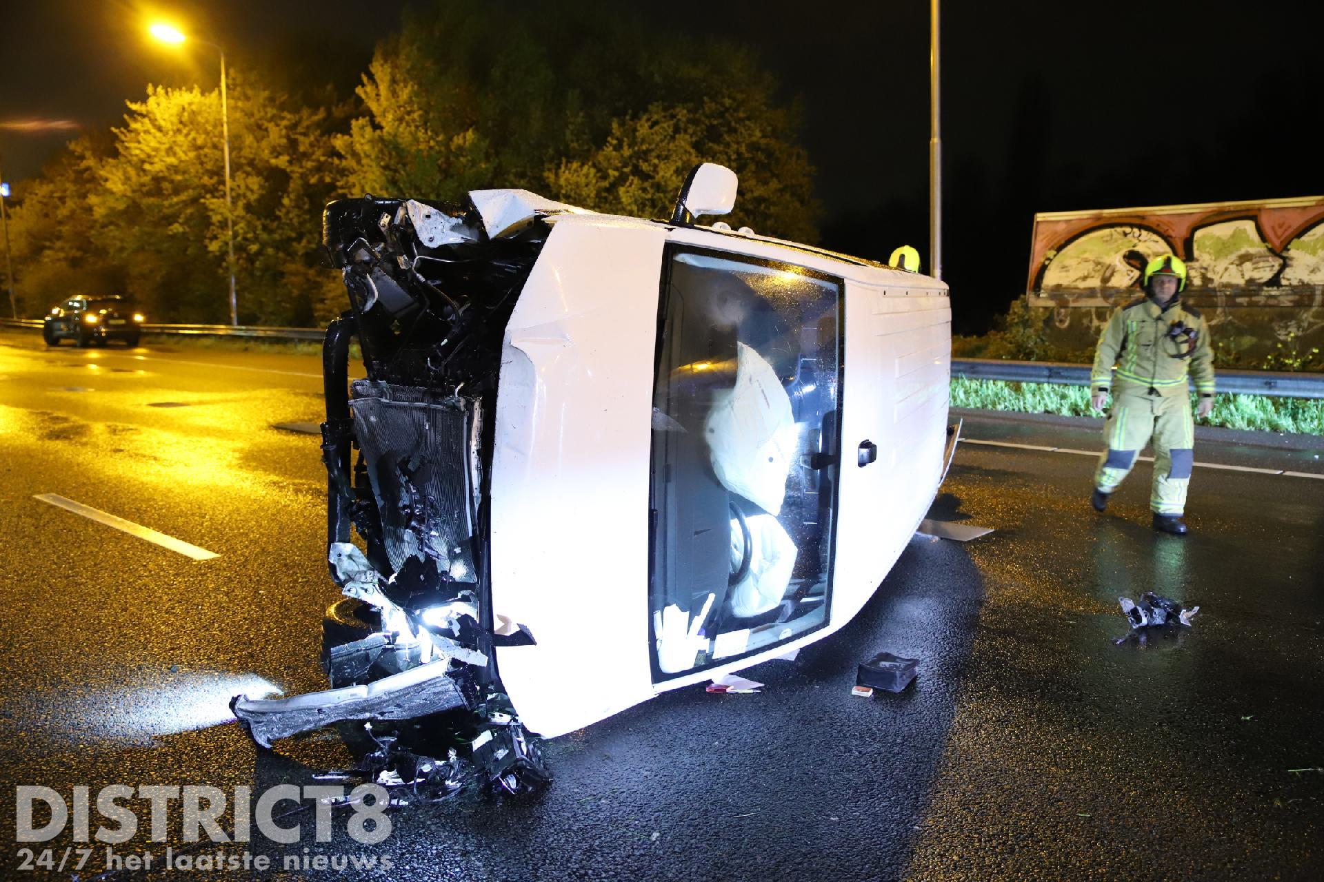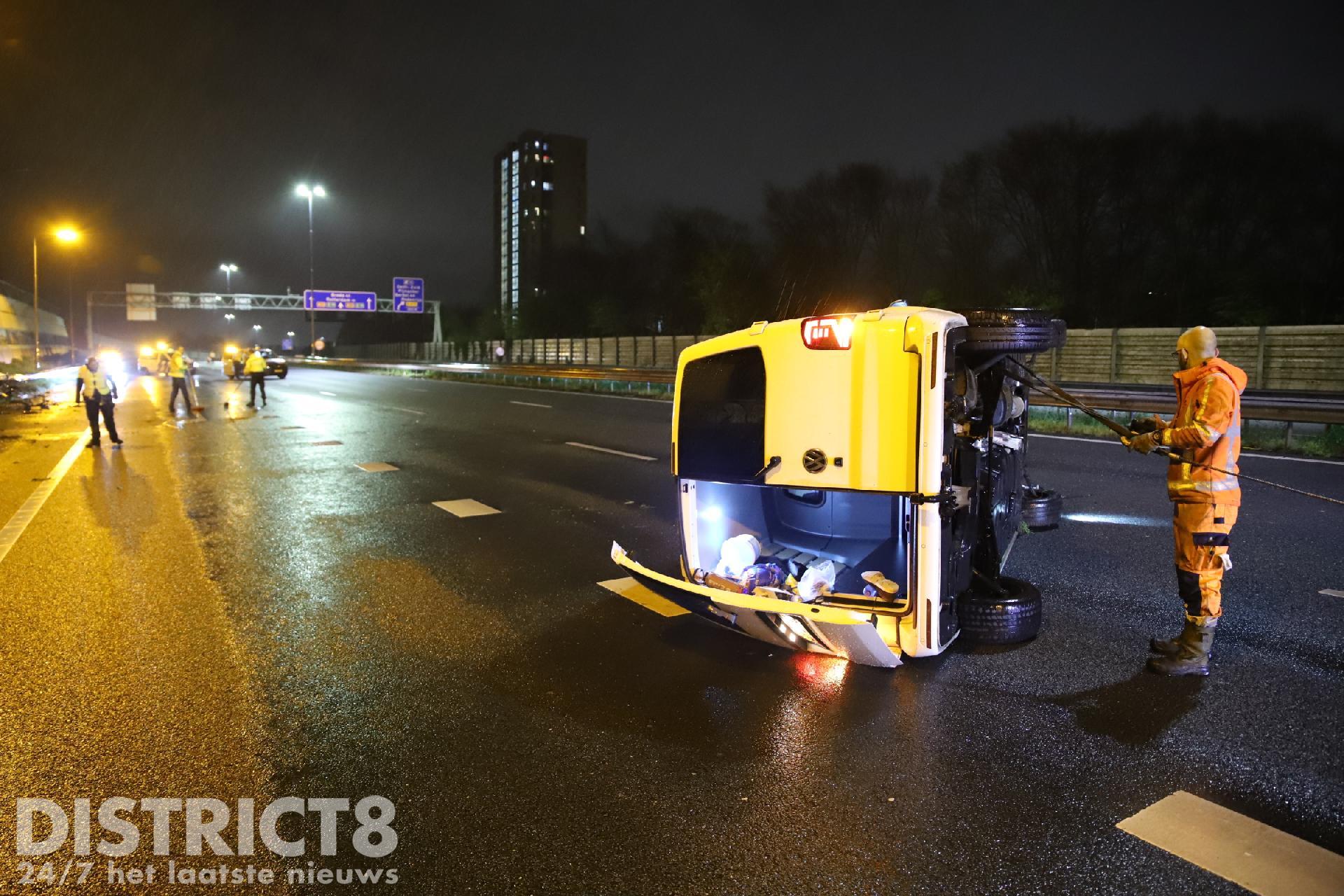 Kort voor middernacht verloor de bestuurder van het busje de macht over het stuur en botste in de geleiderail. Door de klap kwam het busje op zijn zijkant tot stilstand op de snelweg. De ravage is flink en de weg ligt bezaaid met auto-onderdelen.